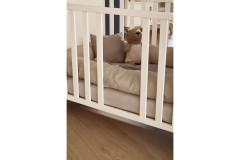 Design trifft Gemütlichkeit - das ist das Motto des Kinderzimmerprogramms Stiene von Paidi. Hier schmücken sich cashmere-beige-farbene Oberflächen mit verschiedenen Elementen aus massivem Eichenholz. Unser Babyzimmer-Angebot enthält den Schiebetürenschrank, das Sprossen-Babybett und die Schubkastenkommode mit abnehmbarem Wickelaufsatz. Der etwa 164 cm breite und ungefähr 200 cm hohe Kleiderschrank verfügt über zwei platzsparend öffnende Schiebetüren und einen mittig geteilten Schubkasten. Der Innenraum ist übersichtlich strukturiert und bietet Ihnen neben den insgesamt sieben Fachböden auch zwei Kleiderstangen zur Aufbewahrung von zusammengelegten und auf Bügeln hängenden Textilien zur Verfügung. In der Schublade ist Platz für kleine Kleidungsstücke wie beispielsweise Mützen, Handschuhe, Schals und Lätzchen. Das Gitterbett hat eine Liegefläche von 70 x 140 cm und stellt eine sichere Schlafumgebung für Ihr Kind dar. Ein 4-fach höhenverstellbarer Lattenrost ist bereits Teil des Lieferumfangs - eine passende Babybettmatratze finden Sie bei uns im Shop. Der etwa 92 cm hohe Schubladenschrank mit seinen zwei Fächern und dem abnehmbaren Aufsatzelement bildet die Wickelkommode, die Ihnen jederzeit einen praktischen Platz für den Windelwechsel sowie zum An- und Ausziehen zur Verfügung stellt. Optional erhalten Sie direkt hier im Artikel zusätzliche Ausstattungen für den Schrank, das Bett sowie die Wickelkommode und auch die Zubuchung des Standregals ist Ihnen über die Zusatzattribute möglich. Falls Sie platzbedingt andere Vorstellungen von der Babyzimmer-Einrichtung haben, können Sie mit unserem Möbelplaner Ihre eigene Kombination der Modellreihe Stiene von Paidi konfigurieren und direkt online kaufen.