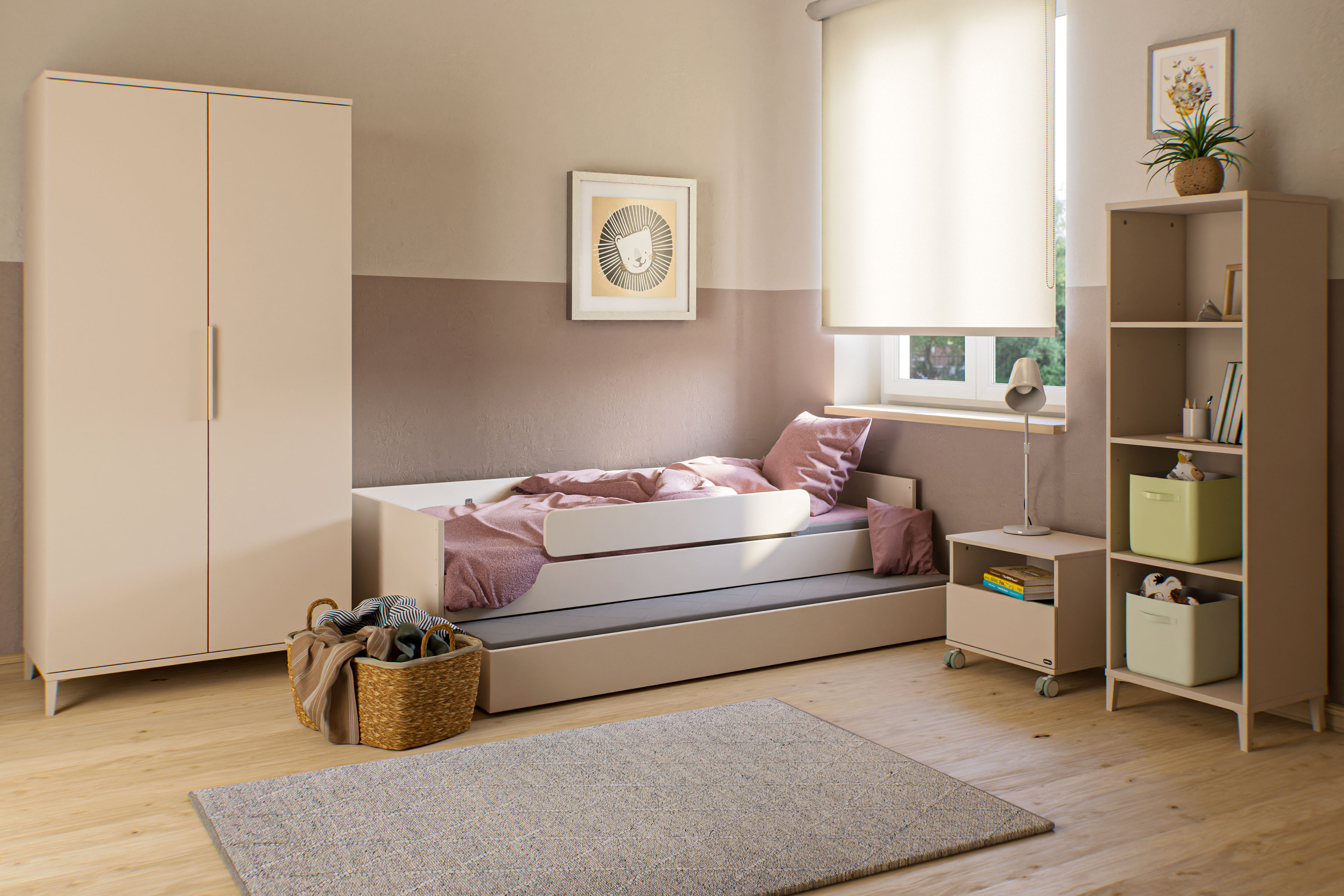 Kinderzimmer von YUNY by Paidi - Modell Sister Lou - Kleiderschrank 2-türig & Kojenliege mit Bettkasten oder Gästebett aus der Kollektion YUNY by Paidi Sister Lou - Geborgenheit pur mit den Baby- und Kindermöbeln in der Trendfarbe Cashmere-Beige