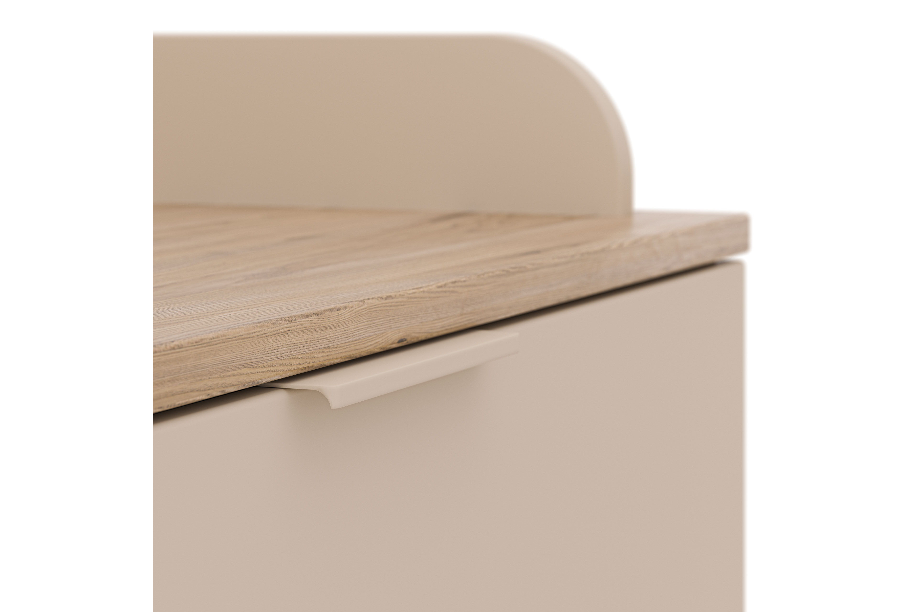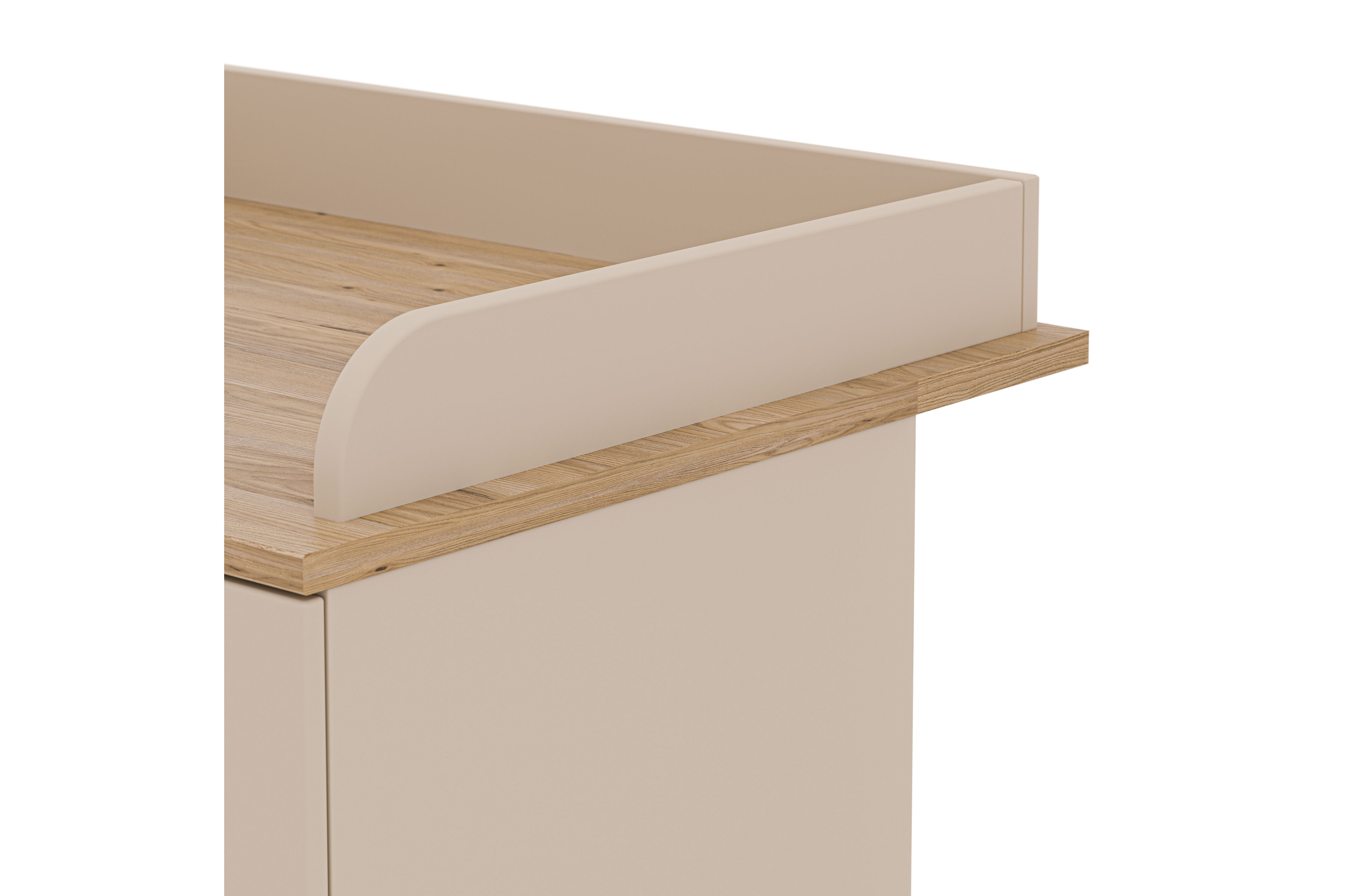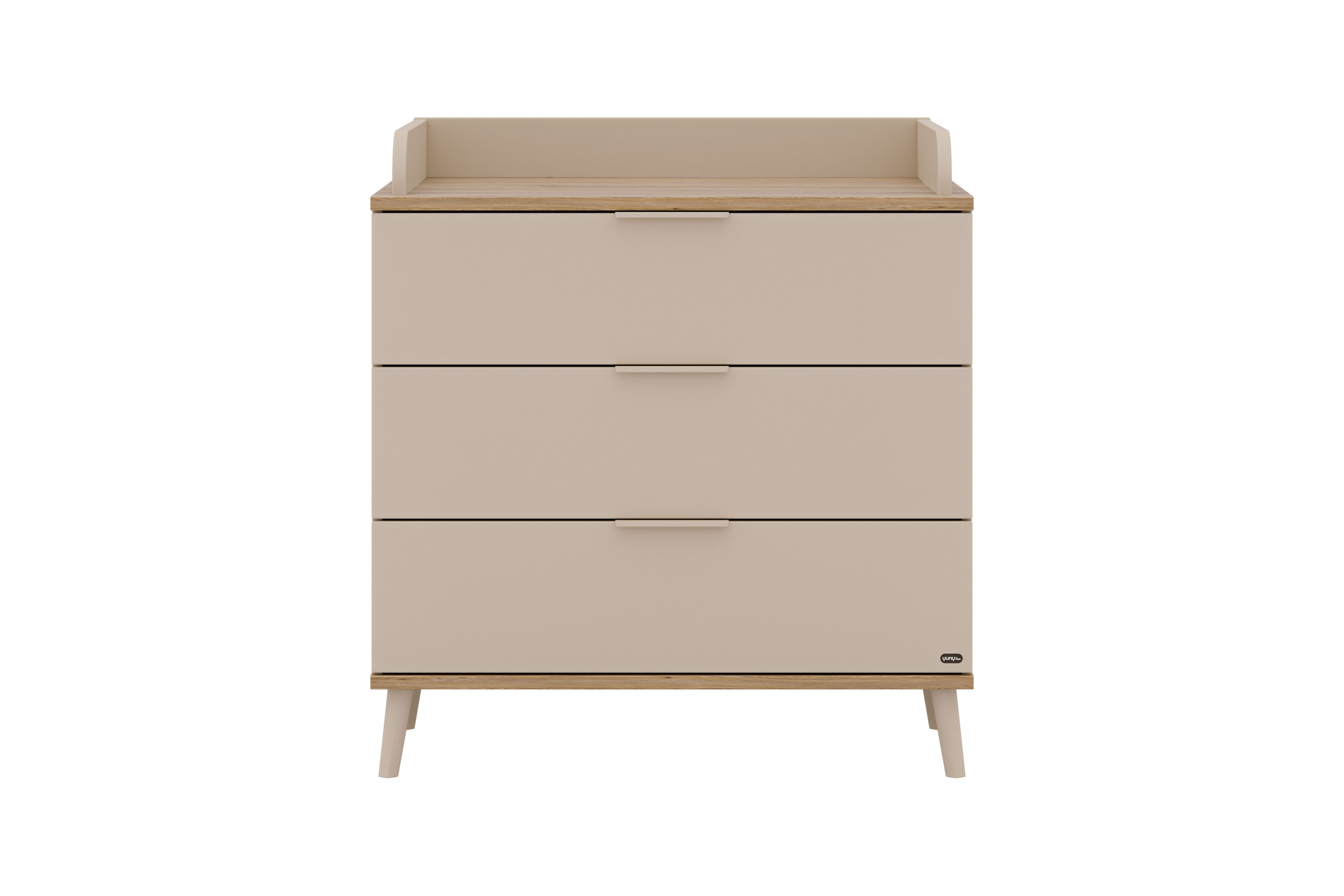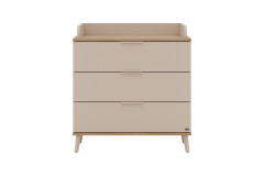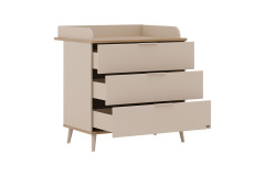 Die Wickelkommode des Programms Hazel aus der YUNY by Paidi Kollektion vereint skandinavische Gemütlichkeit mit durchdachter Alltagstauglichkeit - ideal für eine hyggelige Kinderzimmer-Einrichtung. Der Korpus und die Front sind mit cashmere-beigem Lack farbig veredelt und strahlen Ruhe aus, während die Absetzungen aus Eiche-Montana-Holznachbildung Ober- und Unterboden optisch akzentuieren und eine natürlich warme Optik schaffen. Die Kommode ist mit drei geräumigen Schubfächern ausgestattet und bietet ausreichend Stauraum für Windeln, Kleidung und Pflegeutensilien. Dank der integrierten Softclose-Funktion schließen alle drei Schubkästen besonders sanft, leise und möbelschonend. Die schräg gestellten Möbelfüße unterstreichen das skandinavische Design und verleihen der Kommode Leichtigkeit. Die Wickelfläche misst etwa 84,2 x 67,7 cm und zudem ist der Wickelaufsatz abnehmbar - so wächst die Kommode praktisch mit Ihrem Kind mit. Alle modelleigenen Möbelstücke der Serie Hazel können über unseren Konfigurator frei gewählt und individuell miteinander kombiniert werden, sodass Sie das Kinderzimmer nach Ihren Wünschen gestalten können. Hazel aus der YUNY by Paidi Kollektion: Ein Stück skandinavische Ästhetik, das Stil, Komfort und Funktion perfekt verbindet.
