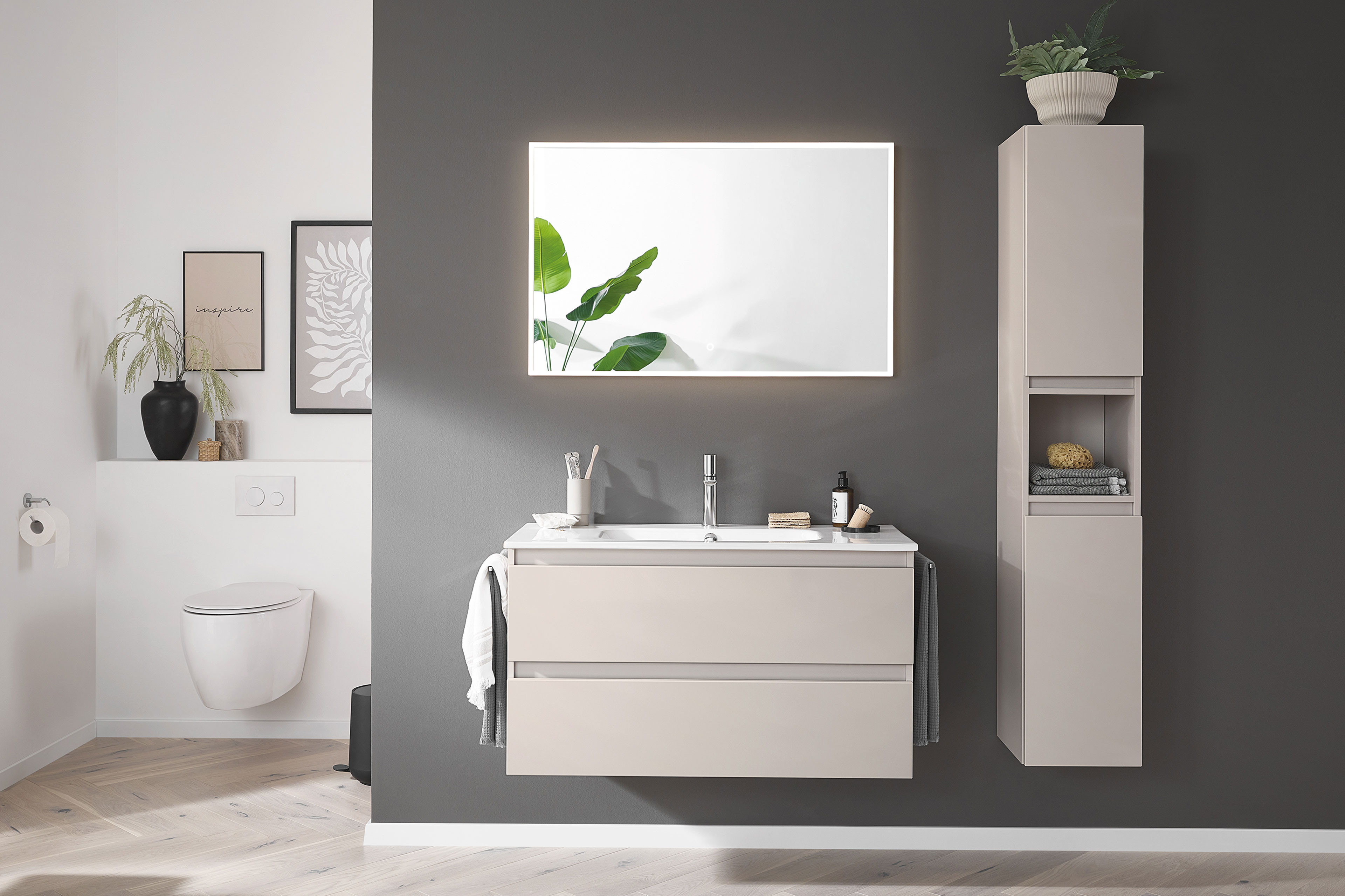 Bestellen Sie sich einen Rückzugsort in zeitloser Schönheit mit dem Badezimmer-Set Cuba von puris in Kaschmir matt. Die Kombination aus durchdachter Funktionalität und der klaren Linienführung schafft ein Ambiente, das Ruhe und Wertigkeit ausstrahlt. Der Waschtischunterschrank mit seinen zwei großen und leichtgängigen Schubkästen bietet Ihnen komfortablen Stauraum für alle wichtigen Badutensilien und sorgt für eine aufgeräumte Optik. Das grifflose Design unterstreicht das glanzvolle Badezimmer-Set und fügt sich harmonisch in zeitgemäße Badkonzepte ein. Der Waschtisch aus Keramik überzeugt durch seine pflegeleichte, langlebige Oberfläche und sorgt für eine angenehme Nutzung im Alltag. Erweitern Sie Ihr Bad um einen eleganten Flächenspiegel mit umlaufendem LED-Acrylrahmen. Die indirekte Beleuchtung sorgt für eine angenehme Lichtatmosphäre und setzt stilvolle Akzente. Die Lichtfarbe ist in drei Stufen einstellbar, sodass Sie je nach Tageszeit oder Stimmung zwischen unterschiedlichen Lichtnuancen wählen können. Optional sorgt eine integrierte Spiegelheizung dafür, dass die Spiegelfläche auch nach dem Duschen beschlagfrei bleibt. Für noch mehr Ordnung können Sie das Set um einen passenden Hochschrank ergänzen. Hinter den zwei Türen befindet sich jeweils ein Glasfachboden, der für eine übersichtliche Aufteilung sorgt. Ein zusätzliches offenes Fach bietet Platz für dekorative Elemente oder häufig genutzte Accessoires und lockert das Gesamtbild optisch auf. Dieses Badmöbel-Set Cuba von puris verbindet Design, Komfort und Funktionalität auf stilvolle Weise – für ein Badezimmer, in dem Sie sich jeden Tag aufs Neue wohlfühlen.