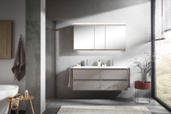 Schlicht und doch mit ganz viel Eleganz überzeugt Sie hier der Waschtischunterschrank b·solid von dem Hersteller Puris. Der Waschtischunterschrank in edlem Titangrau bietet mit vier großzügigen Schubladen reichlich Stauraum für Handtücher, Pflegeprodukte und Badaccessoires. Mit dem Kosmetikeinsatz behalten Sie stets den Überblick über kleinere Utensilien wie Make-up oder Schmuck. Das passende Doppelaufsatzwaschbecken aus hochwertigem Solid Surface in strahlendem Weiß überzeugt nicht nur durch seine pflegeleichte Oberfläche, sondern bietet auch genügend Platz für die ganze Familie und setzt einen modernen Kontrast zur dunklen Front. Optional ergänzt ein passender Spiegelschrank mit LED-Flächenleuchte das Gesamtbild. Der Schrank ist mit drei Doppelspiegeltüren ausgestattet und bietet hinter diesen sechs Glasfachböden für zusätzlichen Stauraum. Die integrierte LED-Beleuchtung sorgt für ein angenehmes, gleichmäßiges Licht – ideal für Ihre tägliche Pflege. Überzeugen Sie sich selbst von diesem beeindruckenden Badezimmer der b·solid Reihe von Puris und bestellen Sie noch heute.