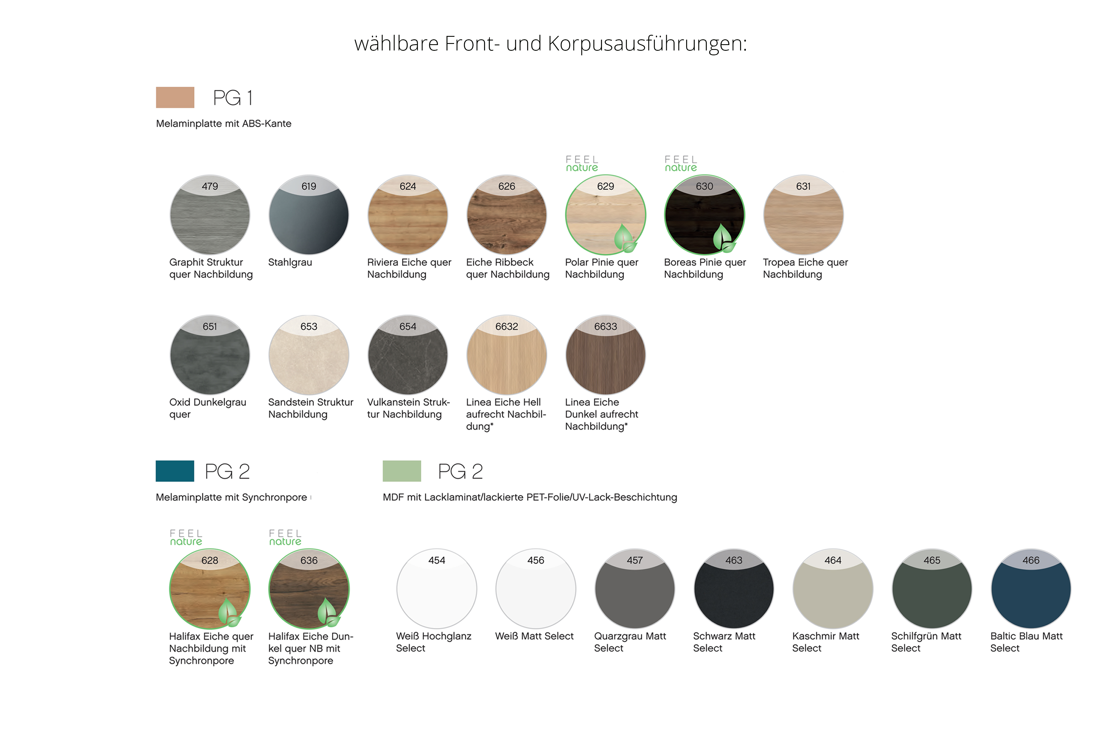 - Front: Schilfgrün matt, lackierte PET-Folie mit ABS-Kante