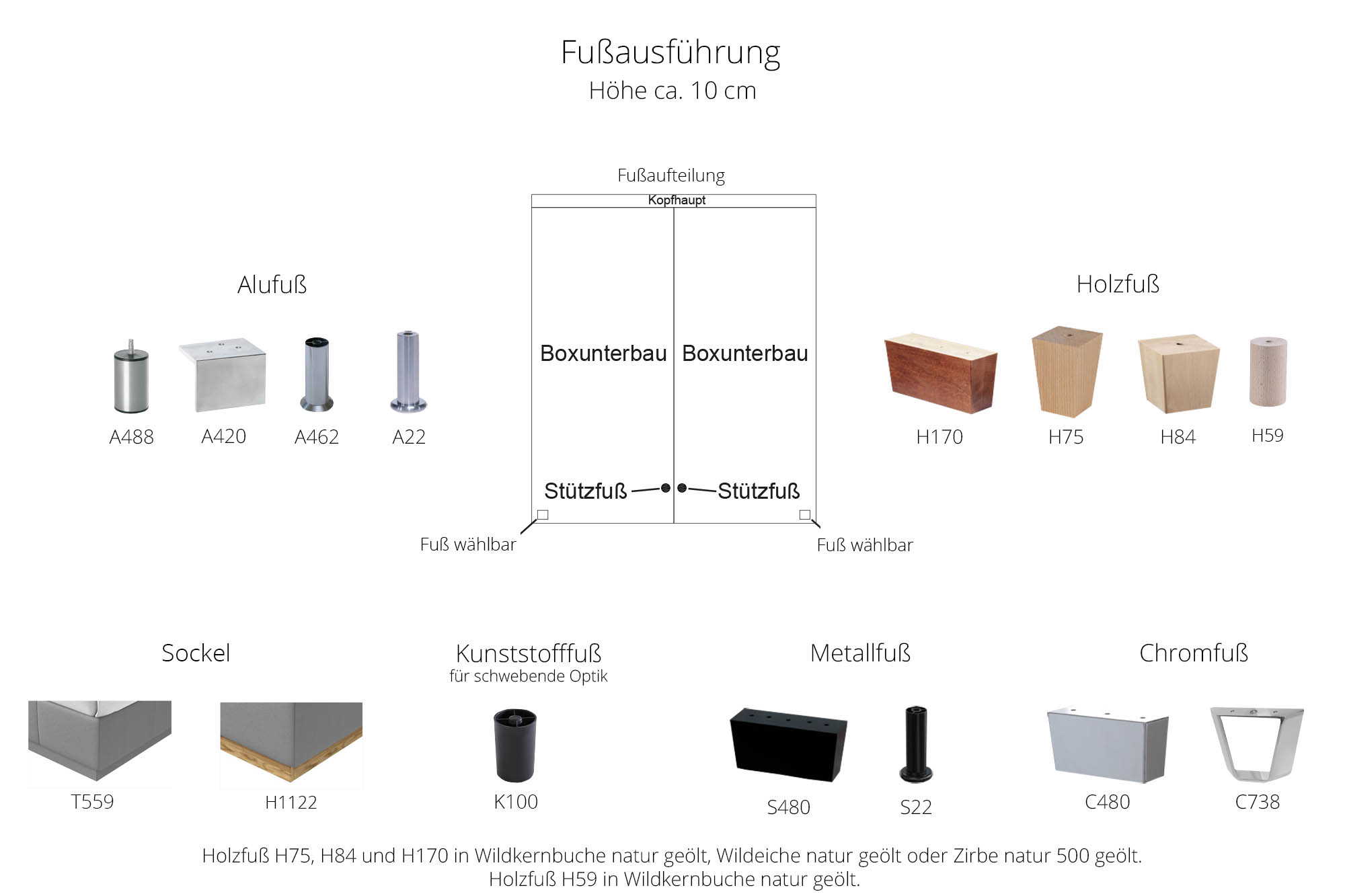 Hinweis! Holzfüße H75, H84 und H170 wählbar in Wildeiche natur 400 geölt, Zirbe natur 500 geölt oder Wildkernbuche natur 105 geölt. Holzfuß H59 in Wildkernbuche natur 105 geölt.