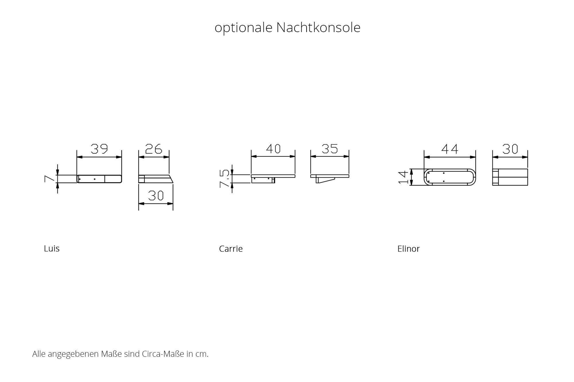 Hinweis! Für Nachtkonsole Luis und Carrie ist eine Seitenangabe erforderlich - für linke oder rechte Bettseite - vor dem Bett stehend mit Blickrichtung zum Bett.