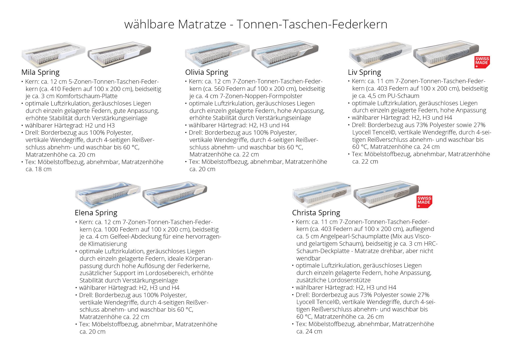 - Matratze: Mila Spring Tex - 5-Zonen-Tonnen-Taschen-Federkern (ca. 410 Federn auf 100 x 200 cm) mit beidseitiger Komfortschaum-Platte, abnehmbarer Möbelstoffbezug