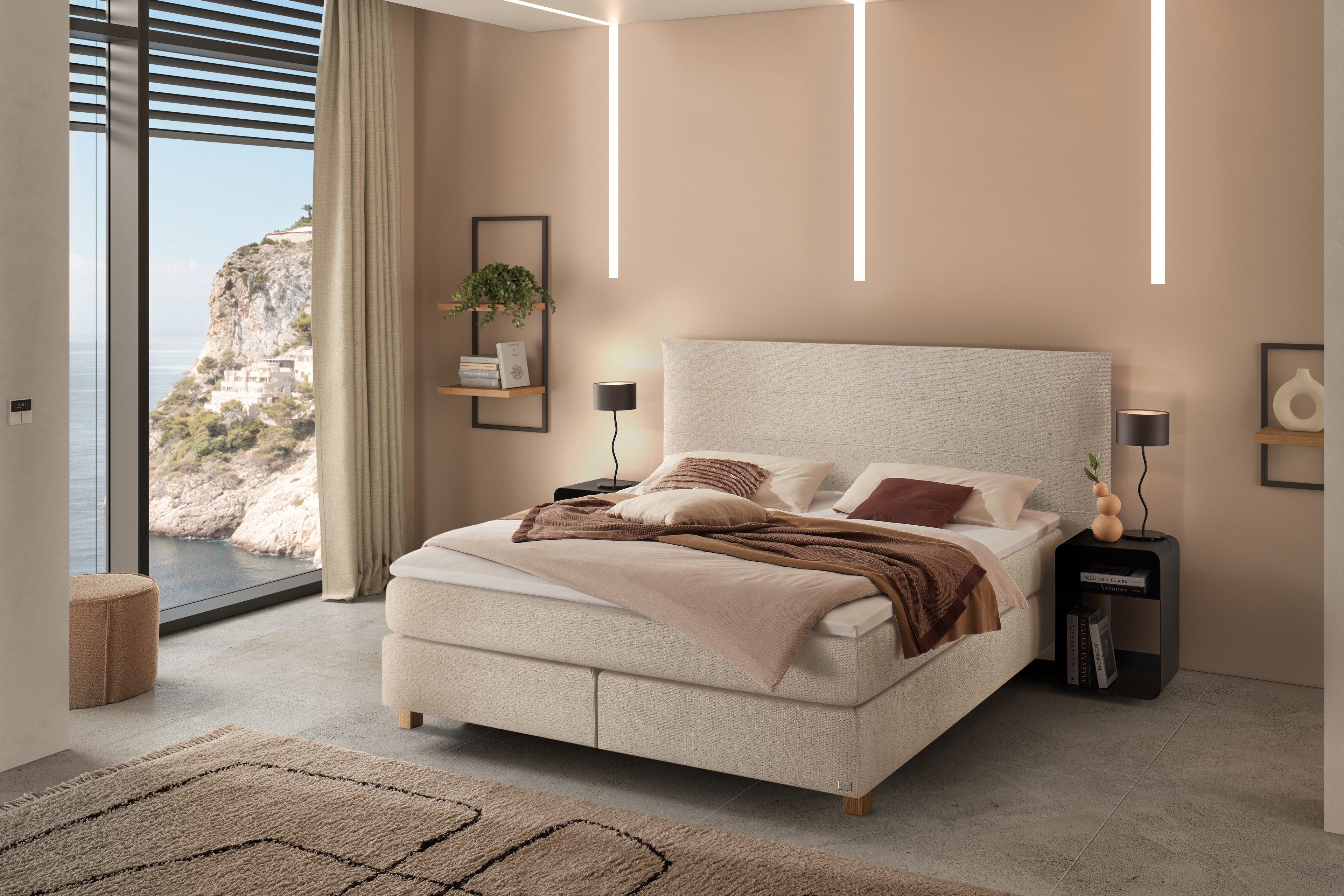 Beim Anblick dieses Boxspringbettes verfällt man umgehend in Urlaubsstimmung. Man schließt die Augen und stellt sich vor, wie man am Morgen erwacht und der erste Blick aus dem Fenster zu rauschenden Wellen und weißen Felsen fällt. Wenn Sie mit solch einem Gedanken zu Bett gehen, können Ihre Träume ganz einfach nur fantastisch werden. Mary aus der Reihe Comfort von Hasena wurde mit Liebe zum Detail kreiert und ist somit ein Modell, was unwiderstehlich ist. Erkennbar ist dies bereits an den Details am Kopfteil, welches mit wunderschönen Nähten verziert wurde. Atemberaubend ist gleichermaßen der Chenille-Flachgewebebezug, der sich angenehm sanft anfühlt und unter der Rubrik „Wunschbezug“ in verschiedenen Farben erhältlich ist. Nicht nur der Bezug ist komfortabel, sondern auch das Liegegefühl - die Taschen-Federkerne des Untergestells und der Matratze sorgen für den erholsamen Schlaf und der optionale Topper, den Sie je nach Belieben unter unseren Zusatzoptionen wählen können, unterstreicht das Ganze noch zusätzlich. Dort finden Sie außerdem die passende Nachtkonsole und die wählbaren Holzausführungen für die Füße Tess. Comfort Boxspringbetten von Hasena – erinnern Sie jede Nacht an die erholsamsten Tage des Jahres.