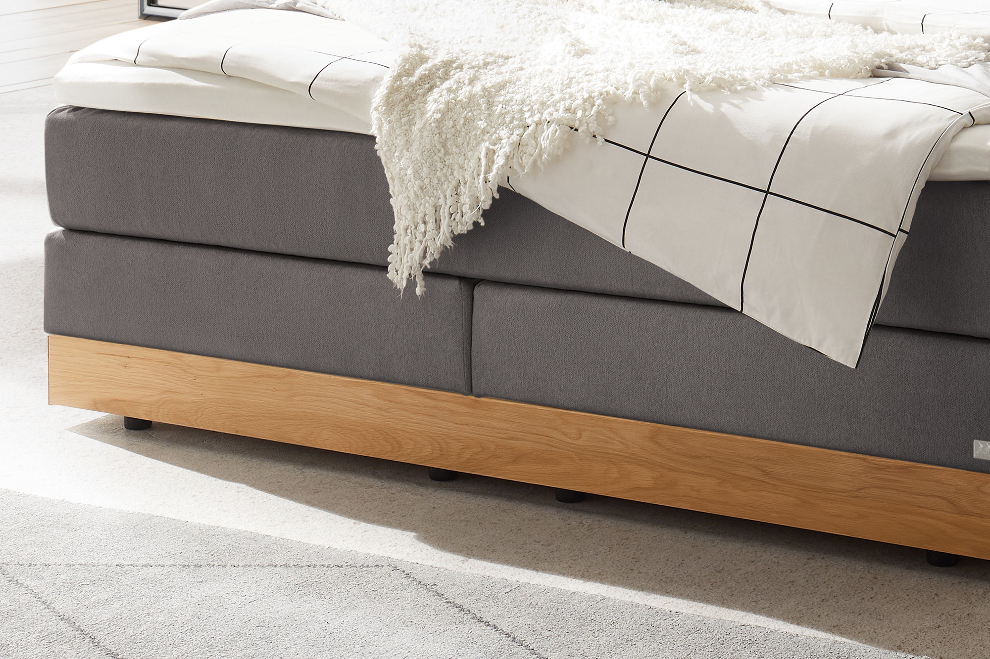 - Fußausführung: Massivholzsockel mit integriertem Bettkasten auf Gleiter