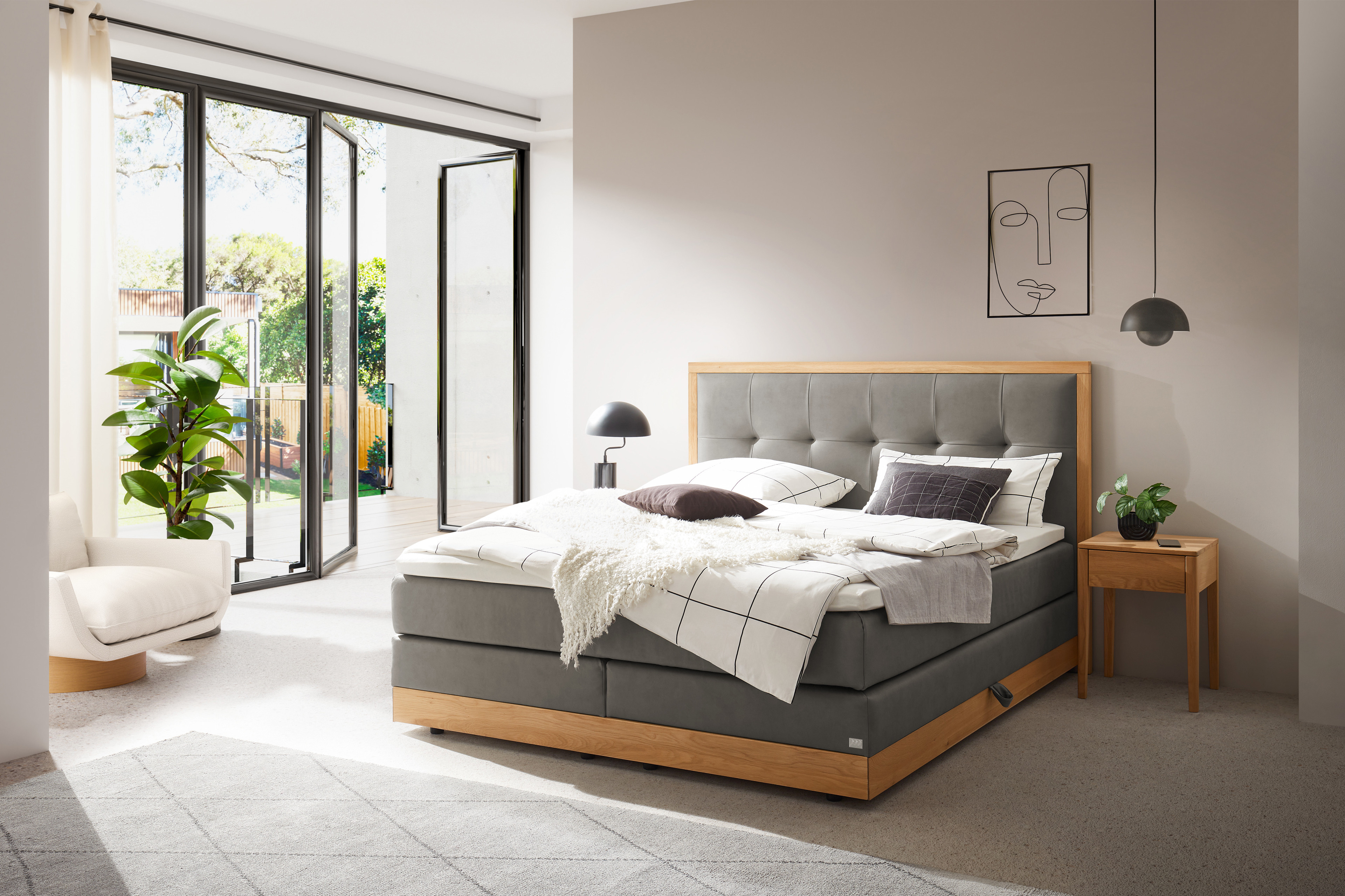 Hineinlegen, wohlfühlen, träumen - dazu lädt das Boxspringbett von Hasena förmlich ein. Die unglaublich harmonische Komposition aus einem rauchig grauen Microfaser und der Ausführung in Eiche bright lässt eine vollkommen neue Atmosphäre in Ihrem Schlafzimmer entstehen. Weiterhin bietet Ihnen das Modell Alba aus der Kollektion Boxspring Pronto durch seine zwei Bettkästen die Möglichkeit, beispielsweise Bettwäsche und Kissen geordnet unterzubringen. Die bequeme Matratze, welche zwei Tonnen-Taschen-Federkerne beinhaltet, erhalten Sie als durchgängige Variante inklusive aufliegenden Schaum-Topper. Dabei steht Ihnen frei, ob Sie einen festen, mittleren oder soften Liegekomfort bevorzugen. Um dieses traumhafte Ambiente auf Ihre Wünsche anzupassen, stehen Ihnen unter unserer Bezugsübersicht eine kleine Auswahl an verschiedenen Stoffarten und Farben zur Verfügung. Wenn nun auch Sie von diesem hochwertigen Boxspringbett in dieser herrlichen Ausführung überzeugt sind, dann überlegen Sie nicht lange und bestellen Sie sich passende Beimöbel dazu. Es erwarten Sie praktische Nachtkonsolen, die ebenfalls in der Holzausführung des Bettes gestaltet wurden. So viel Gemütlichkeit, solch ein hoher Komfort und dazu noch eine beispiellose Optik und das alles vereint in einem Boxspringbett.