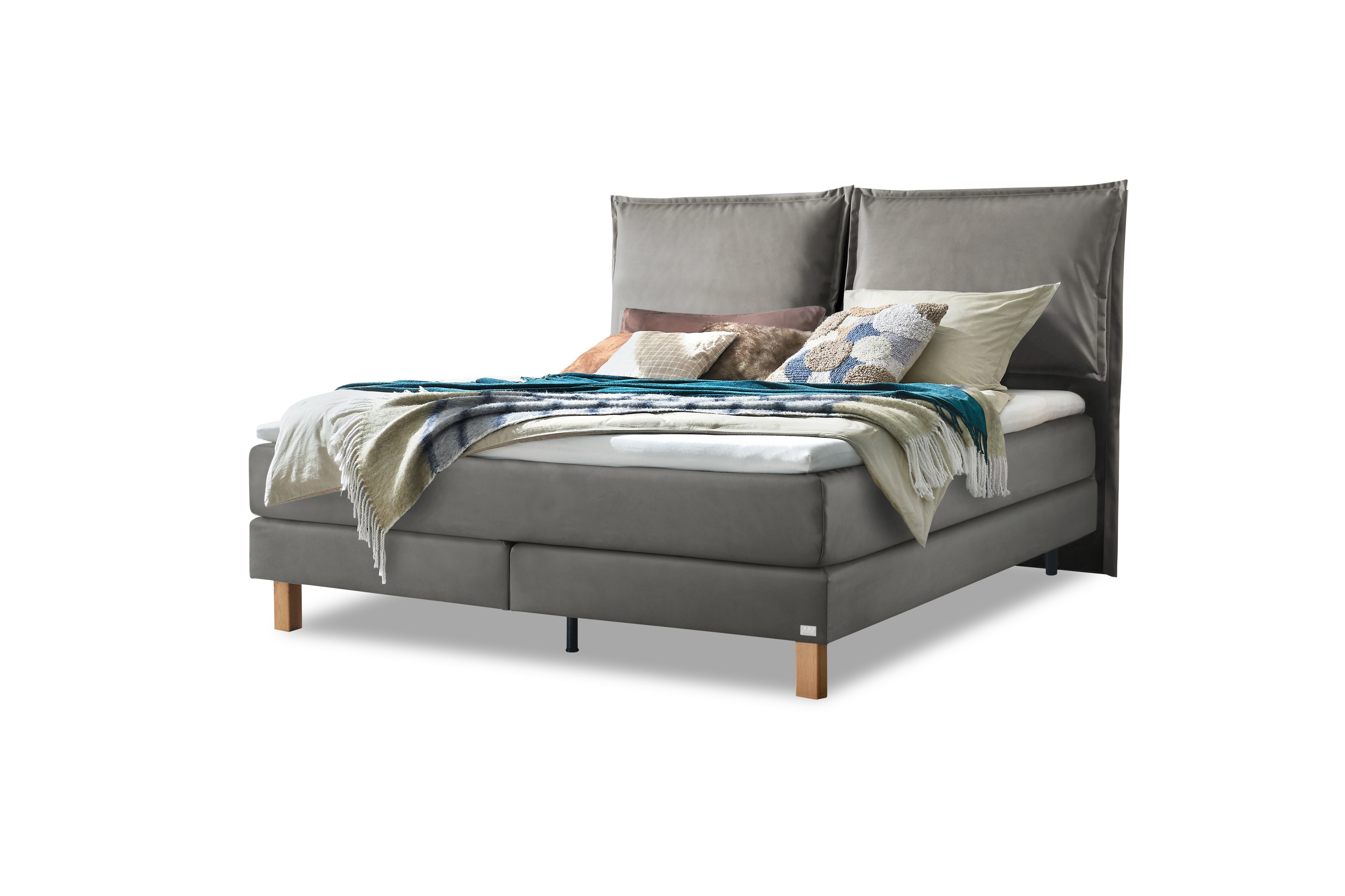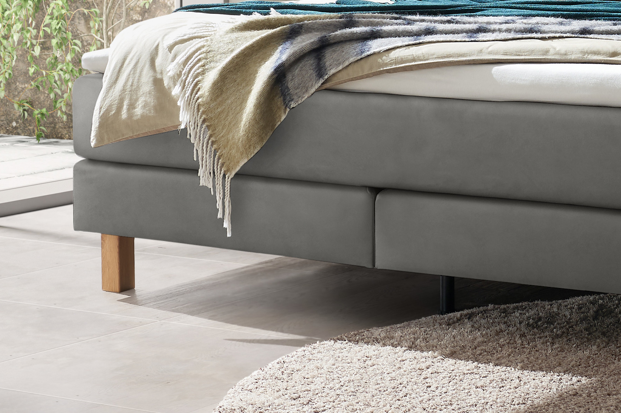 Sind Sie nicht auch sofort verzaubert, wenn Sie sich das wundervolle Boxspringbett Bonita von Hasena ansehen? Der geschmackvolle graue Stoffbezug ummantelt die Bonell-Federkern-Boxen, die Tonnen-Taschen-Federkern-Matratze sowie das weich gepolsterte Kopfteil und erhält durch die Kissenotik am Haupt ein sinnliches Gesamtbild. Die massiven Holzfüße in Eiche bright tragen das schöne Kunstwerk und setzen rustikale Akzente. Somit fügt sich das Boxspringbett in jeden bestehenden Einrichtungsstil ein, egal, ob romantisch verspielt, klassisch elegant oder im industriellen Loftcharakter. Passen Sie sich Bonita auf Ihre Wünsche an und wählen Sie den passenden Bezug zu Ihren Vorlieben. Unter dem Menüpunkt „Farbe ändern“ finden Sie ausgewählte Stoffe sowohl in Microfaser als auch Flachgewebe, welche Sie sich als Muster zusenden lassen können. Auf Grund der verkürzten Lieferzeit des Pronto-Programms müssen Sie auch nicht lange auf Ihr Traumbett warten. Bei weiteren Fragen steht Ihnen unser kompetentes Verkäuferteam vor Ort, im Chat oder telefonisch gerne zur Verfügung. Genießen Sie Qualität, modernes Design und Komfort vereint in einem Bett - mit Hasena, dem Spezialisten für Schweizer Möbel.