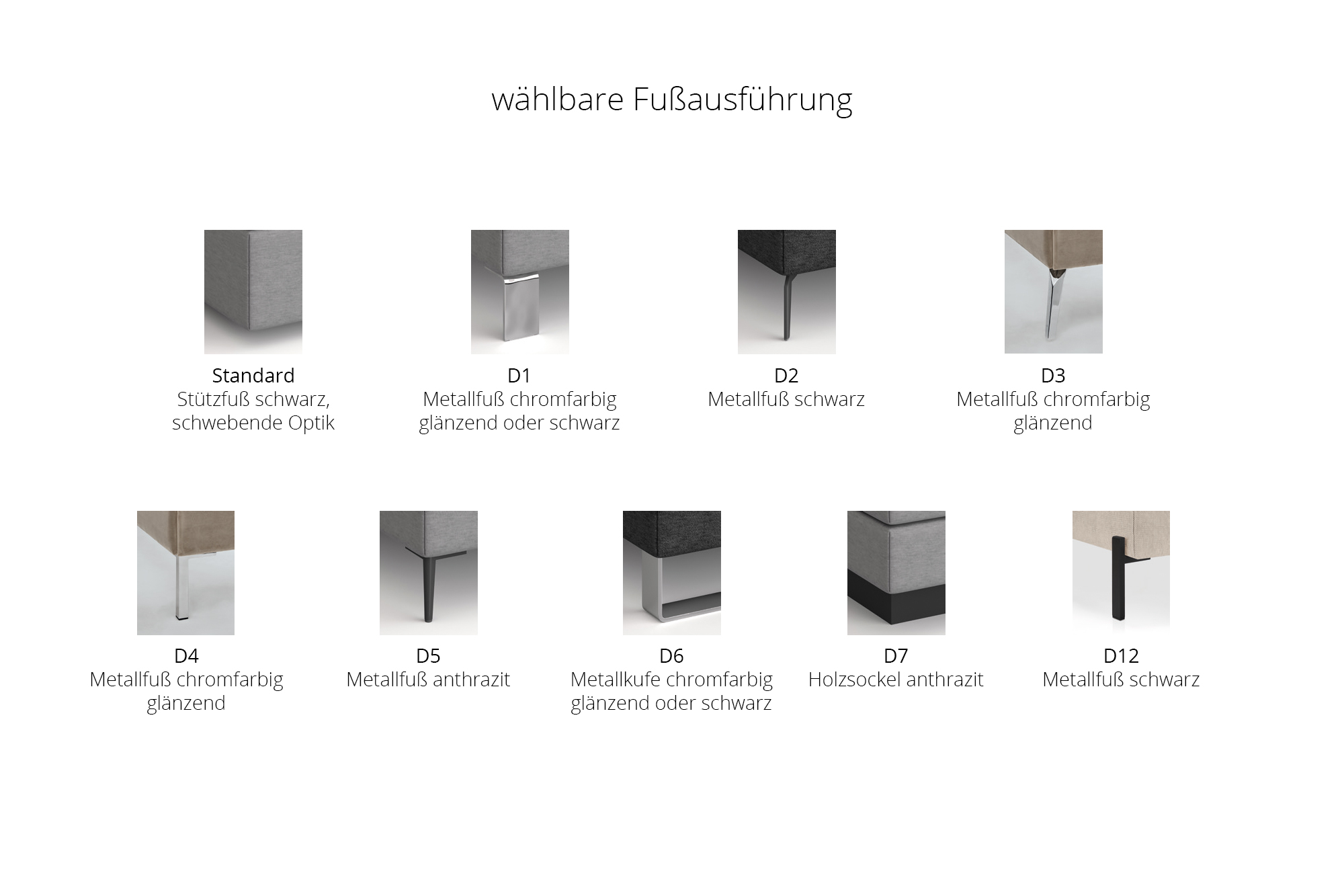 Auf Wunsch können die Kopfteile im Rücken in Möbelstoff bezogen werden. Kopfteil 9 ist standardmäßig bereits im Rücken echt bezogen. - wählbare Fußausführung: