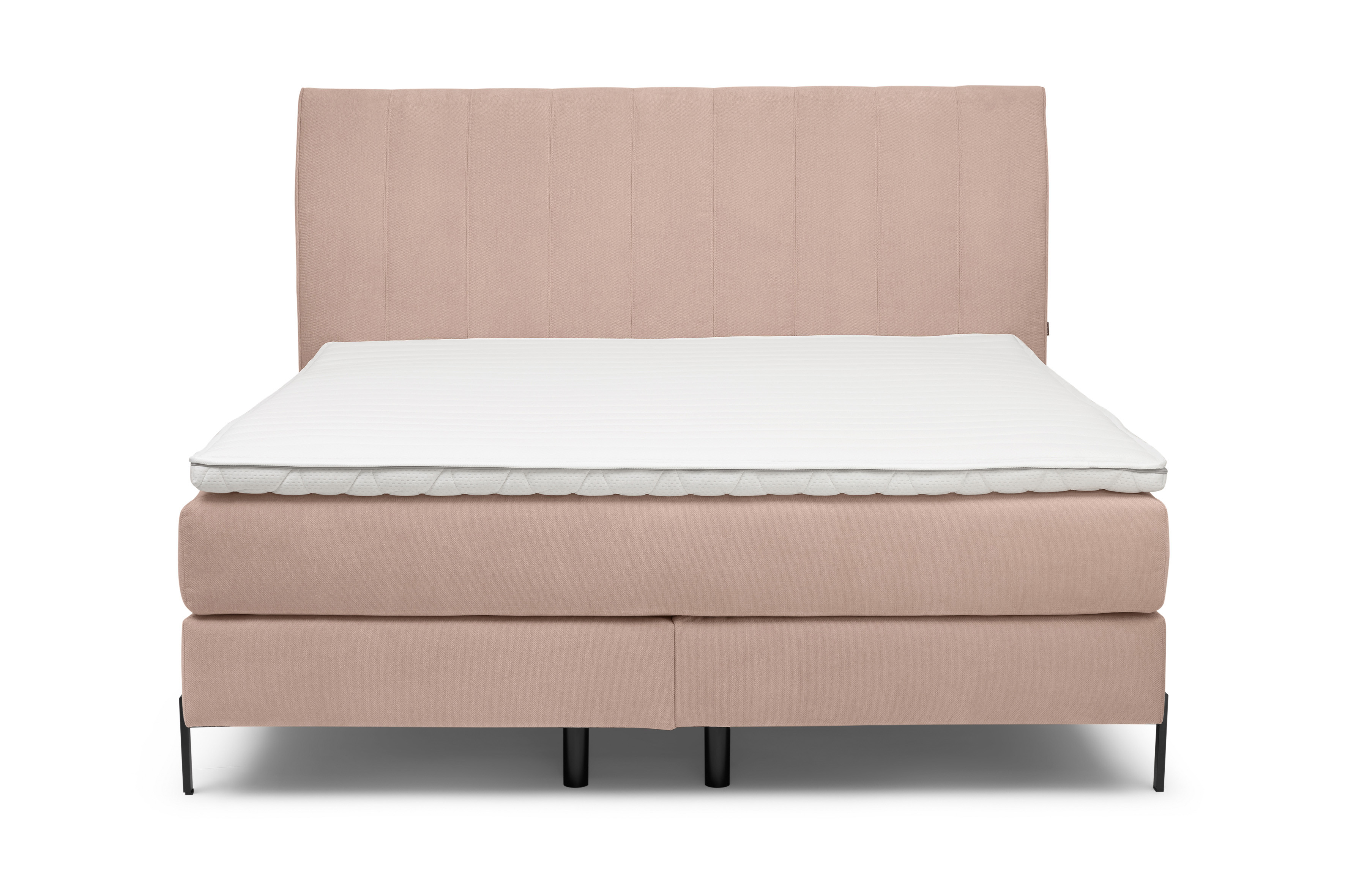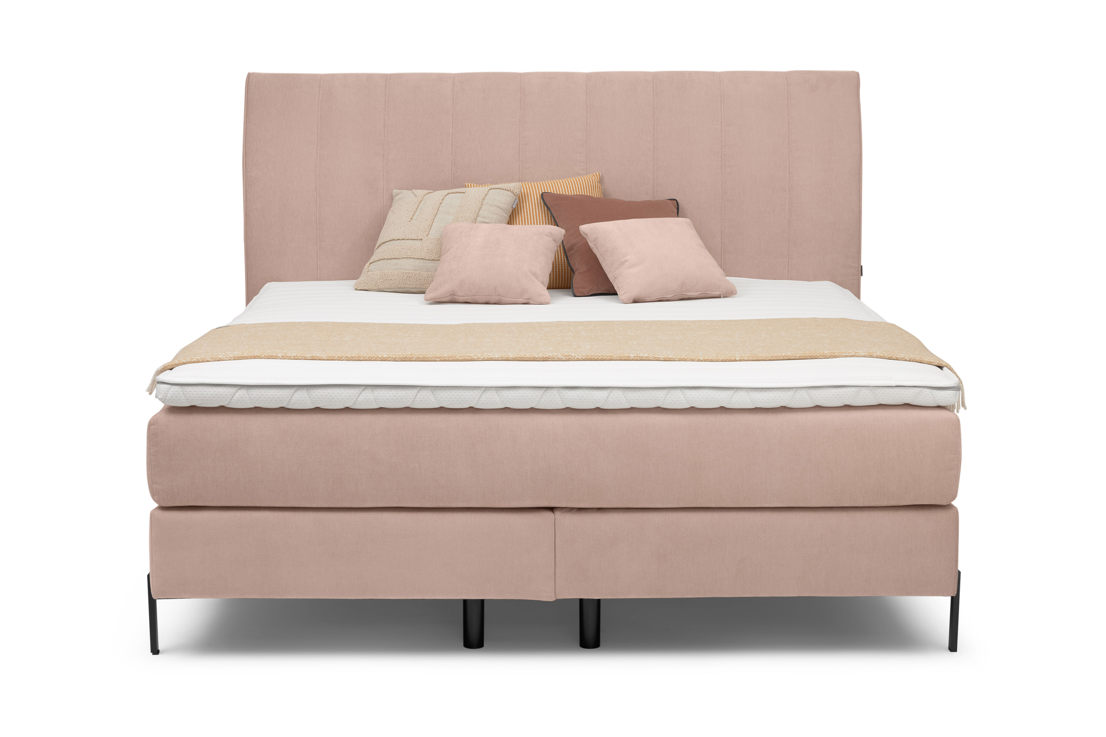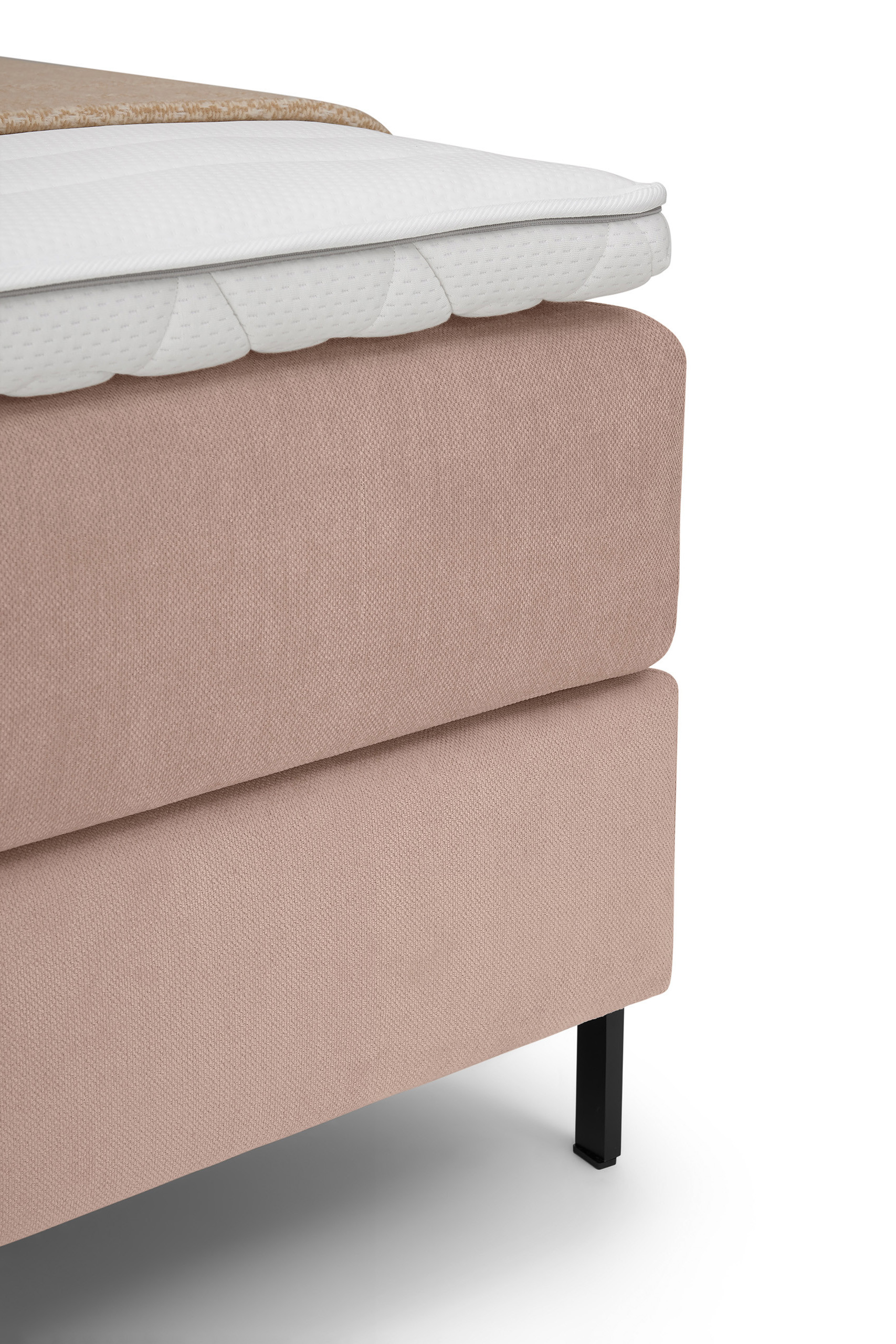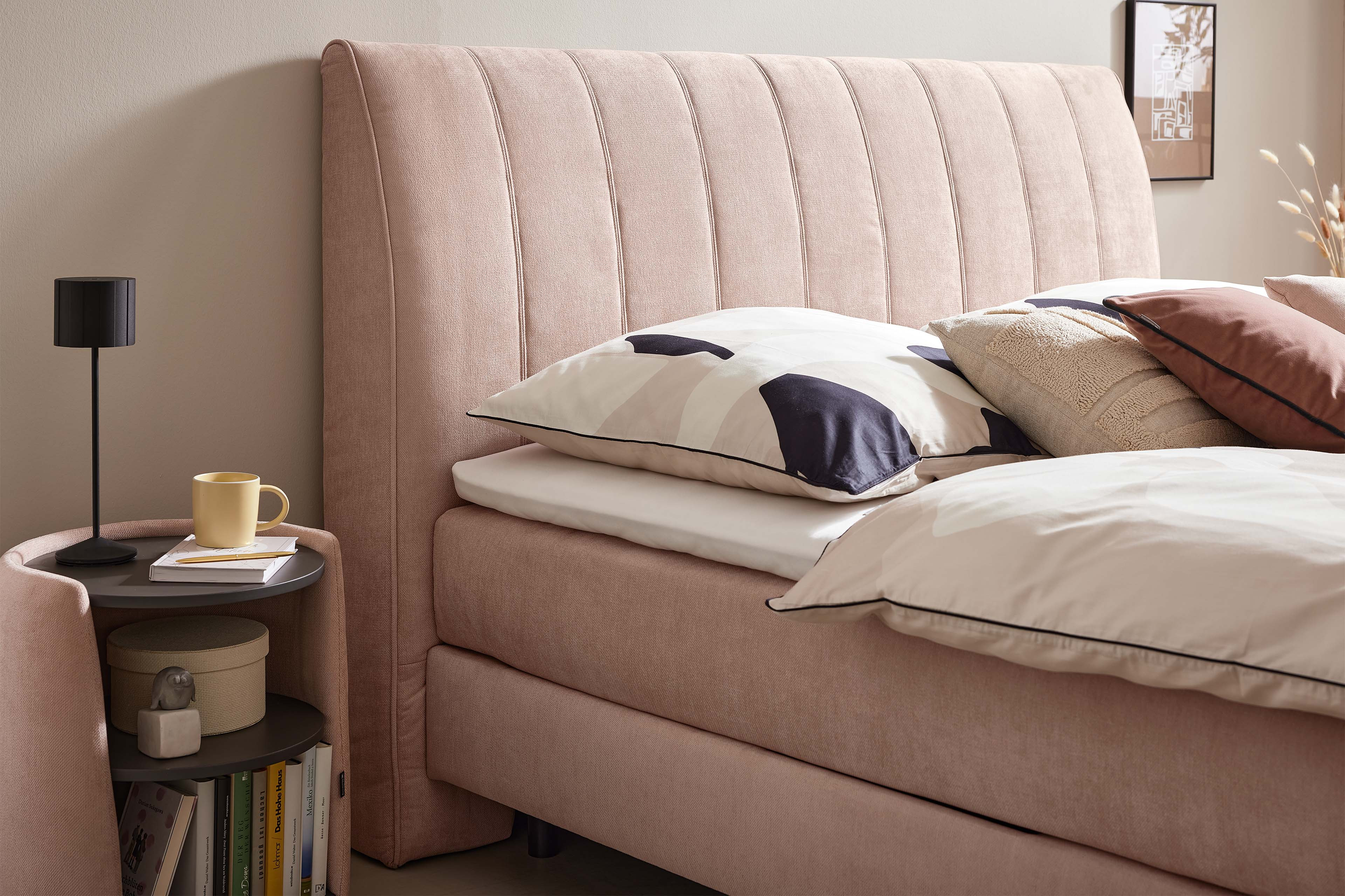 Ein zartrosa Pastelltraum erwartet Sie in Ihrem Schlafzimmer mit diesem bezaubernden Boxspringbett von Musterring. Kuschelig weich und anschmiegsam präsentiert sich hier das Modell Eforma mit einem einladenden, gewölbten Kopfteil, das durch seine vertikalen Ziernähte zum Blickfang wird. Geradlinige, schwarze Metallfüße setzen wiederum einen modernen Akzent, dank welchem sich das Bett in verschiedene Einrichtungsstile integrieren lässt. Wünschen Sie sich mehr Gestaltungsfreiheit? Dann sind Sie hier natürlich auch genau richtig, denn mit den vielfältigen Konfigurationsoptionen lässt sich nahezu jedes Designelement optisch anpassen. Was sich dabei selbstverständlich nicht ändert: der umwerfende Komfort, den Sie mit dem Boxspringbett Eforma von Musterring erleben werden. Eine außergewöhnliche Kombination aus Taschenfedern und flexiblen Federleisten-Elementen in der Box, welche sich zudem noch in der Festigkeit justieren lässt, verschafft Ihnen die optimale Liegeposition für Ihre Wirbelsäule. Hinzu kommt eine Auswahl hochwertiger Taschen-Federkern-Matratzen, aus denen Sie sich Ihren Favoriten aussuchen können. Zum krönenden Abschluss lässt sich Ihr neues Boxspringbett optional auch noch mit einem Schaumtopper ausstatten, welcher das Liegegfühl perfekt abrundet. Eforma von Musterring – immer die richtige Wahl.
