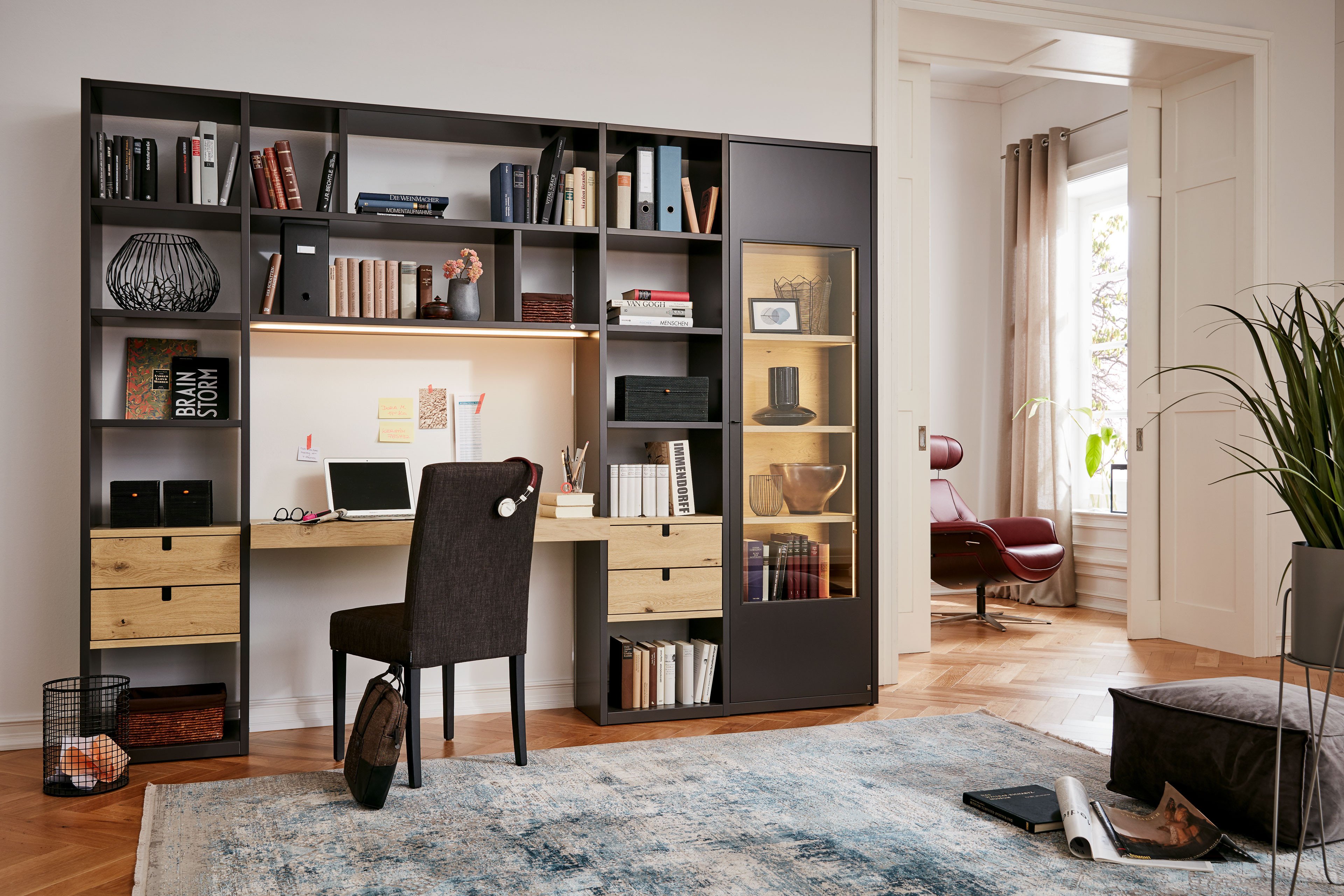Die Büro- und Wohnwand Kara-System von Musterring besteht sowohl aus einem Regal- als auch einem Vitrinenelement, welches durch eine naturnahe Schreibtischplatte in furnierter Asteiche ergänzt wird. Der warme Akzent dieser, der sich auch in den Schubkästen und der Vitrinenrückwand widerspiegelt, bildet einen stilvollen Kontrast zur ansonsten graphitgrauen Gestaltung. Durch Bücher sowie dekorative Accessoires wirkt die Büroeinheit eher wie ein Wohnmöbel als ein klassischer Arbeitsplatz, sodass sich der Schreibtisch harmonisch in das Wohnzimmer einfügt. So vereint die Regalwand wohnliche Gemütlichkeit mit funktionalem Mehrwert, das sich positiv beim Arbeiten oder Lernen im Homeoffice auswirkt. Gestalten Sie über die Zusatzoptionen Ihr persönliches Möbelstück ganz nach Ihren Vorstellungen, indem Sie die Farbgestaltung passend zu Ihrem bestehenden Interieur wählen. Ergänzen Sie das Musterring Wohnbüro Kara-System optional mit einer passenden Beleuchtung – und dem produktiven Arbeiten in den eigenen vier Wänden steht nichts mehr im Weg.