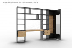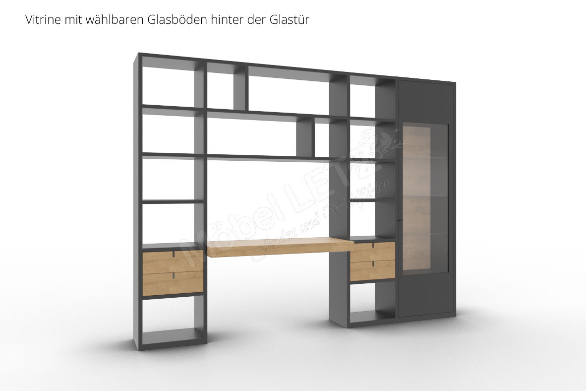 - Wohnregal mit 14 offenen Fächern, 4 Schubkästen, 1 Schreibplatte und 1 Vitrine mit 6 Fächern