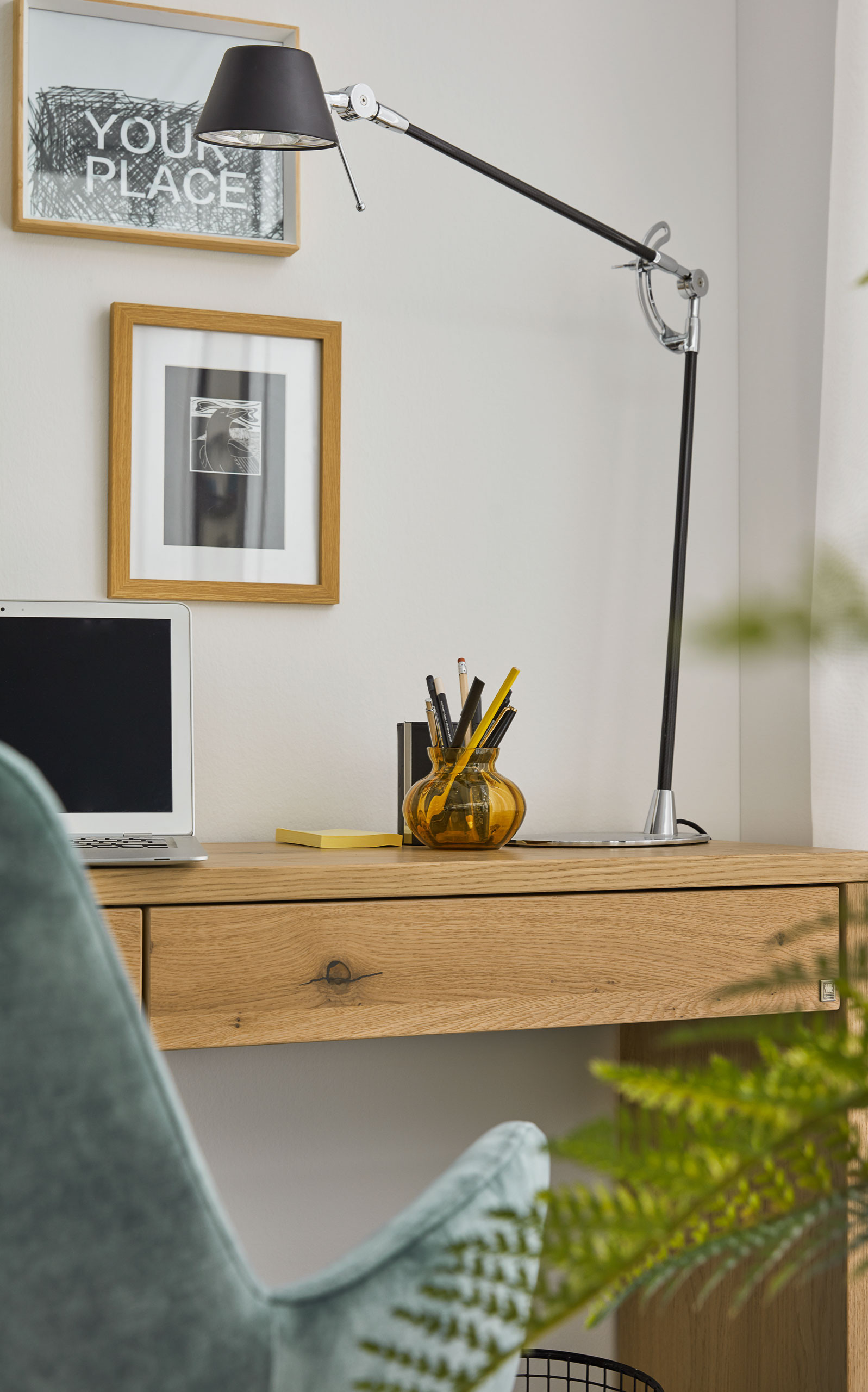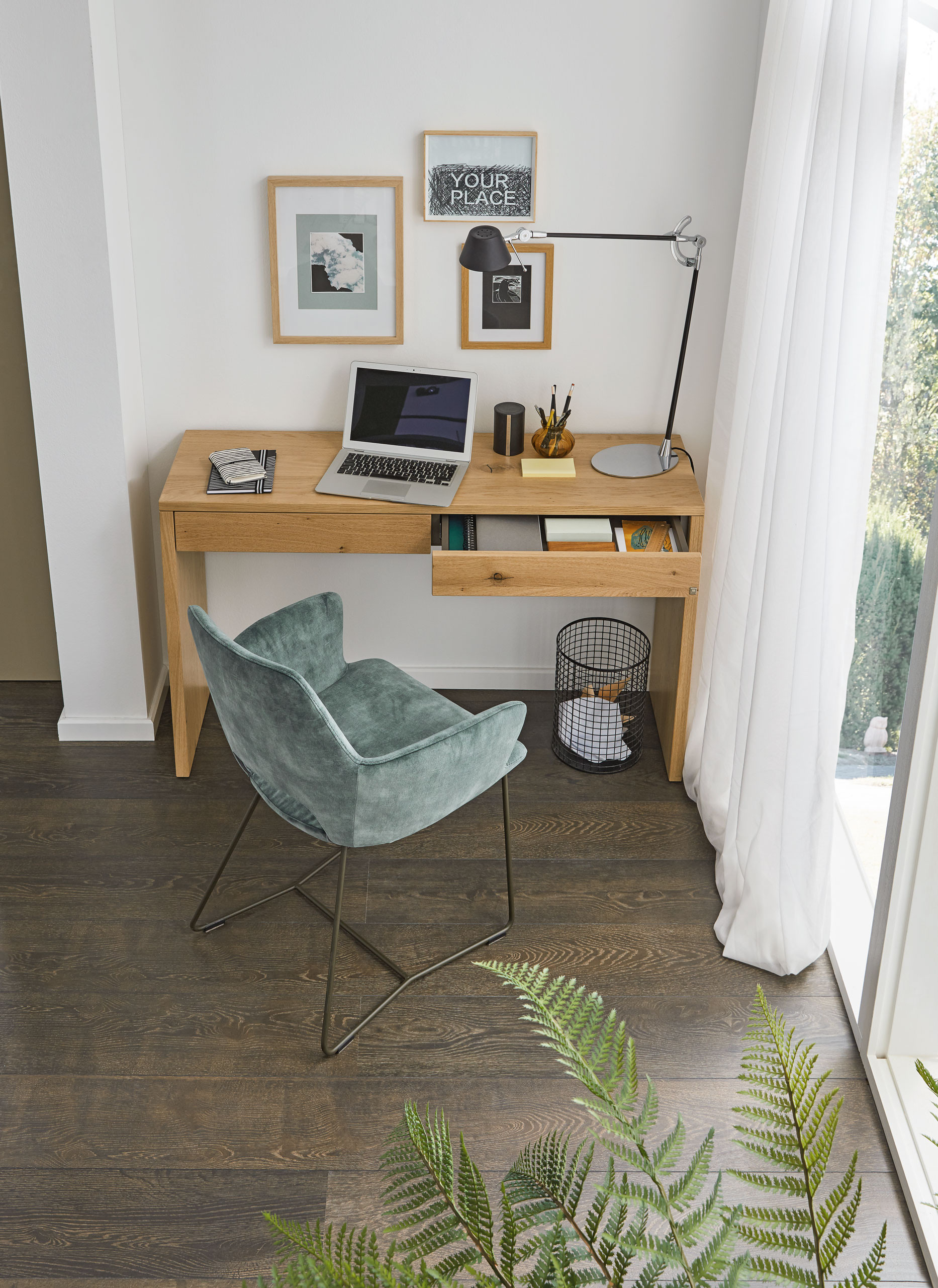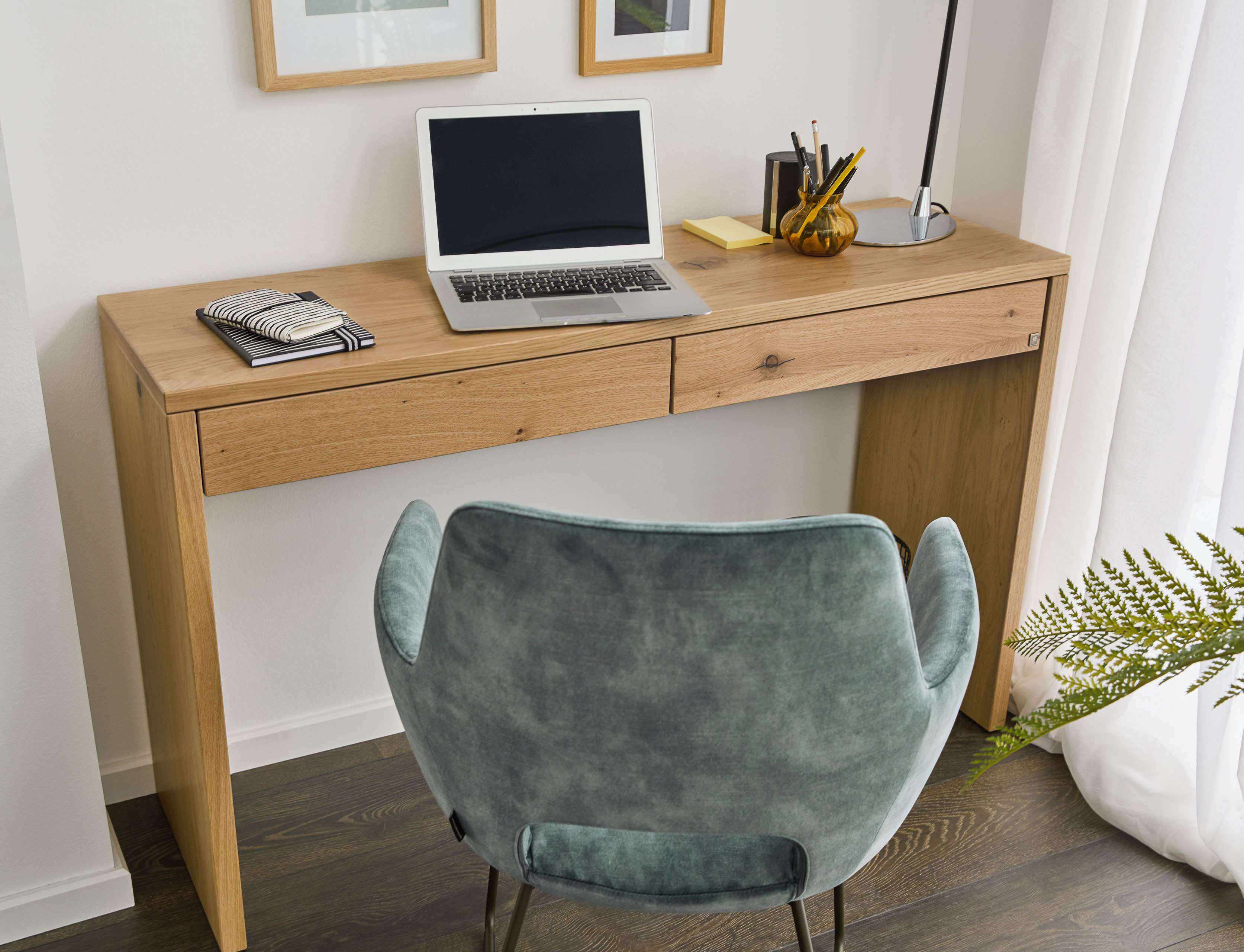 Aus natürlichen Materialien gefertigt, lässt sich der Konsolen-Schreibtisch aus der Musterring Modellreihe Kira-System dank seiner geringen Größe sowie seiner harmonischen Leichtigkeit ohne viel Aufwand spielend leicht zu Hause integrieren. Einfach im Wohnraum platziert oder in die Büroraumgestaltung eingebracht, sorgt der Solitär für ein unvergleichliches Ambiente und schmückt als besonderer Hingucker jeden Wohnbereich. Dank des verwendeten Echtholzfurnieres der Asteiche begeistert der moderne Schreibtisch mit seiner edlen Optik und verleiht jedem Raum eine stilvolle, natürliche Atmosphäre. Die Holzausführung können Sie gern nach Ihren Wünschen aussuchen und an Ihre Raumgestaltung anpassen. Neben dieser haben Sie auch die Wahl aus verschiedenen Lackausführungen. Für kleinere Utensilien bieten die zwei integrierten Schubladen zusätzlichen, praktischen Stauraum. Stifte, Notizbuch, Terminkalender lassen sich hier bei Bedarf schnell unterbringen und genauso schnell wieder herbeizaubern. Ob im Wohnzimmer, im Flur oder im eigenen Arbeitszimmer untergebracht, der kleine Musterring Home-Office-Tisch Kira-System ist ein gelungenes Beispiel, dass stilvolles Wohnen mit Arbeiten Hand in Hand gehen kann.