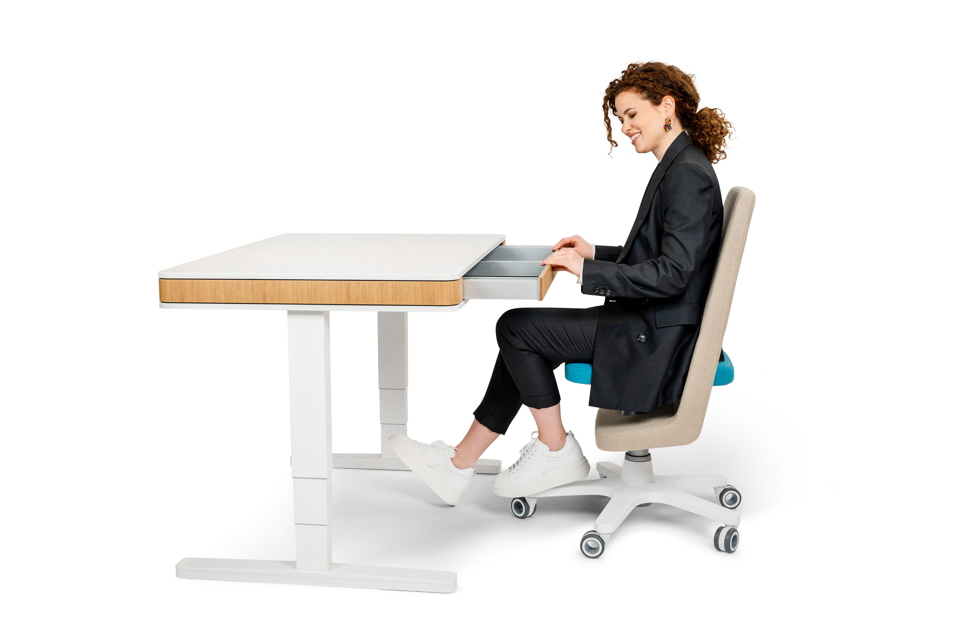 - Schubkasten Frontseite: Großraumschublade mit 2 Stiftfächern, 2 Utensilienfächern und 2 großen Fächern, davon 1 Fach in DIN A3-Größe