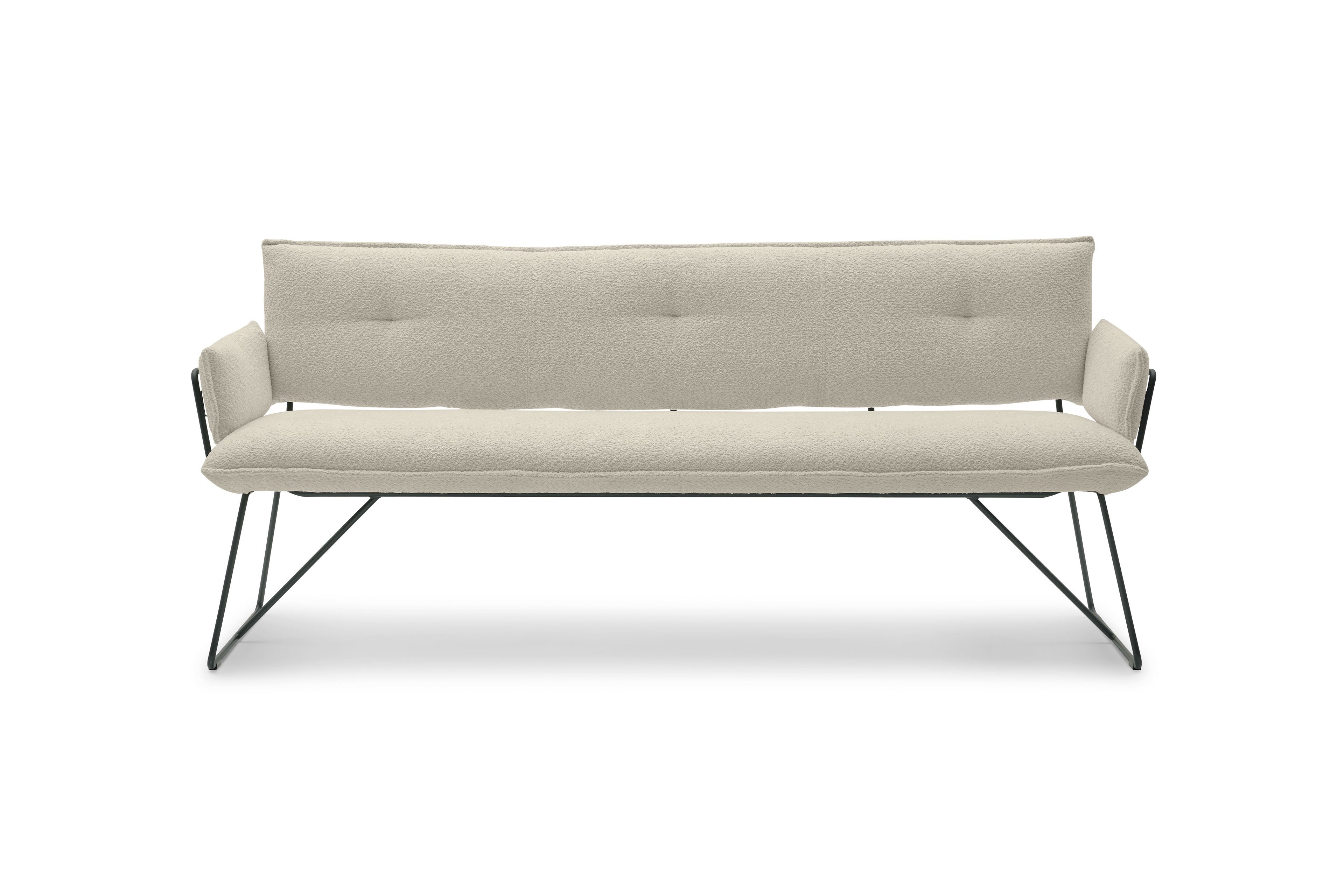 Die Bank Pinero von Musterring ist vielfältig einsetzbar, ob im Ess- oder Wohnzimmer, sie kommt garantiert überall gut zur Geltung. Gezeigt wird sie hier mit einem beigen Bouclebezug und einem Metallgestell in Schwarz, alles in einem ein schlichtes, aber dennoch sehr stilbewusstes und ausdrucksstarkes Design. Sie werden also kein Problem haben, die Essbank in Ihr schon vorhandenes Mobiliar zu integrieren. Außerdem ist die Musterring Bank mit einer Wellenfederung ausgestattet und somit äußerst bequem bei langen Dinnerabenden mit Ihren Liebsten. Falls Sie doch einmal etwas mehr oder weniger Gäste erwarten, haben wir für Sie zwei weitere Größen, etwa 173 cm und circa 213 cm, in unseren Zusatzoptionen zur Auswahl, somit finden auch mehrere Personen auf der Bank einen geeigneten Sitzplatz. Zögern Sie nicht und erfreuen Sie sich schon bald an der edlen Sitzbank namens Pinero.
