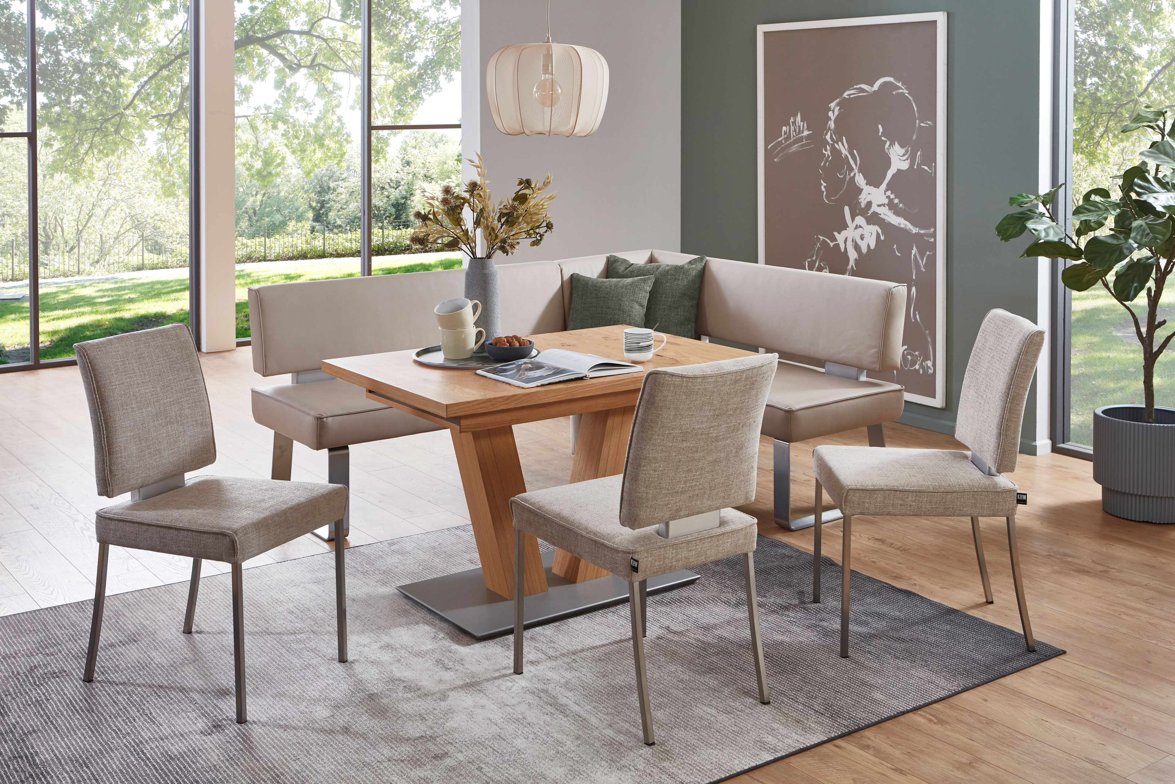 Sind Sie auf der Suche nach einer neuen Eckbankgruppe für Ihren Essbereich? Diese sollte in einem hellen und ansprechenden Design gehalten sein und höchsten Komfort bieten? Dann präsentieren wir Ihnen hier das ideale Angebot. Die Eckbank Game Plus von K+W Polstermöbel ist mit einem Bezug aus cremefarbenem Microfaser ausgestattet. Die angenehme Polsterung gewährleistet ein unvergleichliches Sitzgefühl. Dadurch werden gemeinsame Mahlzeiten mit der Familie, gesellige Spielabende oder anregende Gespräche zu außergewöhnlichen Erlebnissen. Über unsere Zusatzoptionen erhalten Sie die Möglichkeit, den abgebildeten Esstisch 5302 sowie die passenden Stühle direkt hinzuzufügen. Eine weitere Option ist unsere Rubrik "Wunschbezug". Hier bekommen Sie die Möglichkeit, ganz nach Ihren Wünschen, einen anderen Farbton oder gar ein anderes Material für Ihre neue Sitzgelegenheit zu buchen. Gestalten Sie Ihr Esszimmer neu und Sie werden begeistert sein. Die K+W Eckbank Game Plus - ein Highlight, welches Ihre Räumlichkeiten fabelhaft aufwerten und bereichern wird.