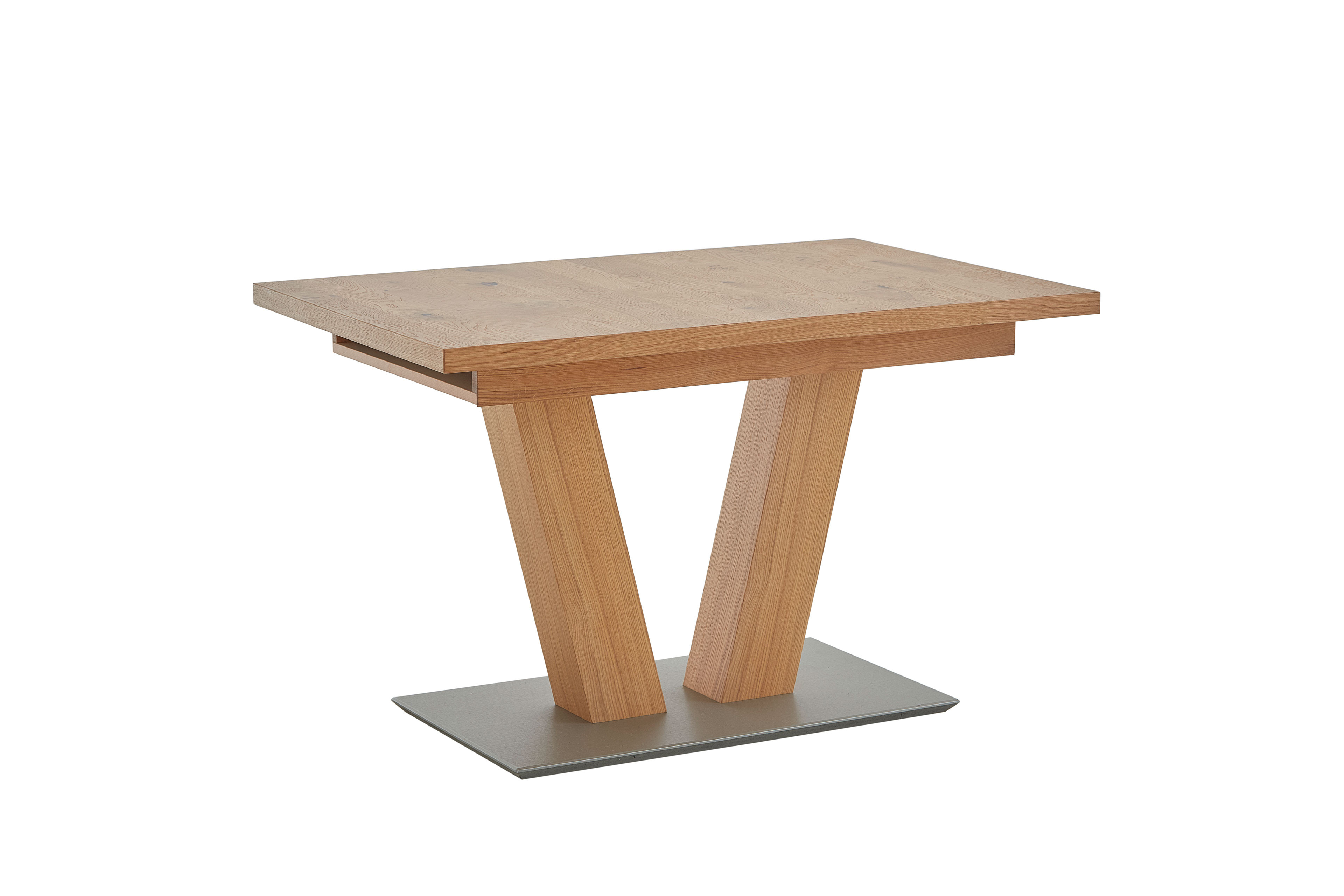 Erleben Sie den Inbegriff von Eleganz mit dem exquisiten Esstisch 5302 von K+W. Das Modell ist nicht nur ein Möbelstück, sondern ein Erlebnis für alle Sinne, das Ihre Esszimmergestaltung auf ein ganz neues Niveau hebt. Gefertigt aus herausragenden Materialien, überzeugt er durch seine erstklassige Verarbeitung und Langlebigkeit. Die edlen Echtholzfurnier-Oberflächen strahlen Wärme und Stil aus und laden dazu ein, unvergessliche Momente mit Ihren Liebsten zu teilen. Die geschmackvolle Holzmaserung wird zum Blickfang und verleiht Ihrem Raum eine besondere Note. Eine praktische Auszugsfunktion ermöglicht es Ihnen, den K+W Tisch im Handumdrehen zu vergrößern, sodass Sie jederzeit für Gäste bestens gerüstet sind. Egal, ob ein intimes Dinner oder ein festliches Familienessen – mit nur wenigen Handgriffen gewinnen Sie wertvollen Platz und schaffen so eine einladende Atmosphäre. Das auffällige V-Gestell sorgt nicht nur für Stabilität, sondern auch für ein modernes Design, das in jedem Raum Akzente setzt. Die edle Bodenplatte in Edelstahloptik unterstreicht die hochwertige Ausstrahlung und verleiht ihm einen Hauch von zeitloser Eleganz. Gestalten Sie Ihre Esszimmerumgebung mit dem Esstisch 5302 von K+W zu einem Ort, an dem Stil und Komfort harmonisch aufeinandertreffen. Lassen Sie sich von der herausragenden Qualität und dem durchdachten Design begeistern und machen Sie jeden gemeinsamen Moment zu einem ganz besonderen Erlebnis.