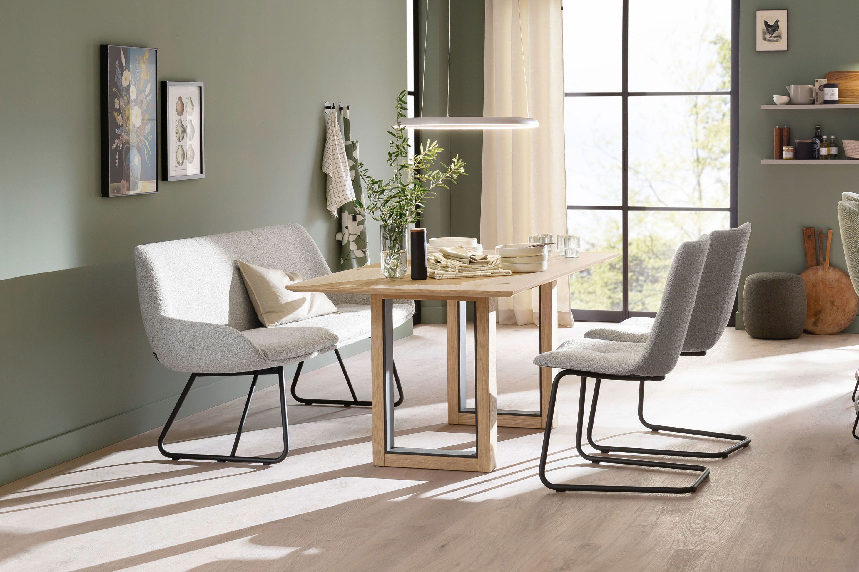 Der Esstisch Cross aus der SHÖNER WOHNEN Kollektion verbindet zeitlose Formsprache mit moderner Eleganz und verwandelt jeden Essbereich in eine Bühne für inspirierende Begegnungen. Das Kernstück bildet Wildeiche hell geölt, deren warmes Farbspiel und die lebendige Maserung eine warme, einladende Atmosphäre schaffen. Als Furnier verarbeitet, bietet es die sichtbare Haptik des Holzes bei zugleich reduzierter Wandlungsfähigkeit in Beanspruchung, sodass der Tisch auch in stark frequentierten Wohnbereichen seine Form behält. Das Kufengestell mit dezent anthrazitfarbigen Metallablsetzungen verleiht dem Design eine klare, urbane Note und sorgt für einen sicheren Stand sowie eine stilvolle Kontrastwirkung. Mit einer großzügigen Tischplatte von etwa 160 cm entstehen imposante Begegnungsmomente, bei denen Genuss, Gespräche und gemeinsame Mahlzeiten im Mittelpunkt stehen. Cross überzeugt darüber hinaus durch seine vielseitige Anpassbarkeit. Weitere Holzausführungen lassen sich auswählen, sodass der SCHÖNER WOHNEN Tisch nahtlos in verschiedenste Wohnwelten integriert werden kann. Ob helles, freundliches Ambiente oder dunkle, gemütliche Atmosphäre – das Zusammenspiel von Holz und Metall schenkt jedem Raum eine einzigartige Ausdrucksstärke. Die hochwertige Verarbeitung spiegelt sich in jeder Detailführung wider, von der werkseitigen Oberflächenbehandlung bis zu den filigranen Verbindungen im Kufengestell.