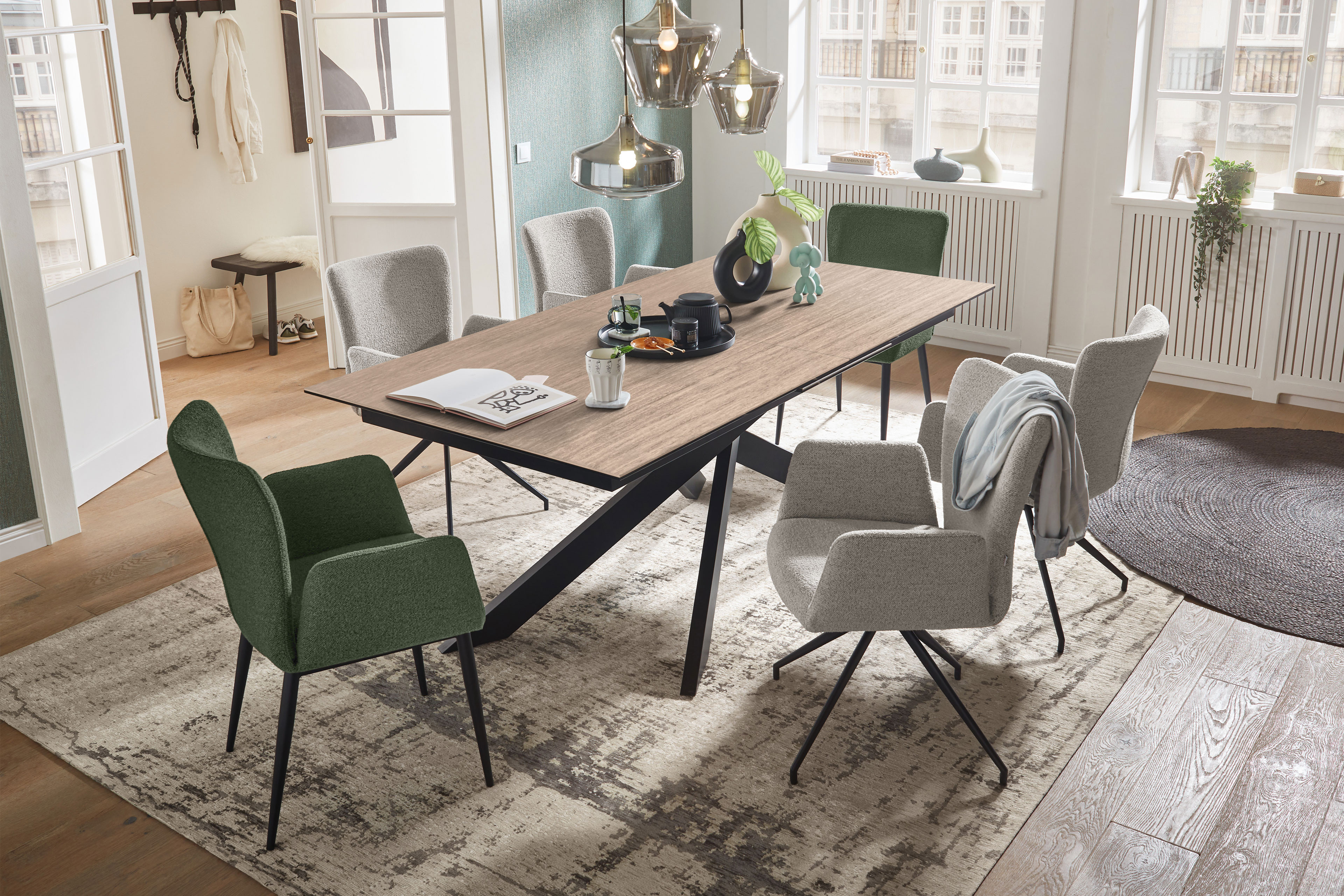 Sie suchen nach einem hochwertigen und eleganten Esstisch, der aufgrund seines einzigartigen Aussehens zu einem blickfangenden Herzstück in Ihrem Speisebereich wird? Dann schauen Sie sich das Modell Baltimore von set one by Musterring an. Die Kombination aus dem formschönen, in Mattschwarz gepulvertem Stahlgestell und der keramischen Tischplatte in Travertine beige schafft ein robustes und in puncto Optik edel designtes Möbelstück. Mit einer Größe von etwa 200 - 250 x 100 cm bietet der Tisch zudem ausreichend Platz für Sie und Ihre Liebsten. Genießen Sie an diesem Schmuckstück die gemeinsamen Mahlzeiten mit Ihrer Familie oder richten Sie an ihm lustige Spieleabende mit Freunden aus. Weiterhin finden Sie in unseren Zusatzoptionen die Möglichkeit, die Tafel auch in der schönen Variante Anista rau zu wählen sowie die abgebildeten Stühle direkt hinzuzubuchen. Schaffen auch Sie mit dem set one by Musterring Esstisch Baltimore einen Essplatz, der zu unvergesslichen Stunden des Beisammenseins einlädt und Ihnen aufgrund seiner exklusiven Aufmachung stets ein treuer Begleiter sein wird.