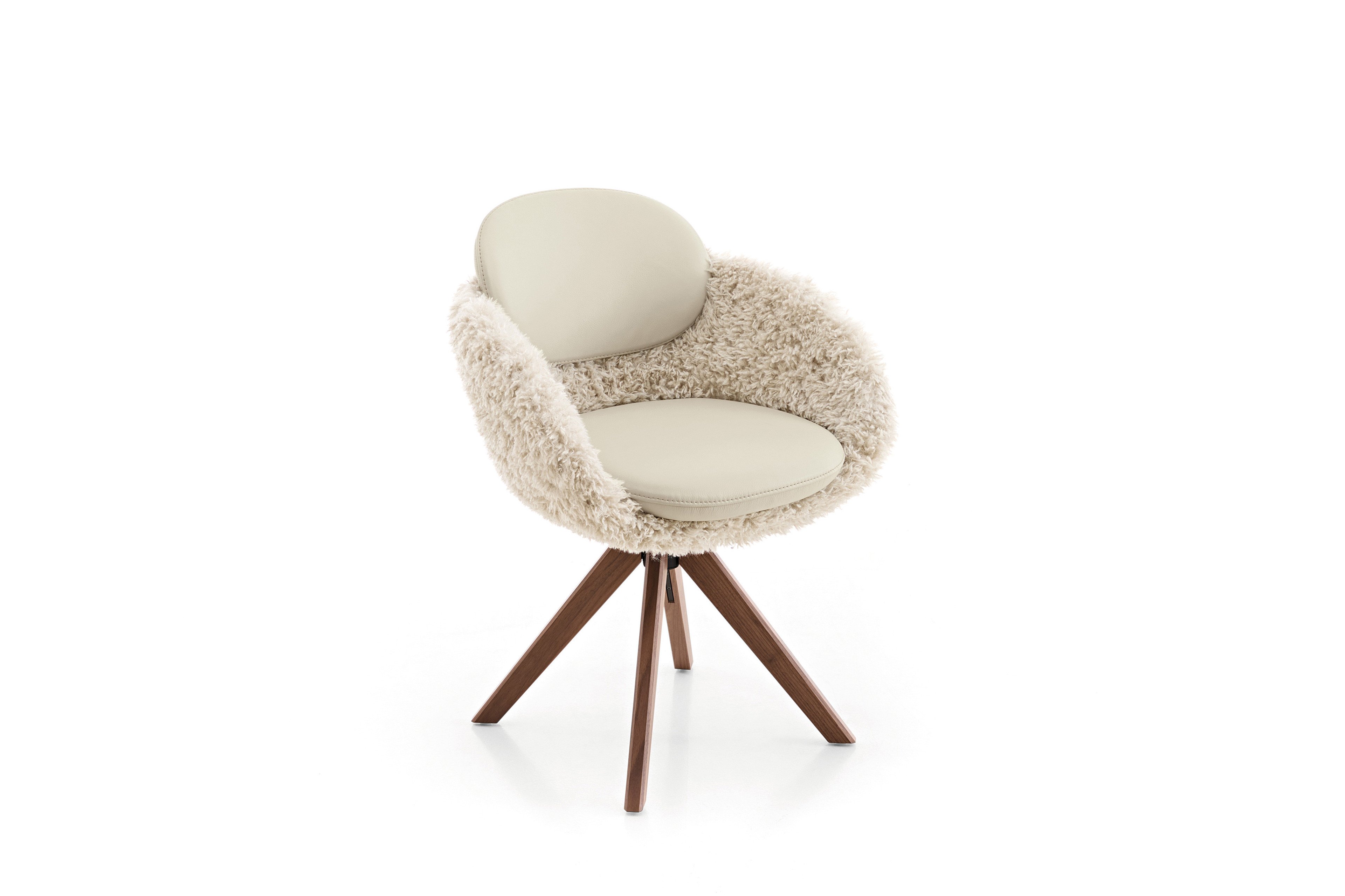 Der KOINOR Stuhl 1310 verbindet modernes Design mit natürlicher Ausstrahlung und überzeugt in dieser Ausführung durch eine besonders wohnliche Materialkomposition. Seine weich gerundete Sitzschale lädt zum Platznehmen ein und verleiht jedem Raum eine stilvolle, zugleich entspannte Atmosphäre. Die Bezugskombination aus hochwertigem Leder und angenehm strukturiertem Hochflor sorgt für ein spannendes Zusammenspiel unterschiedlicher Haptiken. Während das Leder mit einer angenehm kühlen Oberfläche für ein weiches Sitzgefühl steht, bringt das Hochflor eine lebendige Struktur und optische Tiefe ins Design. Ein besonderes Highlight ist das filigrane Massivholzgestell aus Nussbaumholz. Die markante Maserung des Holzes verleiht dem Stuhl eine warme, authentische Note und macht jedes Stück zu einem Unikat. Gleichzeitig sorgt das stabile Gestell für sicheren Stand und unterstreicht die hochwertige Verarbeitung. Für zusätzlichen Komfort ist der Stuhl mit einer praktischen Drehfunktion ausgestattet, die mehr Bewegungsfreiheit im Alltag ermöglicht – ideal für den Einsatz am Esstisch oder im offenen Wohnbereich. Mit seiner gelungenen Kombination aus Design, Funktionalität und natürlichen Materialien ist der KOINOR Stuhl 1310 eine stilvolle Wahl für alle, die Wert auf Qualität und ein harmonisches Wohnambiente legen.