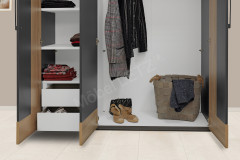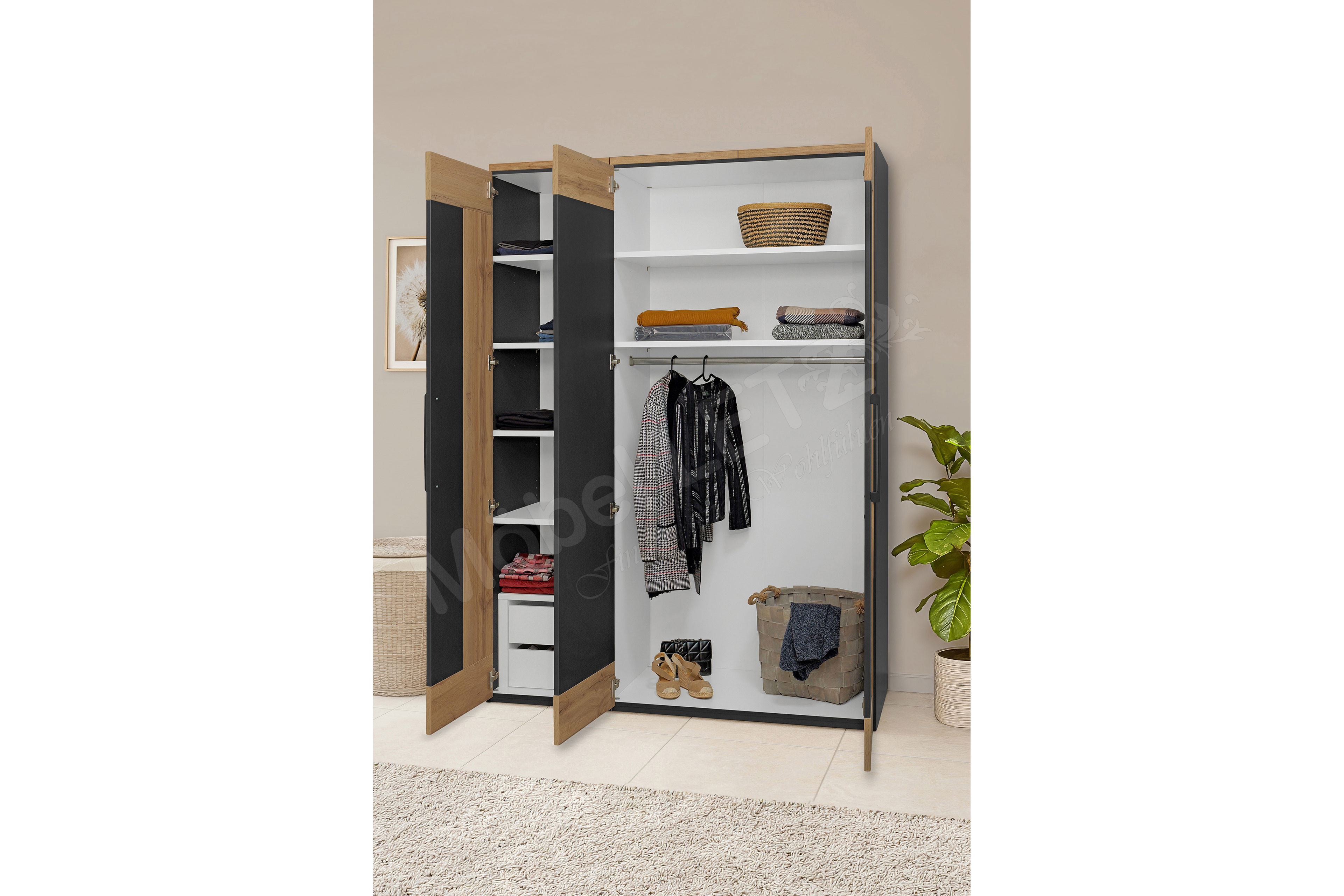 Der 3-türige Röhr-Bush Kleiderschrank aus dem Programm cadre.plus, einer Einrichtungskollektion für modernes, junges Wohnen, überzeugt optisch mit seiner Ausführungskombination, die auf edlem Anthrazit und natürlich wirkender Votan Eiche Nachbildung beruht, während die mittige Tür mit einer Spiegelfläche versehen ist. Der Innenraum des Schrankes weiß mit seiner strukturierten Aufteilung zu überzeugen, da die Inneneinrichtung standardmäßig aus einem links befindlichen, etwa 50 cm breiten Wäschefach mit vier Böden und einem rechts befindlichen, etwa 100 cm breiten Kleiderfach mit zwei Böden sowie einer Kleiderstange besteht. Außerdem erhalten Sie in diesem Angebot noch einen schmalen weißen Schubkasteneinsatz mit zwei Fächern, den Sie in das Wäsche-Abteil integrieren können, sodass Sie dort auch eine perfekte Aufbewahrungsmöglichkeit für kleinteilige Textilien haben. Auch die Dämpfungsbeschläge für die drei Drehtüren sind bereits im Lieferumfang enthalten, sodass Ihnen ein flüsterleises Schließen der Schrank-Türen möglich ist. Der Röhr-Bush Schrank cadre.plus - Anthrazit trifft Votan Eiche, Ordnung trifft Design.