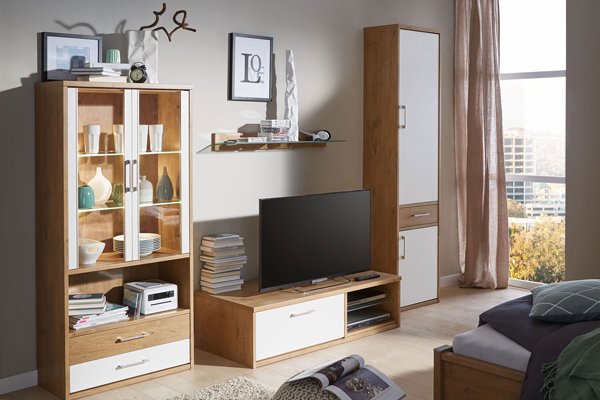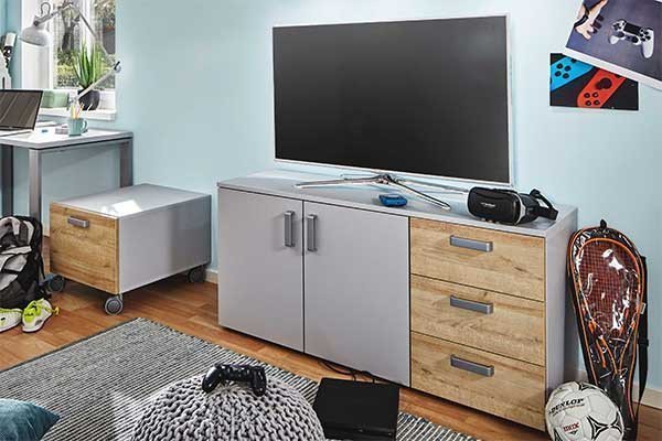 Vielfach enthalten Jugendzimmer auch einen Wohnbereich, an den sich der Jugendliche tagsüber, nachdem die Hausaufgaben erledigt sind, zurückziehen kann, um seine Freizeit zu verbringen. Oft sind Unterhaltungsmedien, wie etwa ein Fernseher, ein DVD-Player oder die Spielekonsole, auf einem Lowboard bzw. in dessen offenen Fächern untergebracht. Mal ist das Lowboard Teil einer Wohnwand, mal ist es als einzelnes TV-Möbel solitär im Jugendzimmer platziert. Teenager nennen oftmals eine große Anzahl von Hi-Fi-Geräten ihr Eigen und möchten, gerade im Alter ab 14 oder 15 Jahren, meist nicht mehr gemeinsam mit den Eltern vor dem Fernseher sitzen. Gehen Kinder mit großen Schritten auf das Erwachsenenalter zu, ist es wichtig, dass sie ihre eigenen Rückzugsräume bekommen, um sich ihrer Entwicklung gemäß zu entfalten. Auch wenn Ihr Kind Freunde zu Gast hat, ist es für alle Seiten am angenehmsten, wenn sich die Teenager im Zimmer Ihres Sohnes oder Ihrer Tochter aufhalten können, ohne von den Erwachsenen gestört zu werden. Schließlich wissen wir alle: Die Pubertät ist das Alter, in dem die Eltern anfangen, komisch zu werden. Das ist Grund genug, Teenagern in ihrem Jugendzimmer den Freiraum zu geben, den sie sich wünschen und immer mehr zu beginnen, dem Heranwachsenden bei der eigenen Freizeitgestaltung freiere Hand zu geben, als es noch im Kindesalter der Fall war. Wie ginge das besser, als Ihrem Nachwuchs für das eigene Jugendzimmer eine Wohnwand, ein TV-Möbel und ein geräumiges Regal zu spendieren?
