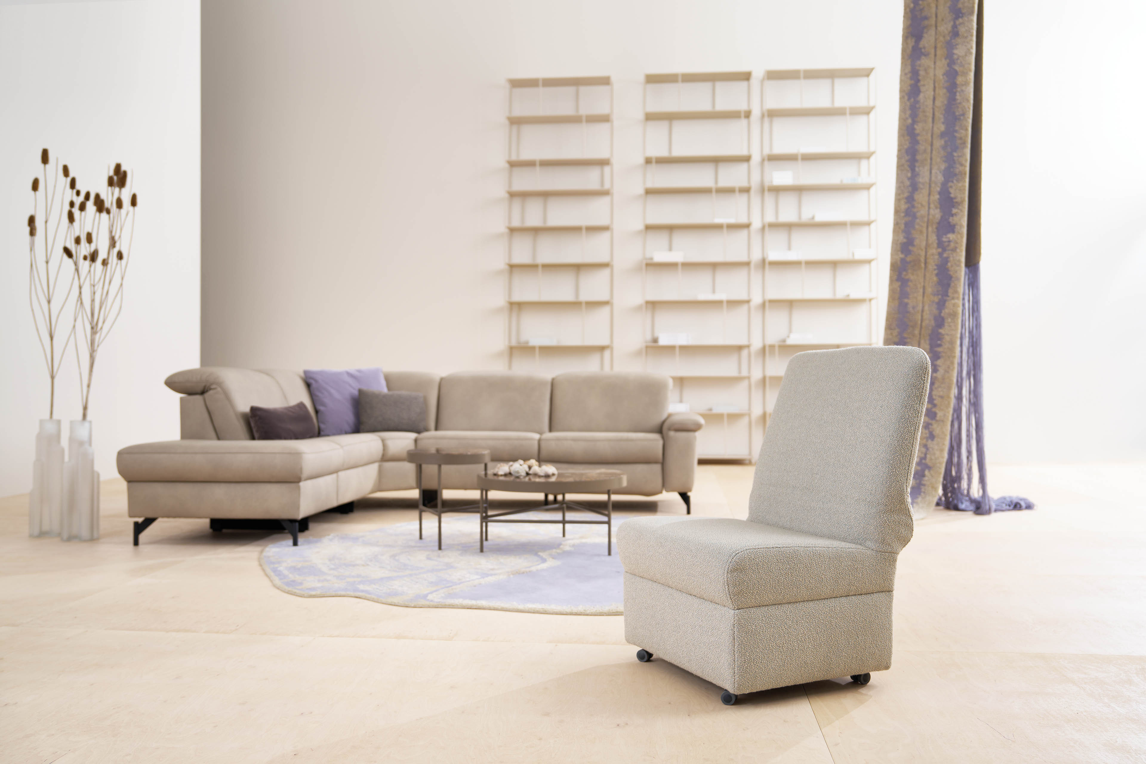 Mit dem Modell 7598 aus dem Hause Himolla Polstermöbel erhalten Sie ein wandelbares Möbelstück, welches sich perfekt in jeden Wohnraum integrieren lässt. So unscheinbar der Hocker mit seinem zeitlosen Design auf den ersten Moment auch wirkt, kann er im Handumdrehen aufgeklappt und zu einem gemütlichen Sessel umfunktioniert werden. Somit dient der Solist nicht nur als die ideale Möglichkeit, um am Abend die schweren Beine behutsam hochzulegen, sondern gleichfalls als harmonische Ergänzung und Erweiterung um einen zusätzlichen Sitzplatz neben der vorhandenen Polstergarnitur, wobei auch der Sitzgenuss, dank der Polsterung aus Formasoft Polyschaum, auf keinen Fall zu kurz kommt sowie ein komfortables Verweilen garantiert ist. Mit den integrierten Rollen kann der formschöne Sessel-Hocker zudem mühelos im Raum bewegt werden und zu jeder Zeit seinen Bestimmungsort ändern. Sei es vor dem großen Bücherregal, wenn man friedvoll in seinem Lieblingsbuch lesen möchte, oder bei spontanem Besuch von Freunden, wenn eine weitere Sitzgelegenheit erfordert wird. Ein weiterer Pluspunkt, der das geschmackvolle Erscheinungsbild ausmacht, ist das hochwertige Gewand aus Flachgewebe in der Farbe "silky", einem wunderschönen Beigeton, der für eine natürliche sowie geruhsame Atmosphäre sorgt. 7598 von Himolla - für Erholung und Entspannung vom Alltagsstress.