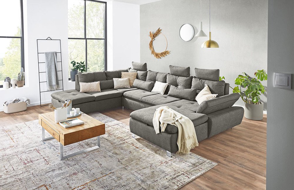 In unserem Angebot präsentiert sich das Modell Madeira vom Hersteller BENIX Polstermöbel in einer u-förmigen Zusammenstellung aus einem 1-Sitzer mit Abschlusselement, einem Eckteil, einem 2-Sitzer sowie einem Longchair und in einem bezaubernden Bezugskleid aus Chenille-Flachgewebe in Braun-Grau. Ob beim leckeren Familienfrühstück am Sonntag oder beim lustigen Spielabend mit den besten Freunden - die Sofalandschaft bietet mit einer Stellfläche von etwa 235 x 350 x 184 cm ausreichend Platz für Sie sowie Ihre Liebsten und beschert mit ihrer Schaumstoffpolsterung, ruhend auf einer Wellenunterfederung, einen erstklassigen Sitzkomfort, welcher auch zum längeren Sitzenbleiben einlädt. Dank ihrer dezenten Farbgebung sowie der zurückhaltenden Chromfüße lässt sich die Couchgarnitur perfekt in jedes Wohnambiente integrieren und schafft ein harmonisches Erscheinungsbild. Nutzen Sie die Zusatzoptionen, um die Wohnlandschaft mit Funktionen auszurüsten: Neben einem praktischen Bettkasten, in dem sich Ihre Lieblingsutensilien griffbereit sowie ordentlich verstauen lassen, ist Madeira mit einer Schlaffunktion ausgestattet, welche die Polstergarnitur in eine ca. 282 x 136 cm große Liegefläche verwandelt und Ihnen einen großzügigen Raum für entspannte Momente schenkt. Außerdem haben Sie die Möglichkeit, dieses Schmuckstück mit Kopfstützen, die bei einem gemütlichen Anlehnen unterstützen und für eine angenehmere Sitzhaltung sorgen, sowie einem passenden Hocker zu ergänzen oder unter der Rubrik "Wunschbezug - Farbe ändern" das Gewand ganz auf Ihre Bedürfnisse anzupassen. Madeira von BENIX ist der ideale Ort zum Wohlfühlen, Träumen, Lachen und Zusammensein.