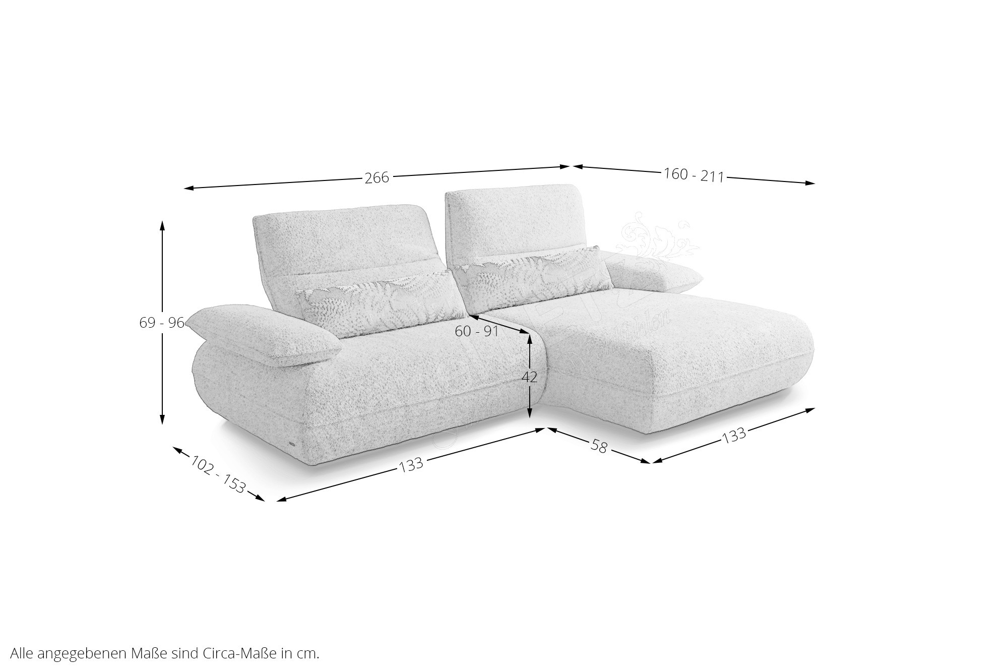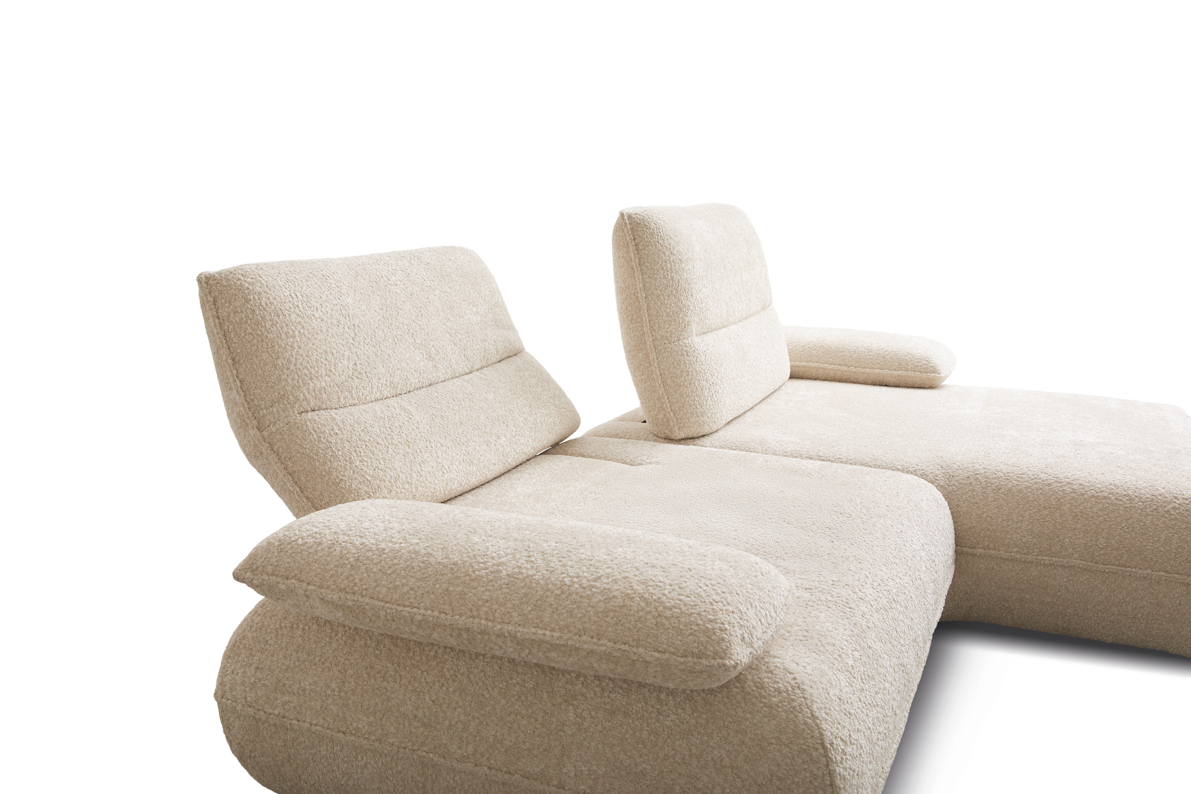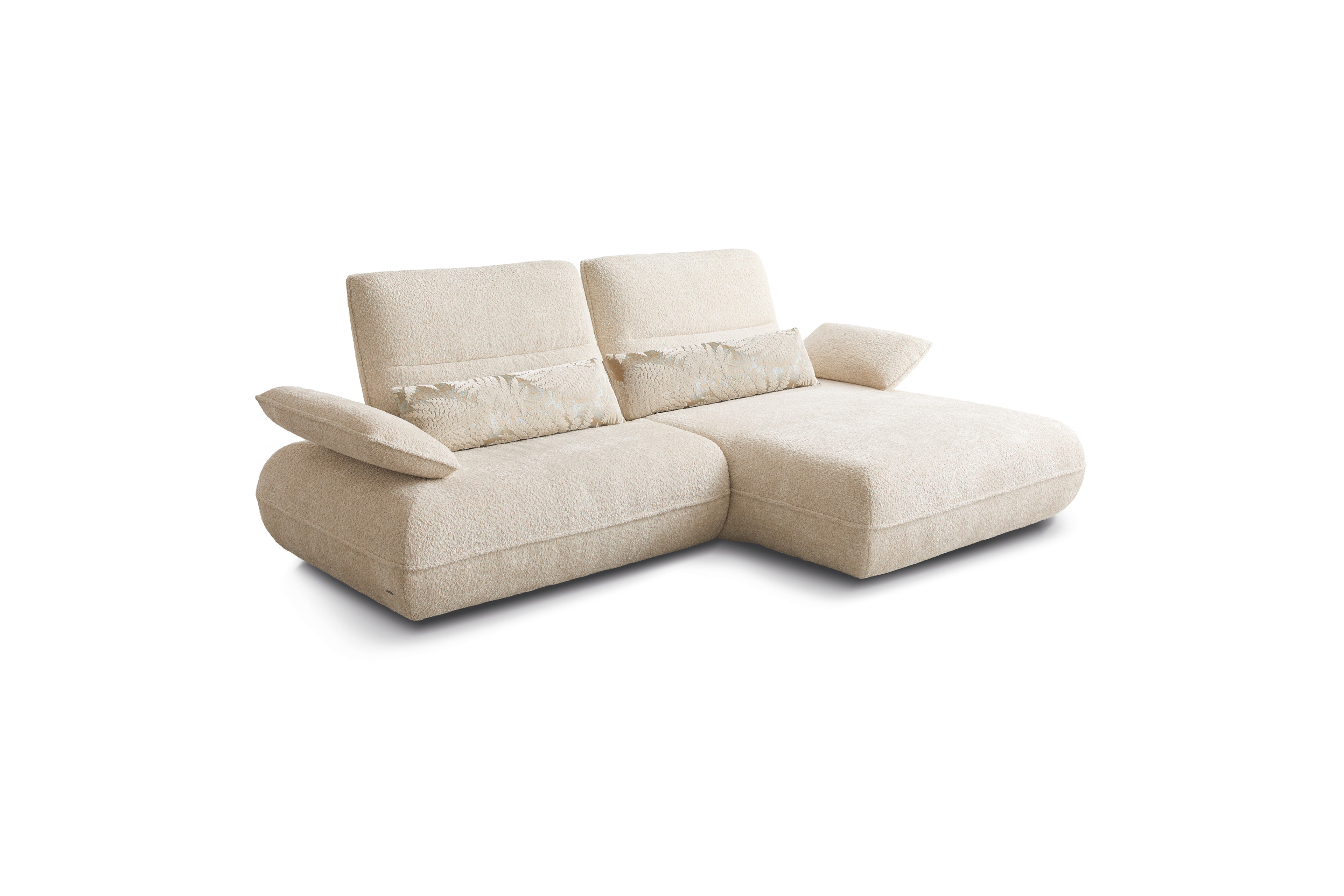Wohlfühlmomente länger genießen – mit dem kompakten Ecksofa Amy aus dem Hause KOINOR Polstermöbel werden Wohnträume wahr. Die Zusammenstellung aus einem großen 1-Sitzer sowie einer großen Liege eröffnet ein Stellmaß von etwa 266 x 160-211 cm und lässt sich somit hervorragend in kleinere Wohnzimmer integrieren. Zudem lässt sich das Modell, dank seines echt bezogenen Rückens, auch als Raumteiler zwischen Wohn- und Essbereich platzieren. Das bodentiefe Volumen gepaart mit einer üppigen Formensprache lässt das Sofa kraftvoll und zugleich anziehend wirken, wohingegen sanfte Rundungen sowie das angenehm weiche Chenille-Flachgewebe in Creme das Äußere der Eckcouch charmant abrunden. Für den nötigen Komfort sorgt eine besonders legere Polsterung aus einem hochwertigen Polyschaum, welcher auf einer Wellenunterfederung ruht. Zudem ist das Modell von Haus aus mit zahlreichen Komfortfunktionen ausgestattet, um das Sitzerlebnis stets an Ihre individuellen Bedürfnisse anpassen zu können. So lässt sich die Sitztiefe durch das Zurücksetzen des Rückens auf großzügige ca. 91 cm erweitern, um eine behagliche Relaxposition einnehmen zu können. Der manuell verstellbare Rücken sowie die Armteile sorgen darüber hinaus für ein ergonomisch anschmiegsames Wohlbefinden in jeder Position. Aufrecht sitzen oder relaxt liegen – mit der Polstergarnitur Amy von KOINOR bleiben keine Wünsche offen.