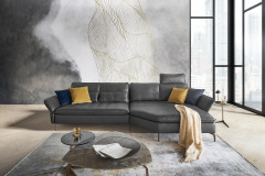 Mit der Eckgarnitur MR 2340 von Musterring erhalten Sie ein Möbelstück, welches Ihr Zuhause mit modernem Look, großzügiger Sitzfläche sowie einer hochwertigen Polsterung bereichert. Sie sind geschafft vom Tag und sehnen sich nach einer kleinen Auszeit? Dann nehmen Sie Platz auf der ca. 338 x 160 cm großen Couchgarnitur, welche mit ihrer ergo-PUR-Schaum gepolsterten Sitzfläche, getragen von dauerelastischen Wellenfedern, für ein herrliches Sitzerlebnis sorgt, und genießen Sie gemütliche Stunden mit einem guten Buch oder einer spannenden Serie. In unserem zauberhaften Angebot präsentiert sich das Schmuckstück mit einem dunkelgrauen Ledergewand sowie mit bronzefarbenen Metallfüßen. Diese Farbkombination harmoniert nicht nur perfekt miteinander, sondern wird zu einem stilvollen Highlight und verleiht jedem Wohnraum einen eleganten sowie einzigartigen Charme. Aber auch in puncto Funktion kann das Musterring Sofa überzeugen: Die im 2-Sitzer enthaltene Sitztiefenverstellung, ermöglicht durch das Zurücksetzen der Rückenlehne, die Sitztiefe von etwa 63 cm auf ca. 81 cm zu erweitern. Ideal für ein aufrechtes Sitzen beim Lesen oder ein entspanntes Zurücklehnen. Außerdem lässt sich MR 2340 mit einer Seitenteilverstellung ausstatten, sodass Sie die Armlehnen auf Ihre gewünschte Position stufenweise anpassen können. Über die Zusatzoptionen haben Sie die Möglichkeit, diese sowie auch Kopfstützen hinzuzubuchen oder aus verschiedenen Fußvarianten auszuwählen. Zudem finden Sie darüber hinaus Kissen, welche das Gesamtbild optimal ergänzen und den Wohlfühlfaktor erhöhen. Sie sind begeistert, aber das Äußere passt nicht zu Ihrem bestehenden Wohnkonzept? Kein Problem! Mit einem Klick auf "Farbe ändern" haben Sie die Wahl, zwischen dezenten oder kräftigen Farbnuancen sowie verschiedenen Bezugsmaterialien. Für noch mehr Gestaltungsfreiheit steht Ihnen der Polsterplaner zur Verfügung. So können Sie aus diversen Elementen auswählen und Ihr Traumsofa nach Ihrer Einrichtung sowie Ihrem Platzangebot konfigurieren. Setzen Sie ein Design-Statement und erleben Sie erholsame Momente mit der Polstergarnitur MR 2340 von Musterring.