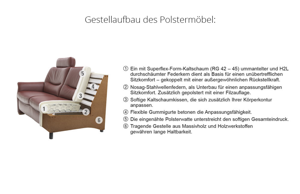 - Sitz: H2L - mit Superflex-Form-Kaltschaum ummantelter und durchgeschäumter Federkern auf Nosag-Stahlwellenfedern
