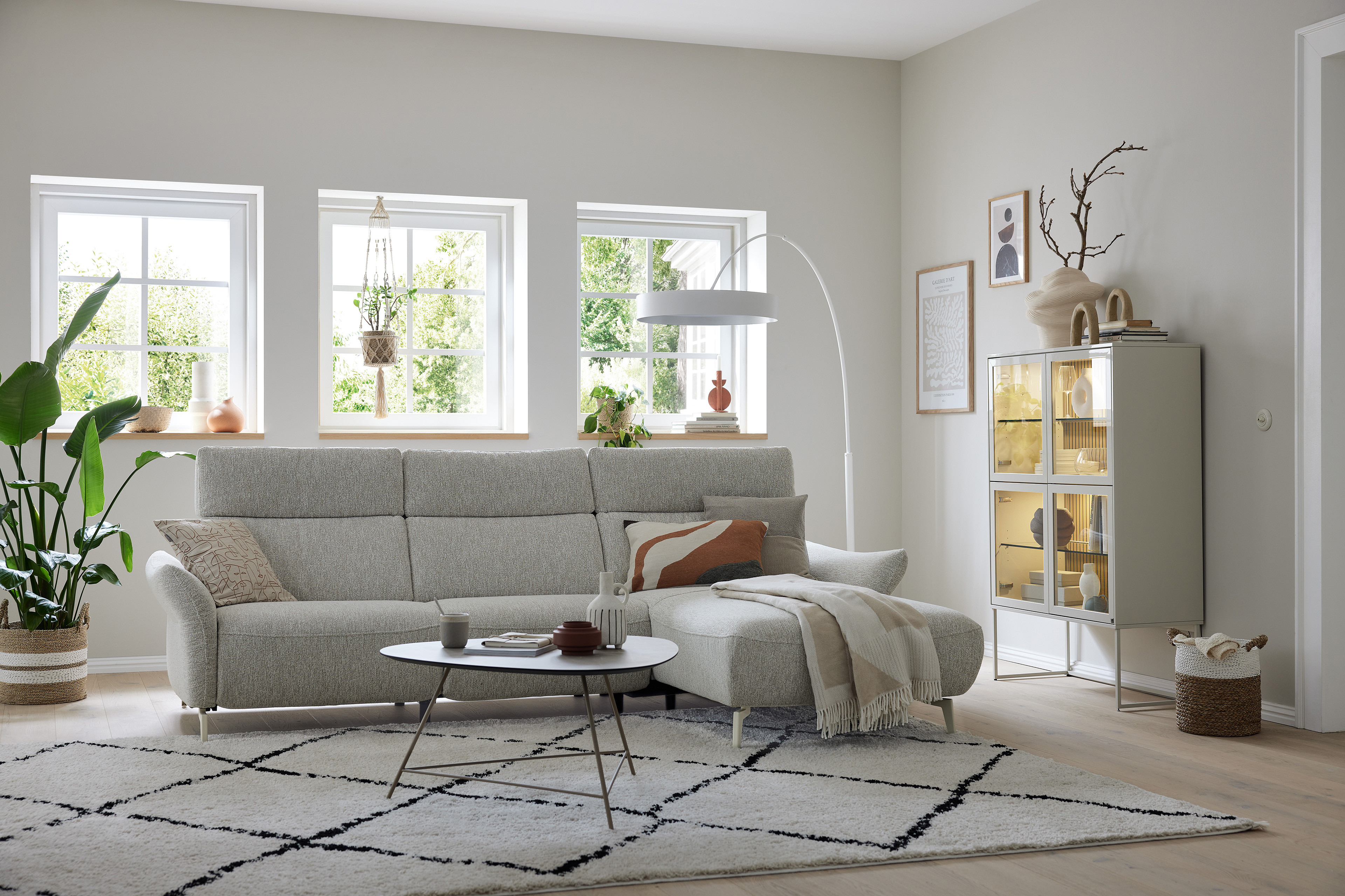 In stilsicherer Optik und mit einem Hauch Arroganz gestaltet die Eckgarnitur MR 280 von Musterring durch ihre reine Präsenz jeden Raum zu einem Ort, an dem Chic, Glamour und Ästhetik die Oberhand gewinnen. Sowohl der cremefarbene Stoffbezug als auch die dazu passende Fußausführung lassen dieses markant designte Ecksofa in absoluter Eleganz erstrahlen. Zusammengesetzt aus einem 2,5-Sitzer sowie einem Canape, bringt das Modell bereits eine manuelle Kopfteilverstellung in seine neue Wirkungsstätte mit. Neben diesen behaglichen Komfort-Extras können Sie über unsere Zusatzoptionen ebenfalls den Härtegrad des Sitzes aus drei verschiedenen Optionen frei wählen, um Ihr neues Sofa ganz und gar auf Ihre Bedürfnisse abzustimmen. Ihnen gefällt die inkludierte Kopfteilverstellung, jedoch steht Ihnen ab und an der Sinn danach, sich entspannt zurückzulehnen? Dann wird Sie die hinzubuchbare WallAway-Funktion sicherlich begeistern. Über die seitlich im Sitz liegenden Touch-Buttons können Sie den Neigungswinkel der Rückenlehne ganz nach Belieben einstellen und sich sowohl in Ihre Wunschposition fallen als auch die Seele baumeln lassen. Ob in Stoff oder Leder, mit dekorativen Zierkissen oder ohne jegliche Ablenkung vom eigentlichen Erscheinungsbild - mit der Polstergarnitur MR 280 von Musterring werden Lifestyle, Moderne und absolute Gemütlichkeit Einzug in Ihre vier Wände halten. Zögern Sie also nicht und bestellen Sie diese hinreißende Schönheit noch heute!