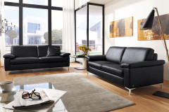 Mit dem Polsterduo zieht bei Ihnen ein Modell ein, welches Ihr Zuhause mit moderner Optik sowie einer angenehmen Polsterung aus Polyätherschaum mit eingearbeitetem Federkern und ruhend auf dauerelastischen Wellenfedern bereichert - MR 2875 von Musterring. Bestehend aus einem 2-Sitzer mit einem Platzangebot von ca. 184 cm und einem 2-Sitzer mit einer Breite von etwa 204 cm wird Ihnen ausreichend Fläche geboten, um beim gemütlichen Zusammensitzen mit Ihren Liebsten den spannenden Gesprächen zu lauschen oder in Ruhe den Morgenkaffee am Sonntag zu genießen. Mit ihrem schwarzen Ledergewand lässt sich die Musterring Garnitur nicht nur optimal in moderne sowie klassische Einrichtungsstile integrieren, sondern es wird auch perfekt der luxuriöse Charakter zur Geltung gebracht und es werden zugleich stilvolle Akzente in Ihrem Wohnraum gesetzt. Über unsere Zusatzoptionen können Sie das Gesamtbild mit einem optionalen Sessel, welcher einen zusätzlichen Wohlfühlplatz bietet, sowie einem passenden Hocker, der ideal als bequeme Beinablage genutzt werden kann, komplettieren. Außerdem finden Sie dort die Möglichkeit, aus verschiedenen Sitz- sowie Rückenhöhen, Polsterungen, Seitenteilen und Fußvarianten auszuwählen. Natürlich ist das Modell in anderen Farben sowie in einer anderen Zusammenstellung erhältlich, sodass es zu Ihren Vorstellungen passt: Eine umfangreiche Bezugskollektion mit diversen Materialien sowie Farbtönen erhalten Sie unter der Rubrik "Wunschbezug - Farbe ändern" und mithilfe unseres Polsterplaners, welcher eine vielfältige Auswahl an unterschiedlichen Elementen bereitstellt, können Sie Ihre Traumoase nach Ihren Wünschen gestalten. Erleben Sie erholsame Stunden allein oder kuschelige Momente mit der Familie mit unserem attraktiven Polstersofa MR 2875 von Musterring.