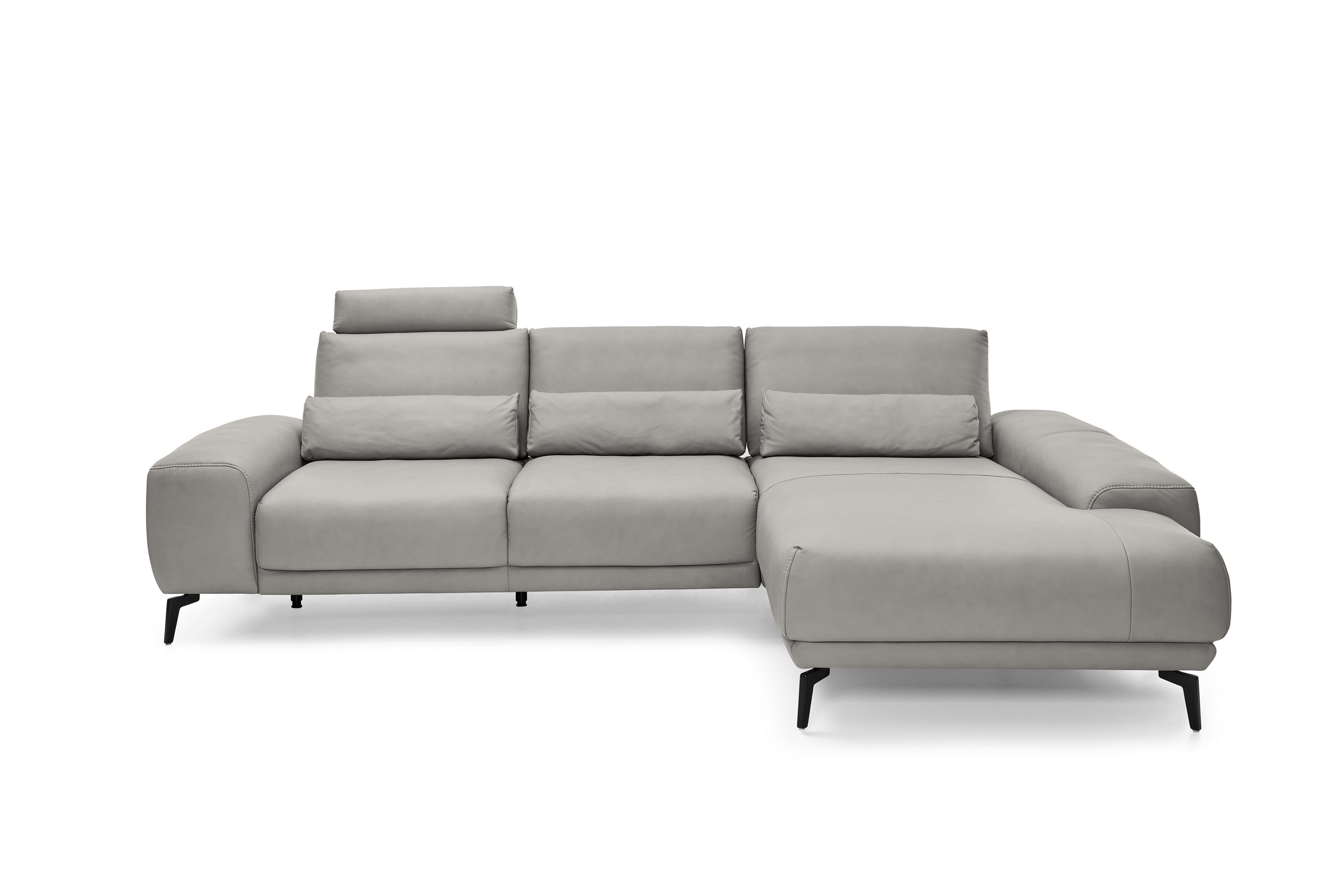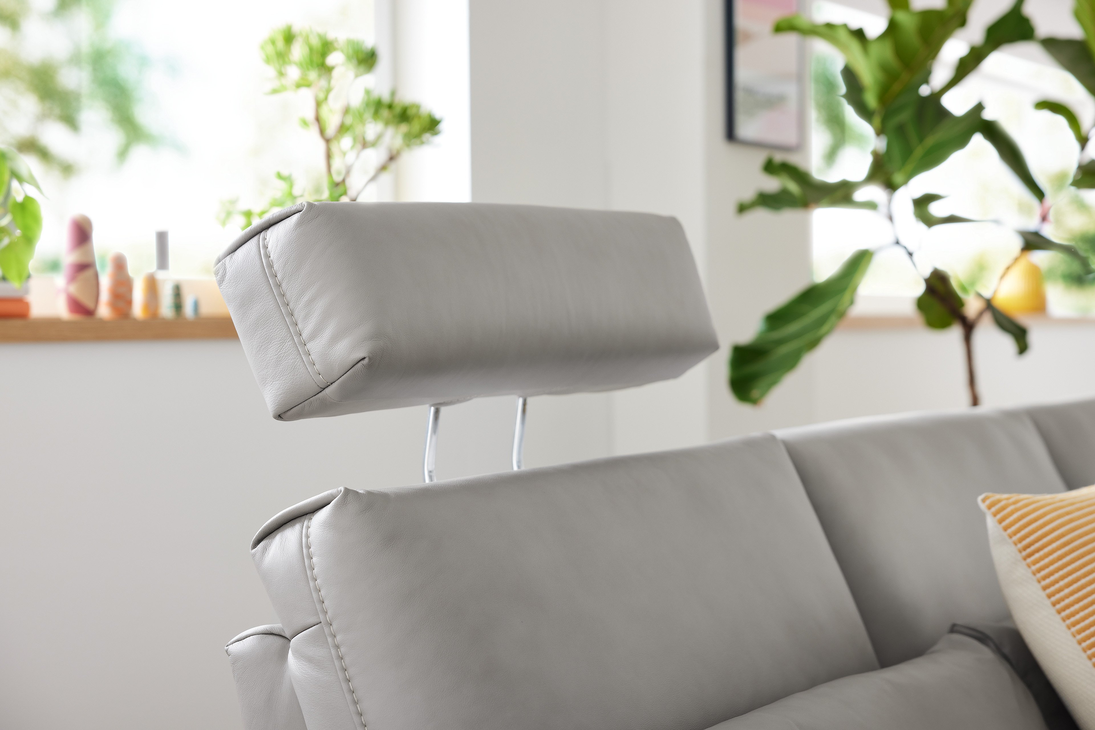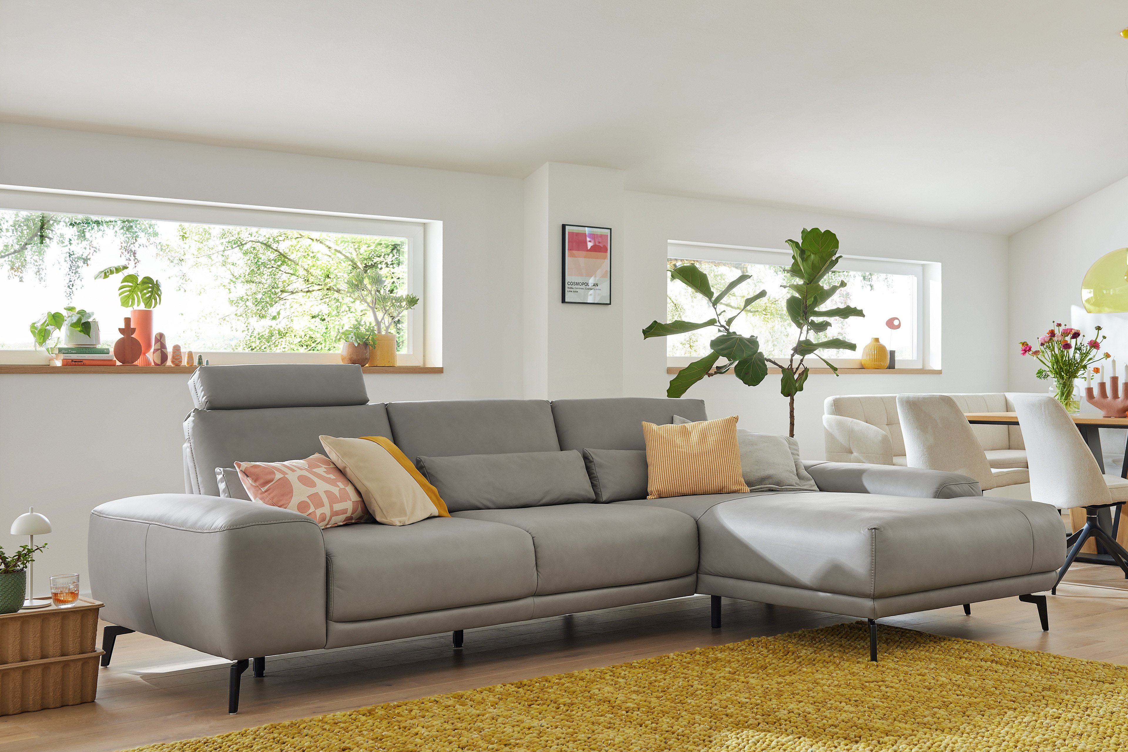 Diese Musterring Polstergarnitur ist nicht nur ein Platz zum Sitzen, sondern der perfekte Ort zum Leben - Modell MR 290. Mit einer großzügigen Zusammenstellung aus einem 2,5-Sitzer sowie einem Canape bietet diese Eckcouch ausreichend Fläche für erholsame Momente nach einem ereignisreichen Tag oder, um ein gemütliches Beisammensein mit den Freunden zu erleben und den Abend bei leckeren Snacks sowie kühlen Cocktails ausklingen zu lassen. Die stylishe Couchgarnitur ist mit einem hochwertigen Kaltschaum auf dauerelastischen Wellenfedern gepolstert, welche in Kombination mit einer angenehmen Sitzhöhe von ca. 46 cm, oder auf Wunsch auch mit ca. 48 cm, für ein herrliches Sitzempfinden beim entspannten Lesen oder Fernsehen sorgt. Über die Zusatzoptionen lässt sich MR 290 mit einer Sitztiefenverstellung ausstatten, welche durch das Anheben und Vorziehen der Rückenlehne die Sitztiefe von ca. 79 cm auf 61 cm verkürzt. Außerdem können Sie zwischen drei verschiedenen Metallfußvarianten auswählen. Zudem lässt sich das Möbelstück optimal mit Kissen, Kopfstützen und einem passenden Hocker ergänzen - so entsteht ein harmonisches Gesamtbild und es wird Ihnen noch mehr Komfort geschenkt. Bestellen Sie noch heute die ca. 307 x 199 cm große Polsterecke, welche sich mit ihrem grauen Ledergewand problemlos in jede Wohnwelt einfügt, und genießen Sie ganz bald Ihre neue Ruheoase - MR 290 von Musterring