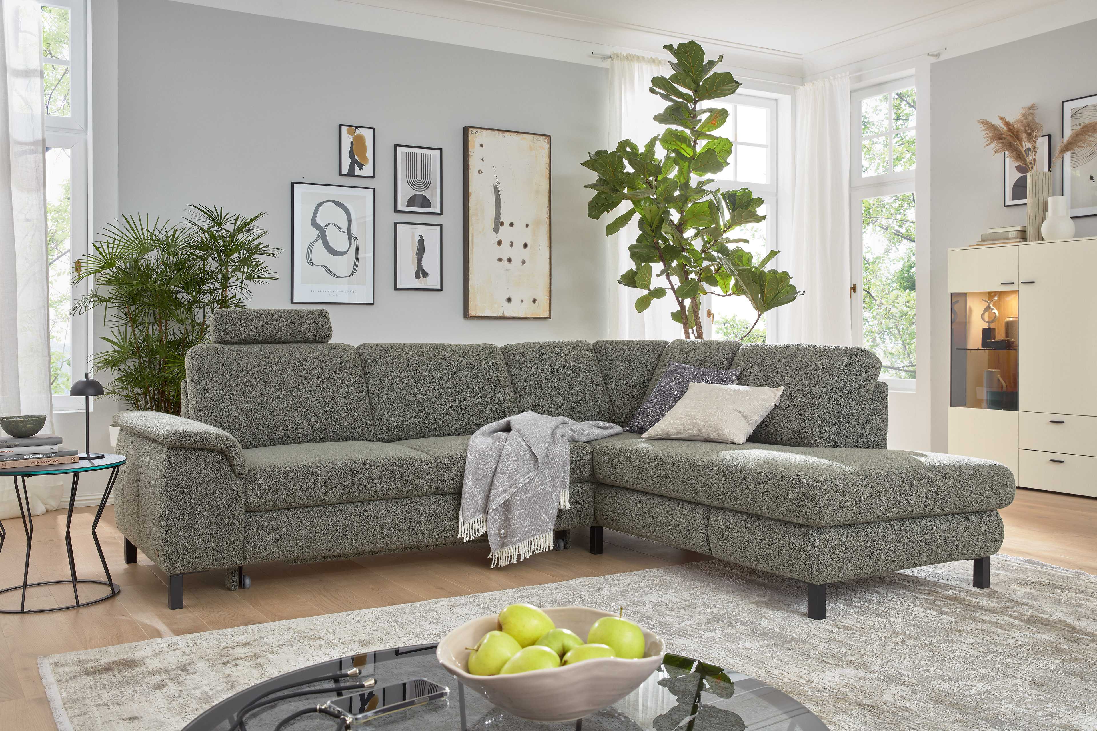 Bequemes Sitzen leicht gemacht – mit der Musterring Eckgarnitur MR 365. Einmal mehr wird hier ein Modell präsentiert, welches dank der wählbaren Sitzpolsterung aus einem PUR-Schaum oder einem Federkern nicht nur den passenden Sitzkomfort mit sich bringt, sondern ebenfalls für die richtige Portion Gemütlichkeit an jedem einzelnen Tag sorgen wird. Genießen Sie neben dem angenehmen Sitzgefühl auch eine ansprechende Optik, hervorgerufen durch den grünen Flachgewebe-Bezug sowie die dazu stimmigen schwarzen Metallfüße. Doch das puristisch designte Möbelstück macht nicht nur im Stoffgewand eine gute Figur. Nehmen Sie sich einen Moment Zeit und werfen Sie einen Blick in die vielfältige Bezugsübersicht unter dem Menüpunkt “Wunschbezug“. Hier wird selbst der größte Kritiker fündig und erschafft sich die ideale Polstergarnitur, abgestimmt auf seinen Geschmack und so gut wie jeden Einrichtungsstil. Sie erwarten mehr von einer Eckcouch als ein ansprechendes Äußeres und Gemütlichkeit? Kein Problem, den MR 365 kann auf Wunsch mit einer Schlaffunktion sowie einem Schubkasten ausgestattet werden. Somit erhalten Sie mehr Platz zum Relaxen und einen kleinen Stauraum, in welchem Ihre Lieblingsdecke perfekt aufgehoben ist. Weiterhin kann unser Angebot mit einem Hocker oder einer Hockerbank erweitert werden – ebenso besteht die Möglichkeit, variabel einsteckbare Kopfstützen, die Sie in gewünschter Anzahl direkt über unsere Zusatzoptionen zum Angebot hinzubuchen können, zu erwerben. Gestalten Sie Ihr Wohnzimmer mit der Polsterecke MR 365 von Musterring zu einem Ort der Harmonie sowie des Wohlgefühls, an dem gern verweilt und Entspannung großgeschrieben wird.