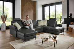 Sie sind auf der Suche nach einem neuen Polstermöbel, möchten mit diesem einen tollen Akzent in Ihrem Wohnraum setzen und auf Komfort sowie Qualität nicht verzichten? Dann schauen Sie sich dieses Angebot doch einmal etwas genauer an - PN-EM18013 von Polinova Polstermöbel. In einem anthrazitfarbenen Ledergewand und mit polierten Alufüßen zeigt sich die Polstergarnitur hier in einer u-förmigen Zusammenstellung aus einem Canape, einem 2,5-Sitzer Zwischen-Element sowie einem anschließenden 1-Sitzer Kombi-Element mit Anstellhocker. Mit einer großzügigen Stellfläche von ca. 168 x 305 x 200 cm ist für ausreichend Platz gesorgt, um einfach mal ganz für sich zu sein, mit dem Partner, der Familie oder Freunden ganz gemütlich beisammenzusitzen. Der von einem Polstervlies ummantelte Kaltschaum auf dauerelastischen Wellenfedern sorgt dabei für ein herrlich angenehmes Sitzgefühl. Um sich vielleicht ein Plus an Komfort zu gönnen, bietet der Hersteller für dieses Modell eine praktische Schlaffunktion, welche mit ein paar wenigen Handgriffen eine sagenhafte, ca. 254 x 125 cm große Liegefläche zum Ausstrecken, Beinehochlegen oder Schlafen zaubert, eine Stauraumfunktion sowie ein verstellbares Armteil. Dieses dient, etwas nach oben gestellt, als bequeme Armablage oder als Kopfstütze beim Liegen. Zudem lässt sich das Canape mit einem Motor für eine Verstellung bis zur Relaxposition ausstatten. Mit dieser Funktion kann die Sitzfläche kombiniert mit dem Rücken per Touch-Sensor genau so in Position gebracht werden, wie Sie es gerade wünschen - vom aufrechten Sitzen über Loungen mit leicht ausgefahrener Sitzfläche bis hin zur abgeschrägten Liegeposition. Passendes Zubehör, wie ein Sessel, ein Hocker, Kopfstützen sowie Zierkissen in gewünschter Anzahl, kann ebenfalls direkt über die Zusatzoptionen hinzugebucht werden. Dieses Polstermöbel-Programm bietet mit einem umfangreichen Typenplan, unterschiedlichen Fußausführungen, drei Polsterungen, zwei Armlehnenvarianten und Sitzhöhen sowie einer wunderschönen Bezugskollektion eine fantastische Planungsvielfalt und ist somit in zahlreichen weiteren Ausführungen lieferbar. Entscheiden Sie selbst, gestalten Sie ganz nach Ihren Wünschen sowie Vorstellungen und lassen Sie PN-EM18013 aus dem Hause Polinova zum neuen zentralen Treffpunkt in Ihren vier Wänden werden.
