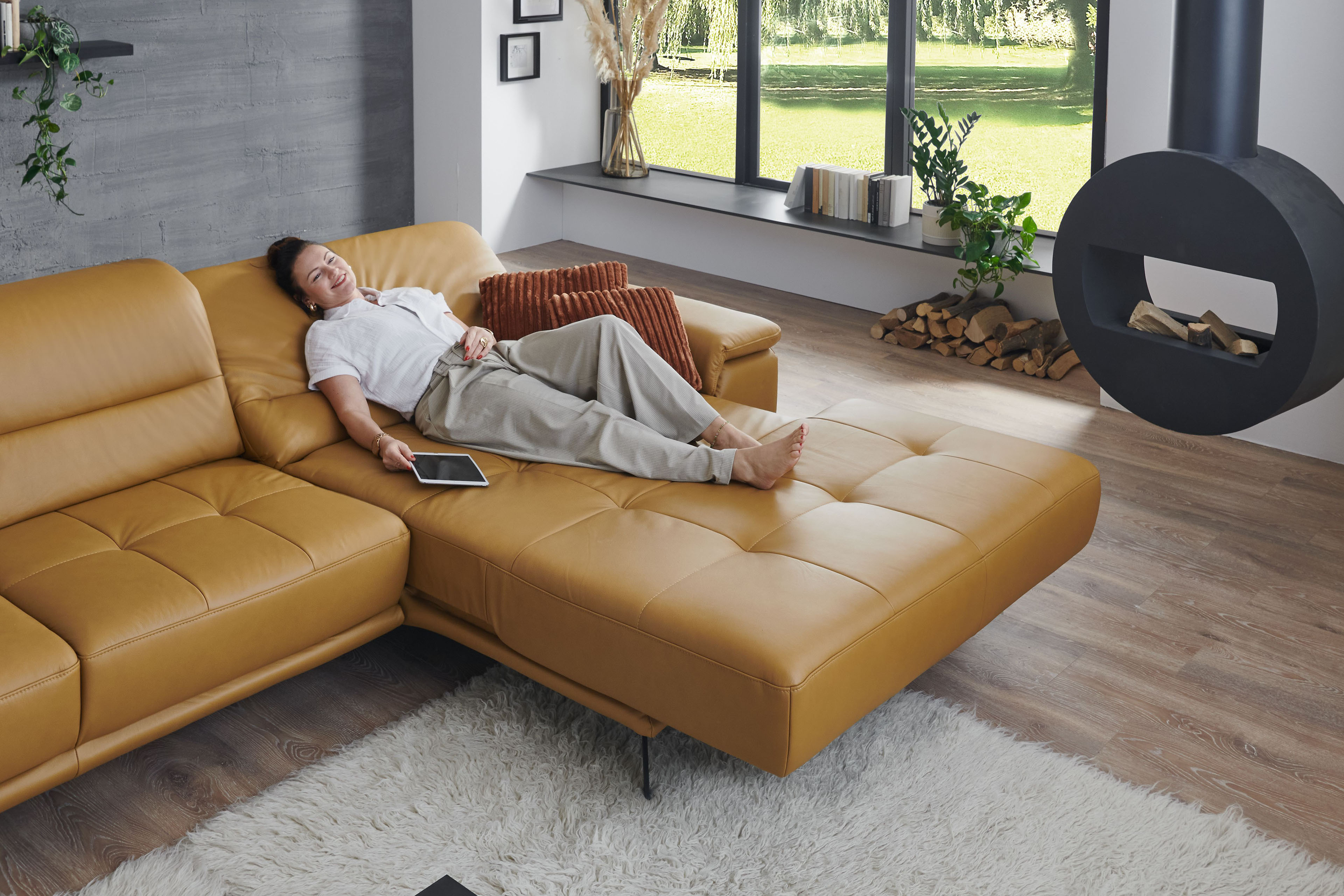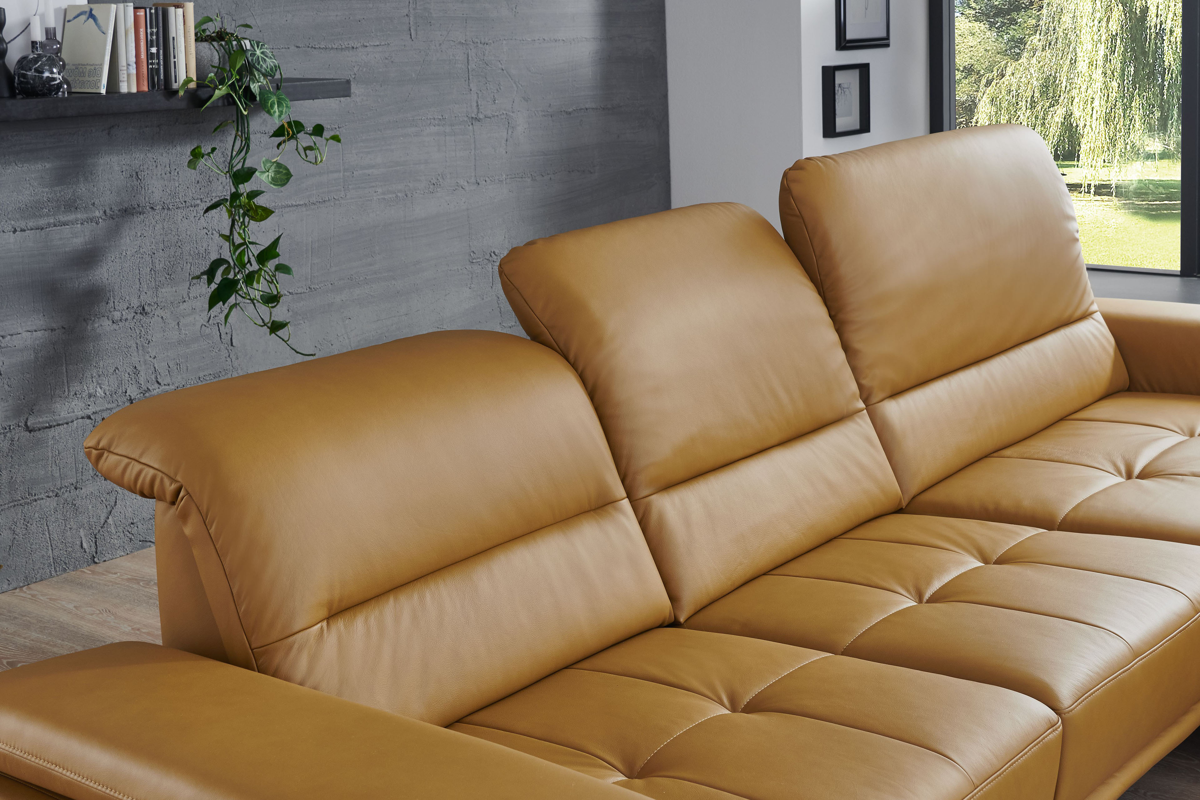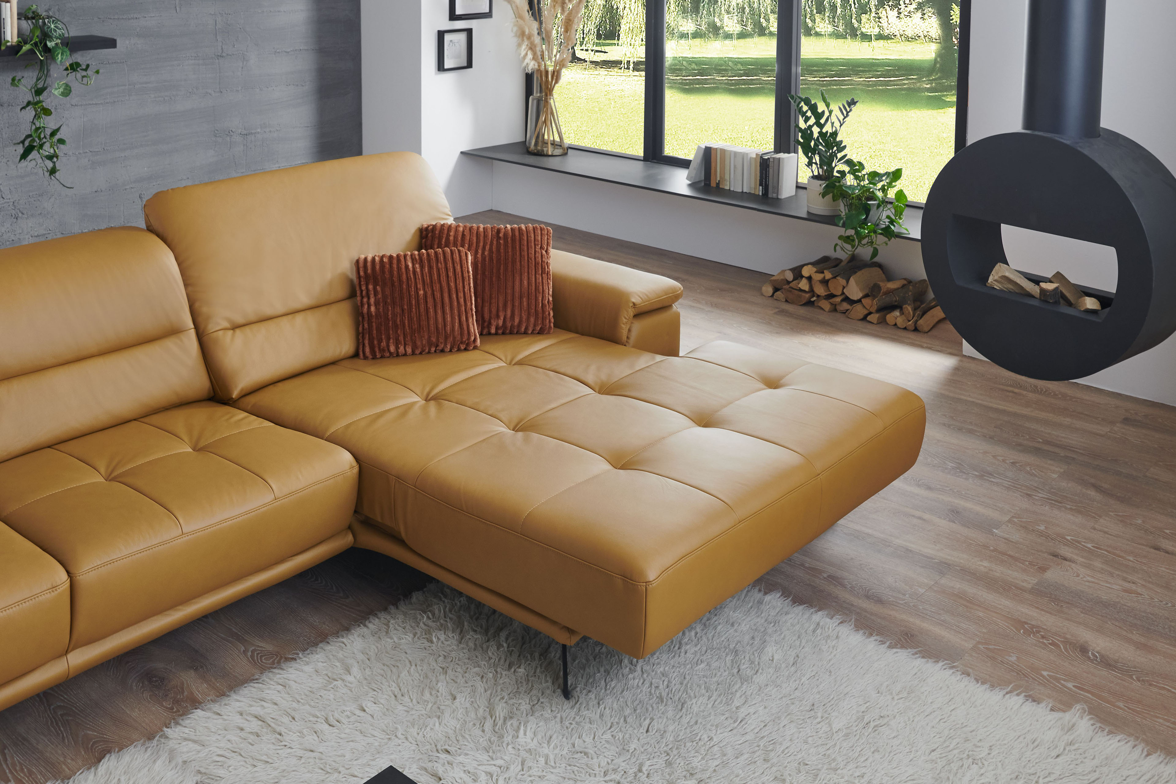 Ein gelungenes Zusammenspiel aus Design, Funktion und Komfort - PN-EM19074 von Polinova Polstermöbel. Sorgfältig ausgesuchte Materialien, ein hoher Qualitätsanspruch sowie eine perfekte, liebevolle Verarbeitung, welche sich besonders in der quadratisch abgesteppten Sitzfläche widerspiegelt, zeichnen dieses charmante Möbelstück aus. In der ca. 343 x 193 cm großen Eckvariante aus einem 3-Sitzer sowie einem Canape zeigt sich das Modell im schicken kurkumafarbenen Lederoutfit "Vivre" mit schlanken, schwarzen Metallfüßen, welche der Garnitur einige Zentimeter Bodenfreiheit verleihen und sich perfekt in das Gesamtbild integrieren. Zusammen mit einem Polsteraufbau, aufgebaut aus einem hochwertigen Kaltschaum auf dauerelastischen Wellenfedern, der sich sanft an die Körperkonturen anschmiegt, und der bereits integrierten Kopfteilverstellung ist von Grund auf schon ein herrliches Sitzgefühl garantiert. Lassen Sie sich trotzdem von der Vielfältigkeit dieser Polstergarnitur inspirieren und schauen Sie in unsere Zusatzoptionen - ein Blick lohnt sich allemal, denn hier steckt Bewegung drin. Für den 3-Sitzer können Sie eine Sitztiefenverstellung, für das Canape ebenfalls eine Sitztiefenverstellung oder eine motorische Verstellung bis zur abgeschrägten Liegeposition, für beide Elemente eine Armteilverstellung und dekorative Kissen in unterschiedlichen Ausführungen zum Grundangebot hinzubuchen. Eine alternative chromfarbige Fußausführung sowie eine beigefarbene Kontrastnaht, weitere Ledergruppen, zahlreiche Farben sowie eine Vielzahl an unterschiedlichen Elementen erlauben, mithilfe unseres Polsterplaners oder unserer freundlichen Einrichtungs-Experten, eine individuelle Zusammenstellung - zögern Sie also nicht und kreieren Sie ganz nach Ihren Wünschen sowie Vorstellungen - PN-EM19074 aus dem Hause Polinova.