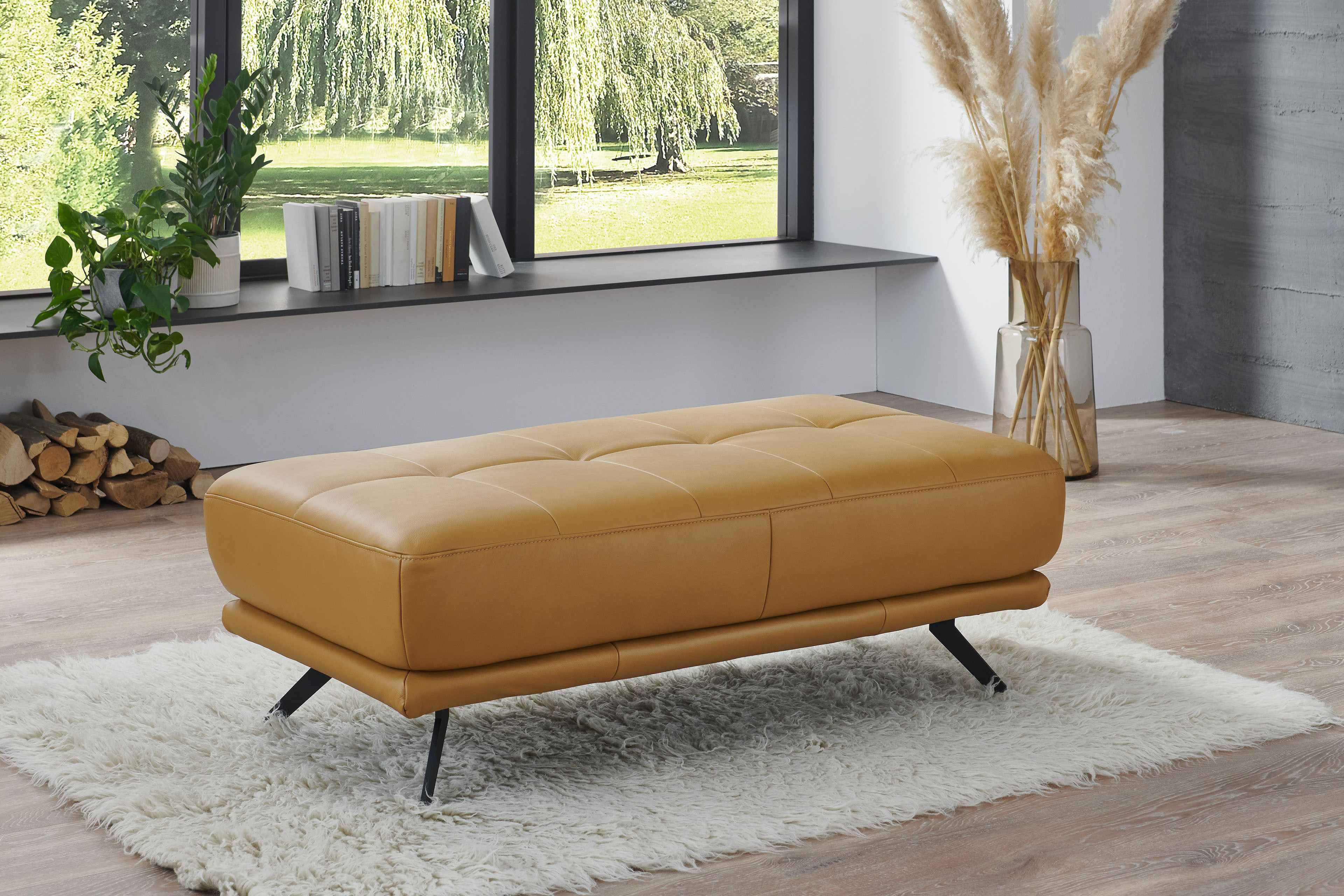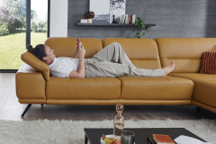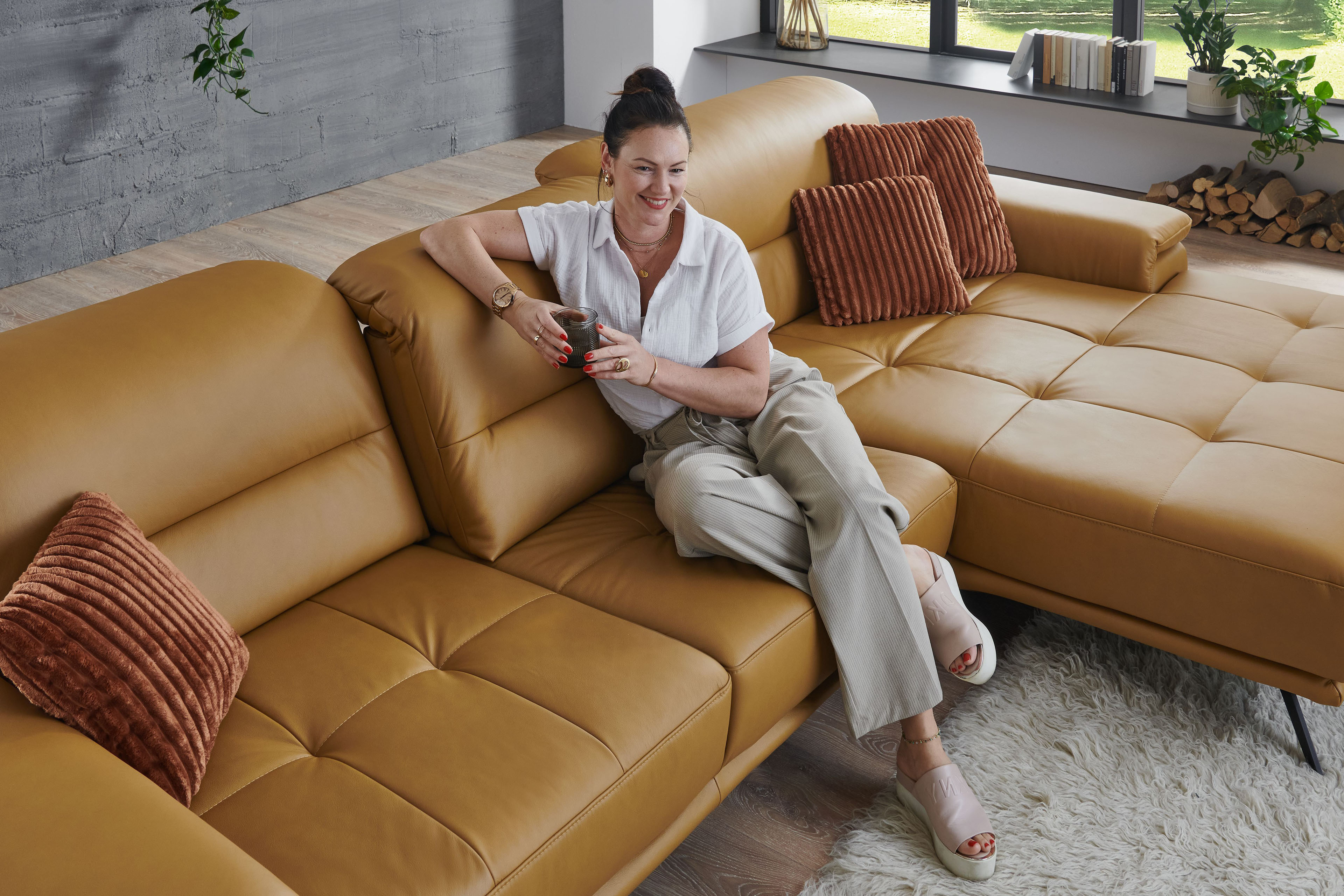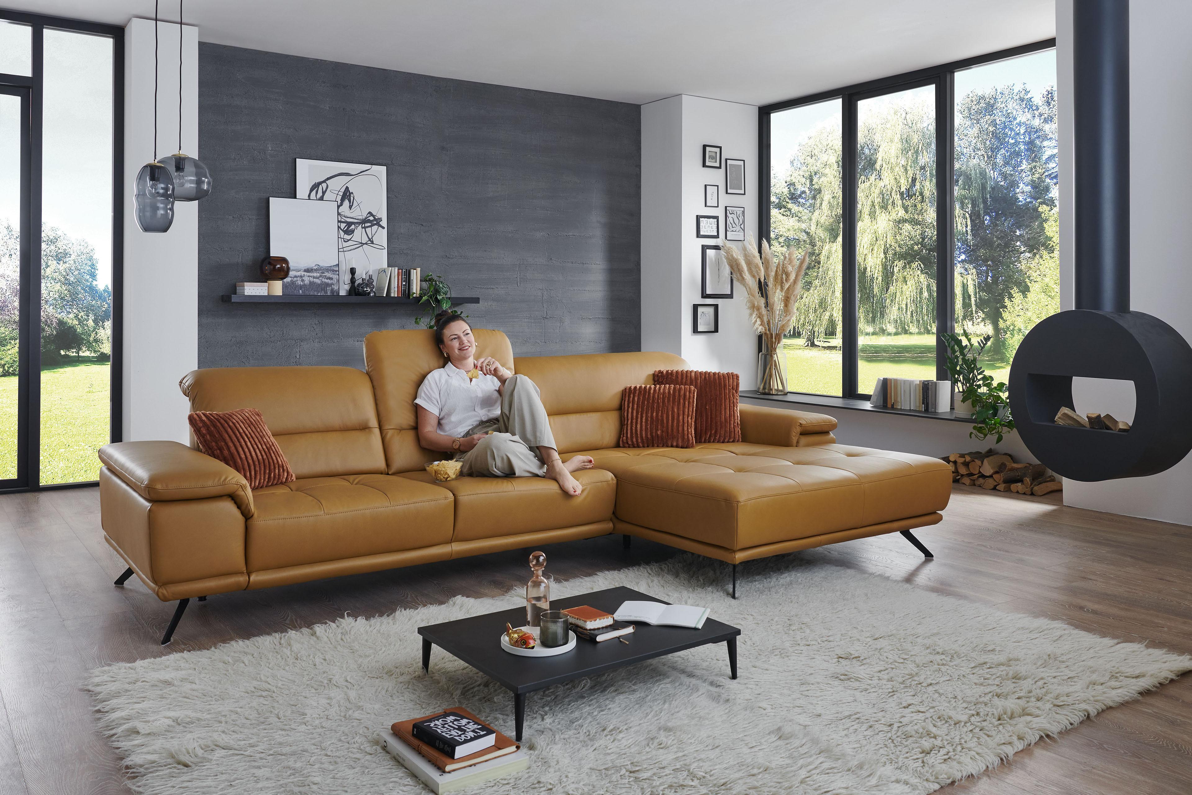 Ein gelungenes Zusammenspiel aus Design, Funktion und Komfort - PN-EM19074 von Polinova Polstermöbel. Sorgfältig ausgesuchte Materialien, ein hoher Qualitätsanspruch sowie eine perfekte, liebevolle Verarbeitung, welche sich besonders in der quadratisch abgesteppten Sitzfläche widerspiegelt, zeichnen dieses charmante Möbelstück aus. In der ca. 343 x 193 cm großen Eckvariante aus einem 3-Sitzer sowie einem Canape zeigt sich das Modell im schicken kurkumafarbenen Lederoutfit "Vivre" mit schlanken, schwarzen Metallfüßen, welche der Garnitur einige Zentimeter Bodenfreiheit verleihen und sich perfekt in das Gesamtbild integrieren. Zusammen mit einem Polsteraufbau, aufgebaut aus einem hochwertigen Kaltschaum auf dauerelastischen Wellenfedern, der sich sanft an die Körperkonturen anschmiegt, und der bereits integrierten Kopfteilverstellung ist von Grund auf schon ein herrliches Sitzgefühl garantiert. Lassen Sie sich trotzdem von der Vielfältigkeit dieser Polstergarnitur inspirieren und schauen Sie in unsere Zusatzoptionen - ein Blick lohnt sich allemal, denn hier steckt Bewegung drin. Für den 3-Sitzer können Sie eine Sitztiefenverstellung, für das Canape ebenfalls eine Sitztiefenverstellung oder eine motorische Verstellung bis zur abgeschrägten Liegeposition, für beide Elemente eine Armteilverstellung und dekorative Kissen in unterschiedlichen Ausführungen zum Grundangebot hinzubuchen. Eine alternative chromfarbige Fußausführung sowie eine beigefarbene Kontrastnaht, weitere Ledergruppen, zahlreiche Farben sowie eine Vielzahl an unterschiedlichen Elementen erlauben, mithilfe unseres Polsterplaners oder unserer freundlichen Einrichtungs-Experten, eine individuelle Zusammenstellung - zögern Sie also nicht und kreieren Sie ganz nach Ihren Wünschen sowie Vorstellungen - PN-EM19074 aus dem Hause Polinova.