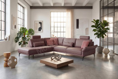 PN-EM24126 von Polinova - eine hervorragende Kombination aus schlichter Eleganz, hohem Komfort und einer Fülle an zusätzlichen Ausstattungen. Dieses stilvolle Ecksofa präsentiert sich in einer gelungenen Zusammenstellung aus einem 1,5-Sitzer mit Anstellhocker, einer Spitzecke sowie einem 3-Sitzer mit Armlehne, ist mit einem hochwertigen Semianilinleder in einem warmen, dunkel gehaltenen Farbton in Altrosa bezogen und wird von schlanken, schwarzen Metallfüßen getragen. Dank des zeitlosen Designs lässt sich das Polinova Sofa nahtlos in nahezu jeden Einrichtungsstil integrieren, ohne dabei aufdringlich zu wirken. Besonders hervorzuheben ist die exzellente Polsterung, die durch eine clevere Sandwichbauweise aus zwei unterschiedlichen Kaltschaumqualitäten gefertigt ist. Diese Materialien sind in verschiedenen Härten und Höhen kombiniert, um einen außergewöhnlichen Sitzkomfort zu bieten, der dazu einlädt, stundenlang entspannt zu verweilen. Mit einer beeindruckenden Stellfläche von ca. 254 x 298 cm präsentiert sich die Polsterecke als ideales Zentrum Ihres Wohnzimmers und bietet ausreichend Fläche, um auch Gästen bei geselligen Abenden einen bequemen Platz anzubieten. Sie könnte somit nicht nur Ihr persönlicher Rückzugsort, sondern auch der Mittelpunkt freundschaftlicher Begegnungen werden. Falls Sie Ihrem neuen Möbelstück noch mehr Individualität und Funktionalität verleihen möchten, stehen Ihnen eine Reihe optionaler Erweiterungen zur Verfügung. So bietet das Modell Optionen wie eine verstellbare Armlehne sowie in der Höhe und Neigung anpassbare Kopfstützen, wodurch der Sitzkomfort noch weiter optimiert werden kann. Für zusätzliche Akzente und ein Maximum an Gemütlichkeit können Sie Ihre Polstergarnitur mit Kissen in unterschiedlichen Ausführungen ergänzen. Diese kleinen Details verleihen Ihrer neuen Garnitur nicht nur eine besondere Note, sondern steigern zudem das Wohlfühlambiente erheblich. Zögern Sie nicht länger! Holen Sie sich noch heute Ihr persönliches Lieblingsmöbelstück für Ihr Zuhause - PN-EM24126 aus dem Hause Polinova.
