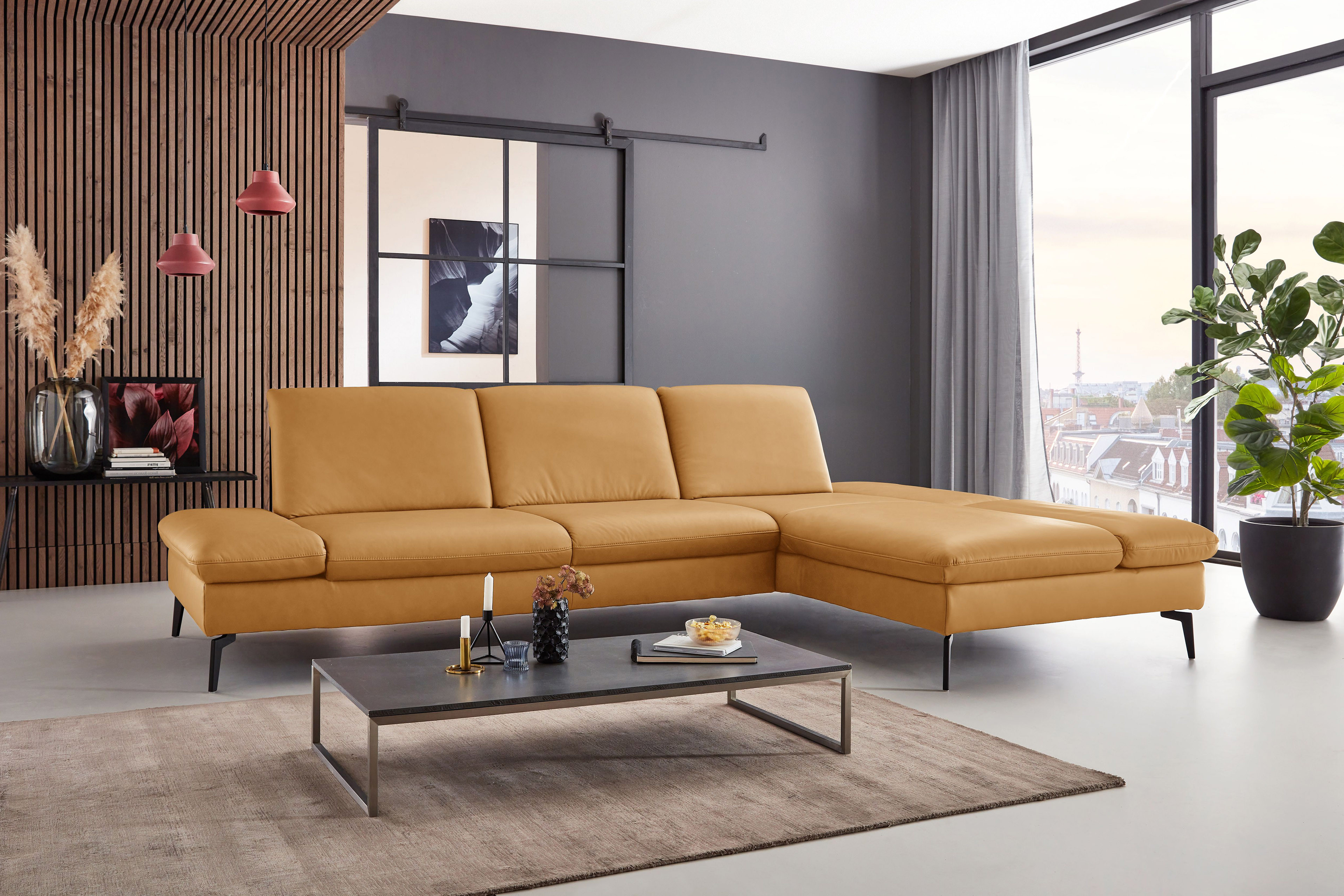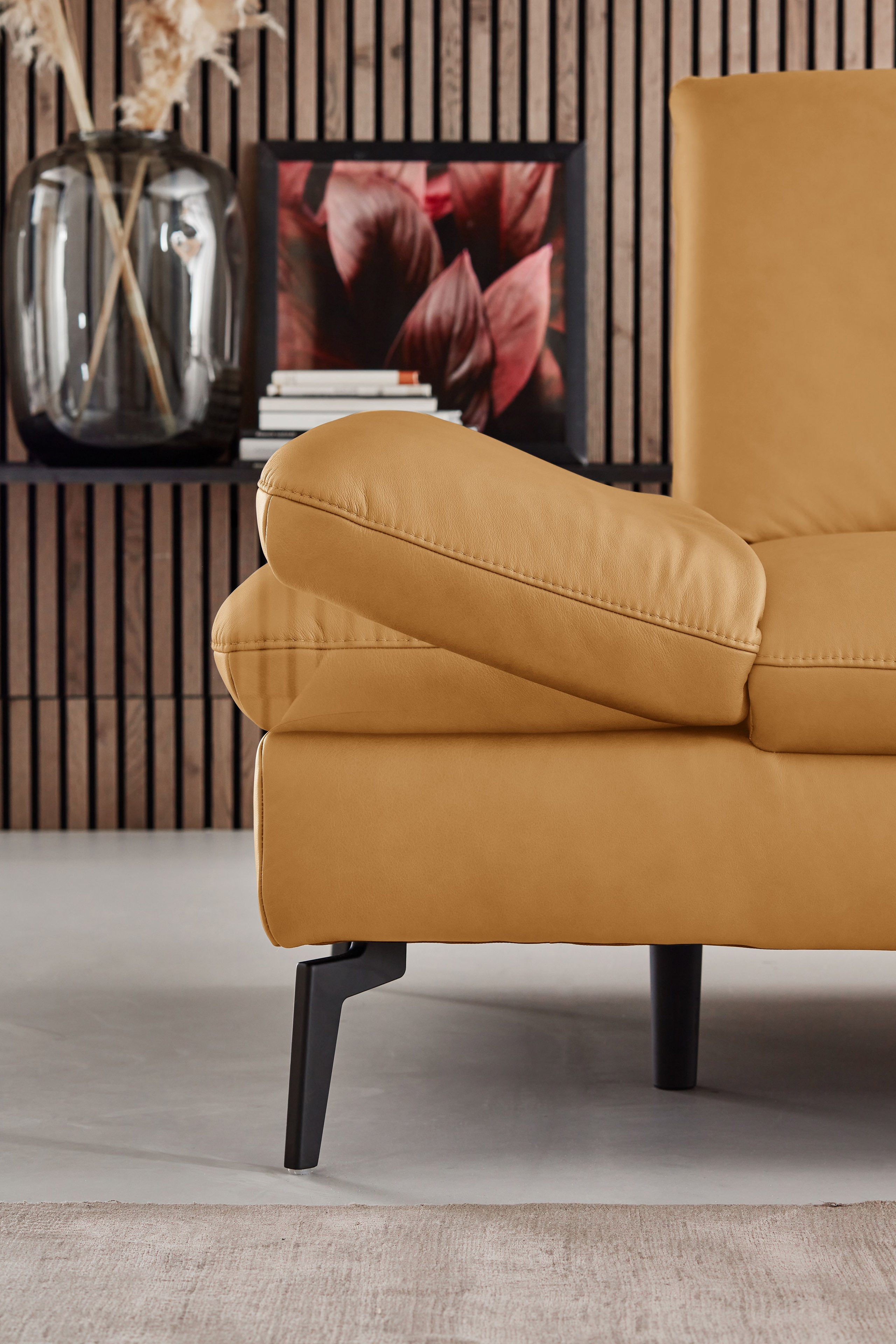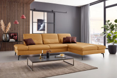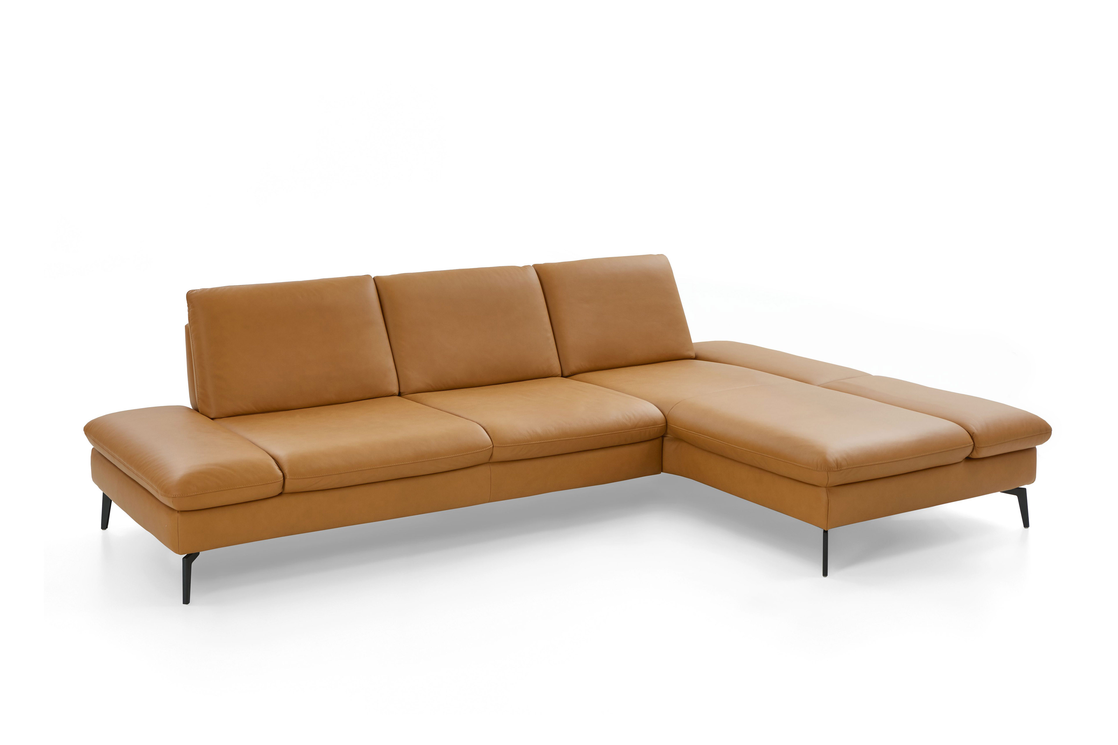 PN-IN23099 von Polinova - ein modernes, aber auch sehr elegantes Ecksofa, bestehend aus einem 3-Sitzer und einem Longchair mit doppelter Armlehne. Im hochwertigen Semianilinleder in der Farbe "kurkuma", welches sich nicht nur allein durch seine angenehm weiche Haptik und sein edles Erscheinungsbild auszeichnet, sondern bei dem auch natürliche Merkmale sowie Strukturen größtenteils erhalten bleiben, präsentiert sich die Eckgarnitur harmonisch und einladend im wunderschönen Design mit schlanken, schwarzen Metallfüßen. Diese geben der ca. 317 x 199 cm großen Polstergarnitur so viel Bodenfreiheit, dass sogar der Saugroboter problemlos unter dem Sofa seine Arbeit verrichten kann, lassen das Polstermöbel aber auch luftig-leicht und nicht zu schwer wirken. Doch nicht nur äußerlich stimmt einfach alles, auch was den Komfort angeht, kann sich das Modell absolut sehen lassen. Die beiden Seitenteile des Longchairs können modelltypisch mittels einer Rasterverstellung in verschiedene Positionen eingestellt werden, wobei das hintere Armteil komplett nach oben gestellt und zusammen mit dem optional erhältlichen Kissen mit Rolle eine gemütliche sowie kuschelige Ecke und das vordere Armteil, mit oder ohne Kissen mit Rolle, einen weiteren bequemen Sitzplatz schafft. Zudem besteht die Möglichkeit, die Garnitur mit einer Sitztiefenverstellung für eine weitere, verkürzte Sitztiefe und mit einer Armteilverstellung für den 3-Sitzer auszustatten, einen passenden Hocker, Kopfstützen, Nieren- sowie Zierkissen in gewünschter Anzahl hinzuzubuchen und aus zwei Sitzhöhen sowie zwei Polsterungen die für Sie passende zu wählen. Dieses Polstermöbel-Programm bietet in Sachen Flexibilität, Kombinations- sowie Bezugsvielfalt viel Gestaltungsfreiraum und ist in weiteren Zusammenstellungen sowie Farben mithilfe unseres Polsterplaners oder unserer Einrichtungs-Experten lieferbar - PN-IN23099 aus dem Hause Polinova.