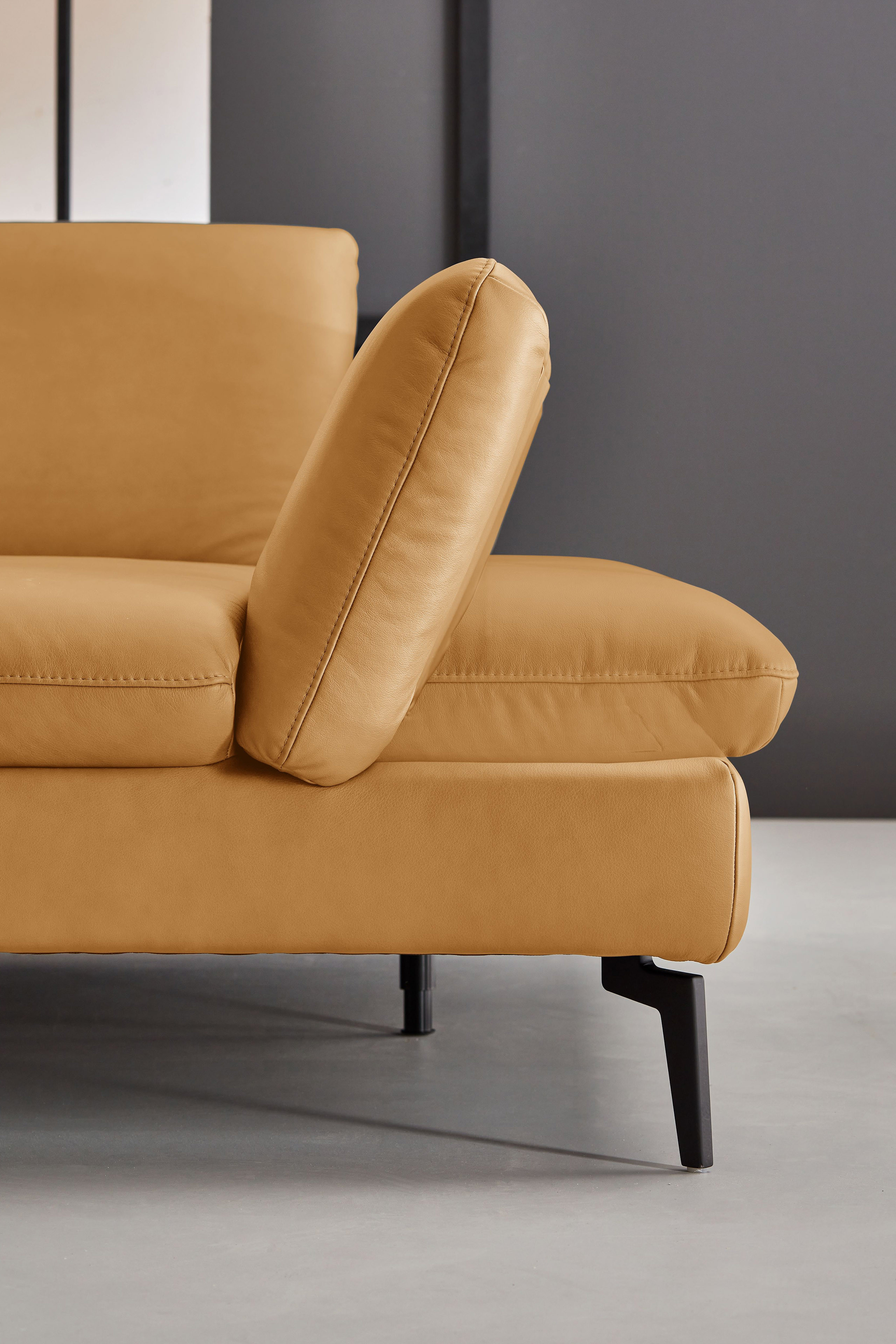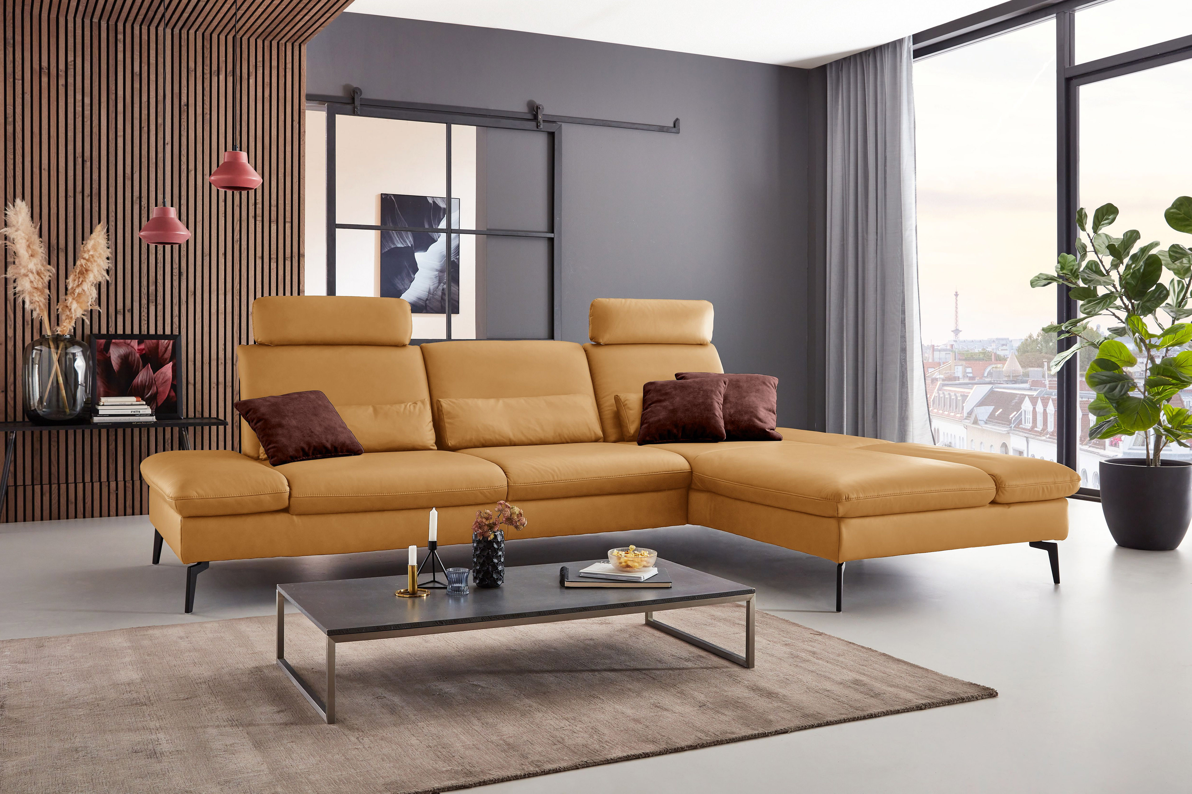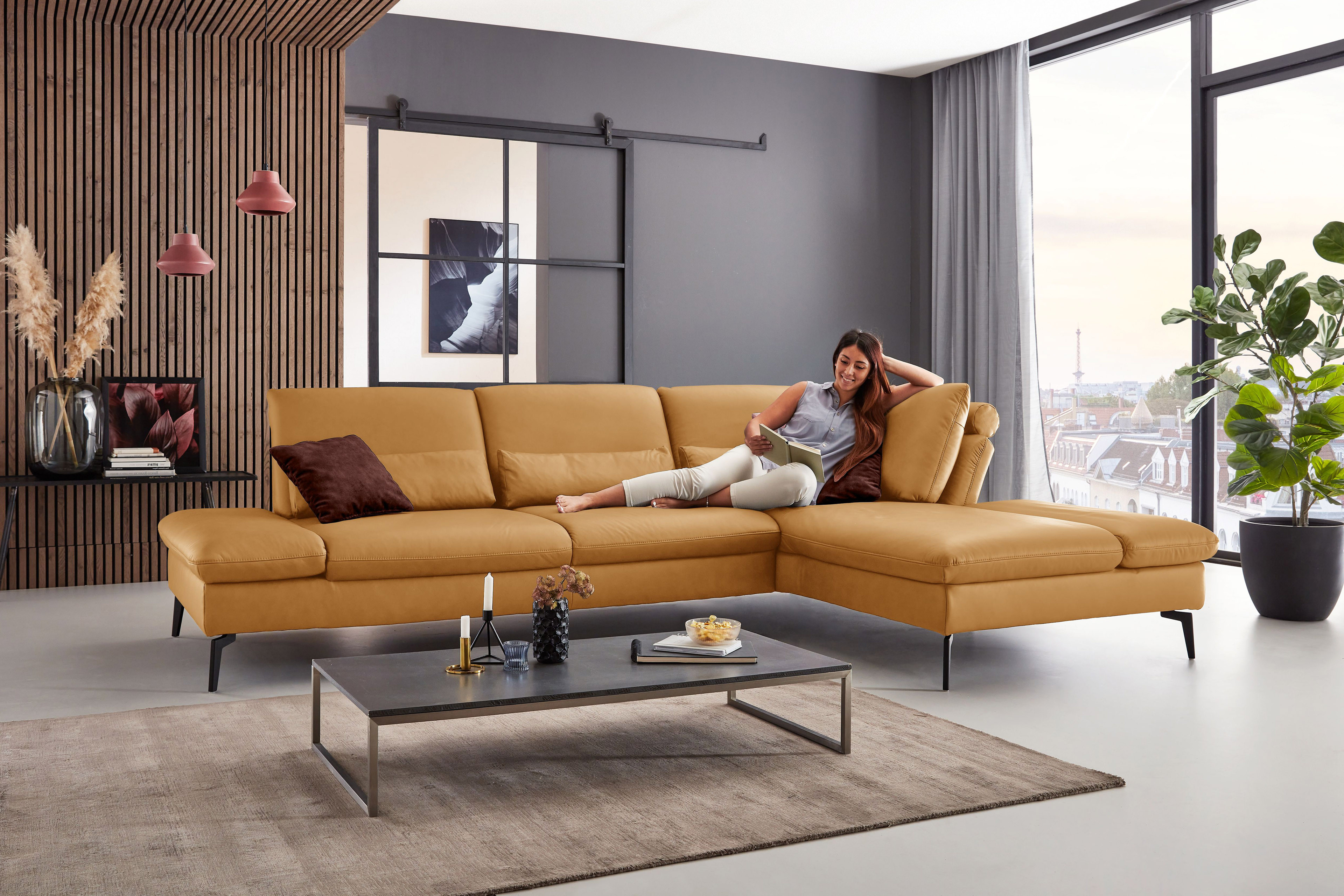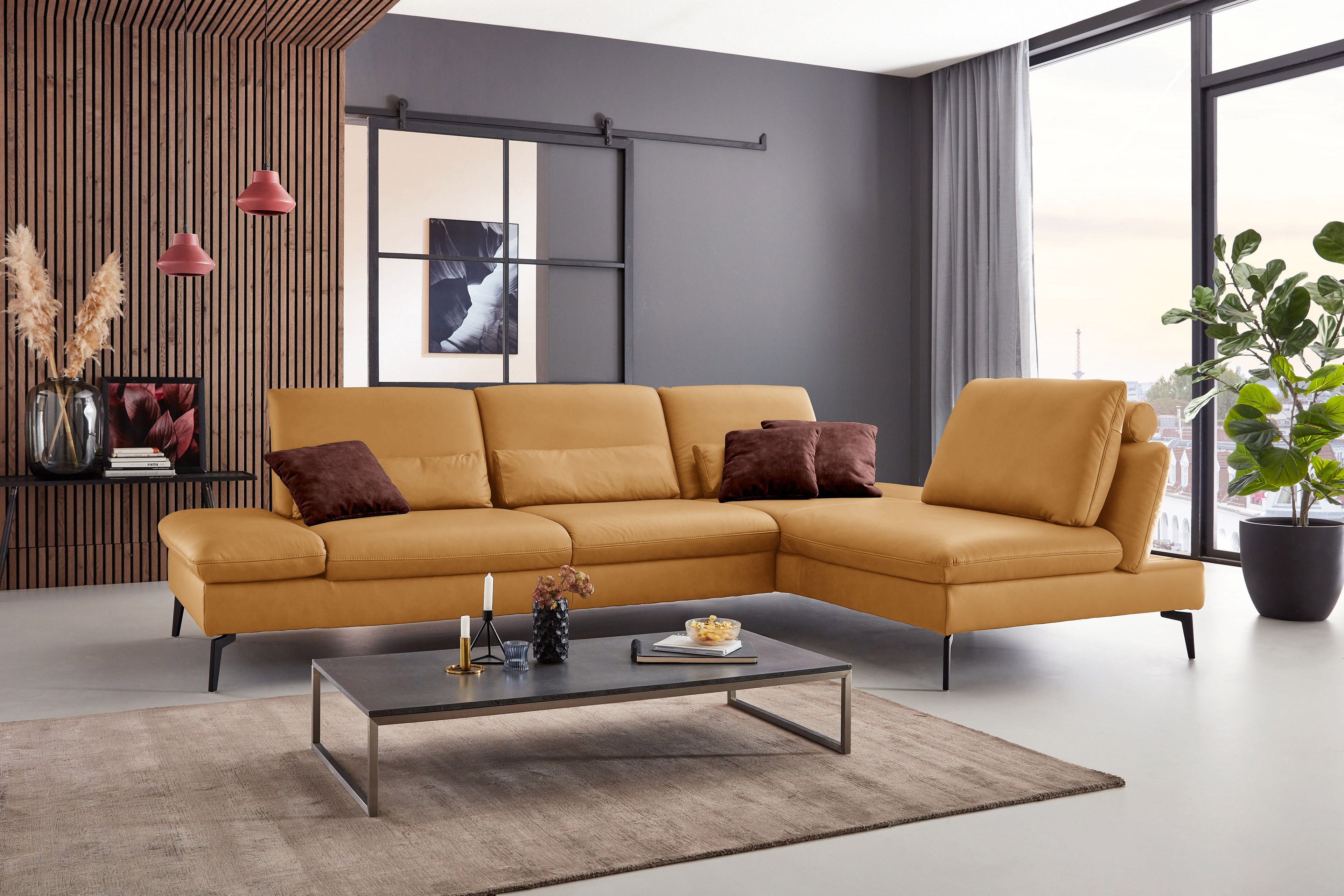 PN-IN23099 von Polinova - ein modernes, aber auch sehr elegantes Ecksofa, bestehend aus einem 3-Sitzer und einem Longchair mit doppelter Armlehne. Im hochwertigen Semianilinleder in der Farbe "kurkuma", welches sich nicht nur allein durch seine angenehm weiche Haptik und sein edles Erscheinungsbild auszeichnet, sondern bei dem auch natürliche Merkmale sowie Strukturen größtenteils erhalten bleiben, präsentiert sich die Eckgarnitur harmonisch und einladend im wunderschönen Design mit schlanken, schwarzen Metallfüßen. Diese geben der ca. 317 x 199 cm großen Polstergarnitur so viel Bodenfreiheit, dass sogar der Saugroboter problemlos unter dem Sofa seine Arbeit verrichten kann, lassen das Polstermöbel aber auch luftig-leicht und nicht zu schwer wirken. Doch nicht nur äußerlich stimmt einfach alles, auch was den Komfort angeht, kann sich das Modell absolut sehen lassen. Die beiden Seitenteile des Longchairs können modelltypisch mittels einer Rasterverstellung in verschiedene Positionen eingestellt werden, wobei das hintere Armteil komplett nach oben gestellt und zusammen mit dem optional erhältlichen Kissen mit Rolle eine gemütliche sowie kuschelige Ecke und das vordere Armteil, mit oder ohne Kissen mit Rolle, einen weiteren bequemen Sitzplatz schafft. Zudem besteht die Möglichkeit, die Garnitur mit einer Sitztiefenverstellung für eine weitere, verkürzte Sitztiefe und mit einer Armteilverstellung für den 3-Sitzer auszustatten, einen passenden Hocker, Kopfstützen, Nieren- sowie Zierkissen in gewünschter Anzahl hinzuzubuchen und aus zwei Sitzhöhen sowie zwei Polsterungen die für Sie passende zu wählen. Dieses Polstermöbel-Programm bietet in Sachen Flexibilität, Kombinations- sowie Bezugsvielfalt viel Gestaltungsfreiraum und ist in weiteren Zusammenstellungen sowie Farben mithilfe unseres Polsterplaners oder unserer Einrichtungs-Experten lieferbar - PN-IN23099 aus dem Hause Polinova.