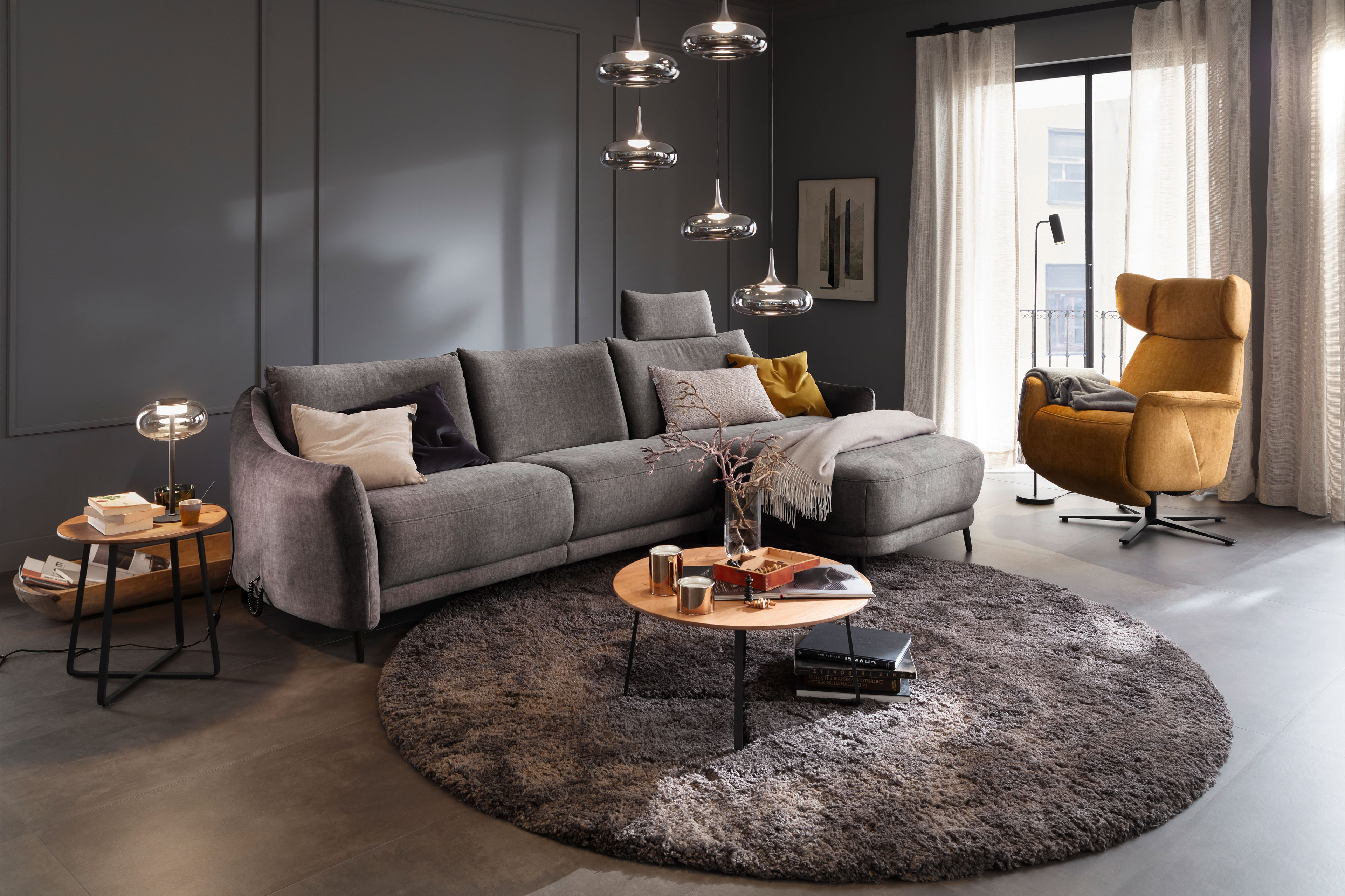 Ob für gesellige Familienabende oder entspannte Stunden zu zweit - mit dem Ecksofa Tabby von SCHÖNER WOHNEN holen Sie sich ein echtes Wohlfühlmöbelstück in Ihr Zuhause. Ob für große Familien oder für alle, die sich bei einem Filmabend gemütlich einkuscheln - dieses Sofa ist ein echter Allrounder und begeistert mit durchdachtem Design sowie behaglicher Ausstrahlung. Die großzügige Sitzfläche lädt dazu ein, sich niederzulassen, zu entspannen und das Leben zu genießen - fast so, als würde man auf Wolken sitzen. Die hochwertige Polsterung im Sitzbereich sorgt für langanhaltenden Komfort. Standardmäßig ist die Polstergarnitur mit einem bequemen PUR-Schaum ausgestattet, welcher optional in unseren Zusatzoptionen gegen eine Federkernpolsterung getauscht werden kann. Damit dieses Modell noch mehr auf Sie zugeschnitten ist, haben Sie sogar die Möglichkeit, aus zwei verschiedenen Sitzhöhen auszuwählen. Die edlen, schwarzen Metallrundfüße sorgen für einen stabilen Stand und setzen zeitgleich einen modernen Akzent in Kombination mit dem dunklen Microfaserbezug. Wer es individueller mag, kann aus weiteren Fußvarianten in unterschiedlichen Formen und Farben wählen. Ebenso beeindruckt das Modell Tabby mit einer großen Auswahl an Bezugsfarben und Materialien, damit dieses Sofa nicht nur zu Ihnen passt, sondern auch perfekt in Ihren Wohnbereich. Jetzt fehlt Ihnen noch das gewisse Etwas? Das SCHÖNER WOHNEN Sofa lässt sich auf Wunsch auch mit einer motorischen TV-Funktion, die für noch mehr Flexibilität und Entspannung sorgt, ausstatten. Mit seiner eleganten Präsenz, modernen Linienführungen und einer unvergesslich soften Haptik wird das Polstermöbelstück Tabby zum Herzstück Ihres Zuhauses.
