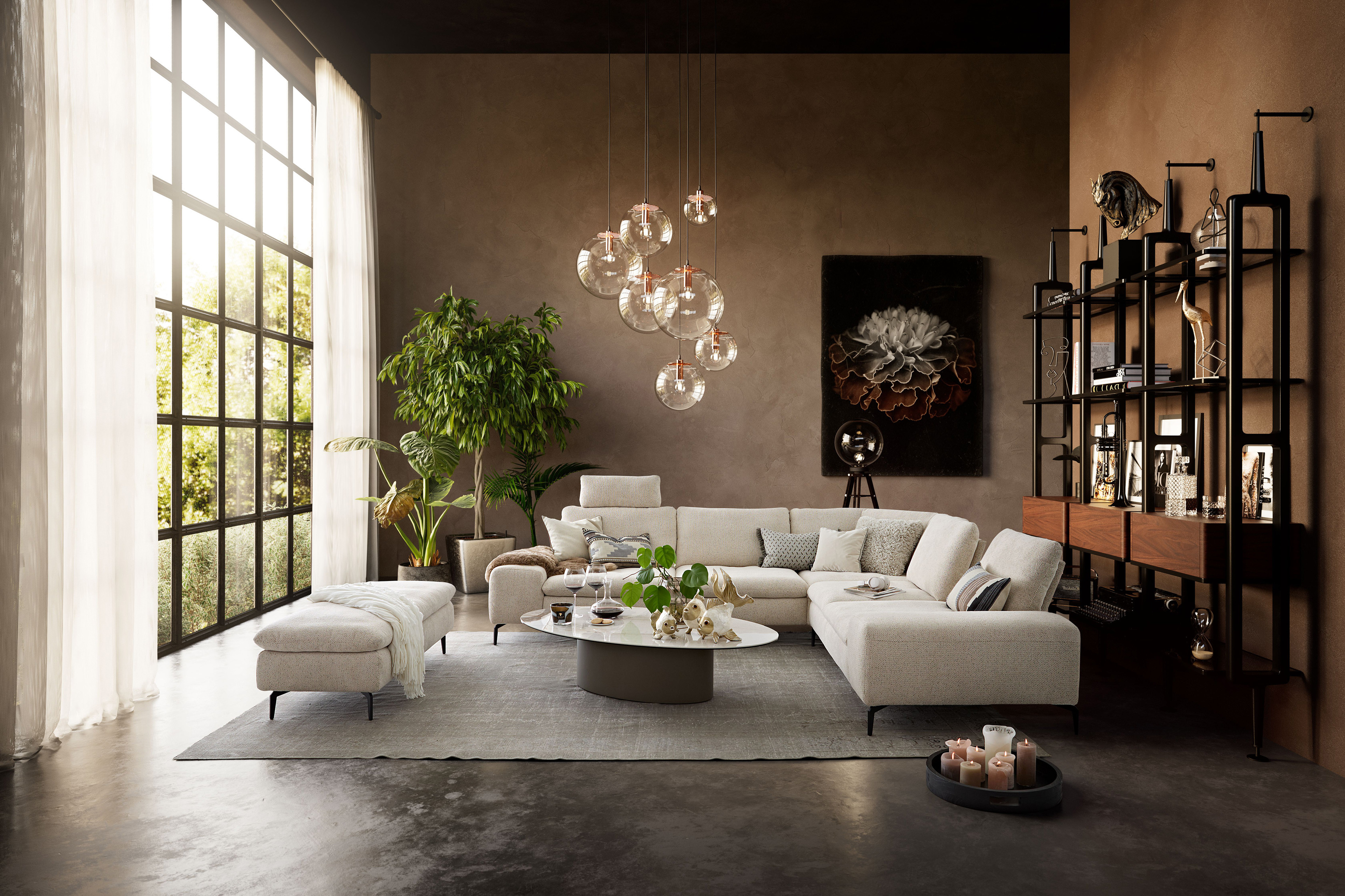 Im stilvollen Chenille-Flachgewebe-Bezug in Creme präsentiert sich 16540 Valentinoo aus dem Hause Willi Schillig in der ca. 318 x 298 cm großen Eckvariante und bietet mit dem stattlichen Stellmaß viel Platz für Sie sowie Ihre Liebsten, aber auch bei einer geselligen Runde mit Freunden hält das Modell ein gemütliches Plätzchen für jedermann parat. Die Kombination aus einem großen 2-Sitzer, einer Spitzecke und einem etwas kleineren 2-Sitzer lässt sich in der Ausführung links sowie spiegelverkehrt in der Ausführung rechts bestellen und mit unseren Zusatzoptionen zu einer wahren Wohlfühlinsel gestalten. Neben einer bereits integrierten Sitztiefenverstellung in den beiden 2-sitzigen Elementen, mit welcher sich der Rücken pro Sitz um einige Zentimeter nach hinten versetzen lässt, besteht für Sie die Möglichkeit, einen passenden Hocker sowie Kopfstützen in beliebiger Anzahl zu wählen. Ob nach einem stressigen Arbeitstag, in den freien Momenten am Wochenende oder einfach nur zwischendurch - mit hochgelegten Beinen lässt es sich herrlich entspannen und auch mal gern die Zeit vergessen. Für eine individuelle Gestaltung ganz nach Ihren Vorstellungen sowie Wünschen stellt der Hersteller einen Metallfuß in verschiedenen Ausführungen, welchen Sie ebenfalls über die Zusatzoptionen wählen können, eine Vielzahl schöner Stoff- und Lederqualitäten in den unterschiedlichsten Farben sowie weitere Elemente für andere Kombinationen zur Verfügung. Nutzen Sie unseren Polsterplaner oder kontaktieren Sie unsere freundlichen Einrichtungs-Experten, die Ihnen bei der Planung Ihrer neuen Polstergarnitur sehr gern behilflich sind. 16540 Valentinoo von Willi Schillig - hier kommen Genießer voll auf ihre Kosten.