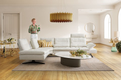 16741 Seventy5 von Willi Schillig - tolles Design, beste Qualität und unglaublich bequem. Die ca. 208 x 299 cm große Eckzusammenstellung, bestehend aus einem Ecksofa mit Seitenteil sowie einem 2-Sitzer, präsentiert sich in diesem Angebot in einem bezaubernden Flachgewebe im Farbton "ivory" mit schwarzen, perfekt geformten Metallkufen, welche der Polsterecke viel Bodenfreiheit verleihen und für eine sehr designorientierte, leichte Optik sorgen. Dadurch strahlt sie eine kraftvolle Präsenz aus, welche mit reichlich Persönlichkeit und Stil gepaart ist - ein Platz voller Behaglichkeit. Auf den ersten Blick begeistert die Polstergarnitur mit einem softig legeren Look, superbequemen Polstern aus einem ergo-PUR-Schaum plus einem hochwertigen Gemisch aus Polyesterfasern und Schaumstoffstäbchen im Sitz sowie im Rücken mit flexiblen Polstergurten, und zeigt auf den zweiten, was noch in ihr steckt sowie stecken kann. Eine bereits integrierte Sitztiefenverstellung für großzügige ca. 25 cm mehr Sitzfläche und mehrfach verstellbare Seitenteile, welche Sie direkt unter den Zusatzoptionen hinzubestellen können, geben Raum zur freien Gestaltung Ihres neuen Lieblingsplatzes und passen sich jedem Komfort-Bedürfnis perfekt an. Dazu erlauben zwei ebenfalls optionale Hocker in unterschiedlichen Größen, passende Kopfstützen mit Gelenk, die ganz einfach zwischen Korpusrücken und Rückenkissen eingeschoben werden, Nierenkissen, die perfekt die untere Rückenpartie stützen, und eine umfangreiche Bezugsauswahl mit vielen attraktiven Stoffen sowie Lederarten in wunderschönen Farben, aber auch weitere Elemente eine individuelle Planung ganz nach den persönlichen Wünschen - von verschiedenen Kombinationen mit Einzelelementen bis hin zu weiteren Eckvarianten ist alles möglich. 16741 Seventy5 aus dem Hause Willi Schillig - "Mehr als nur ein Möbelstück."