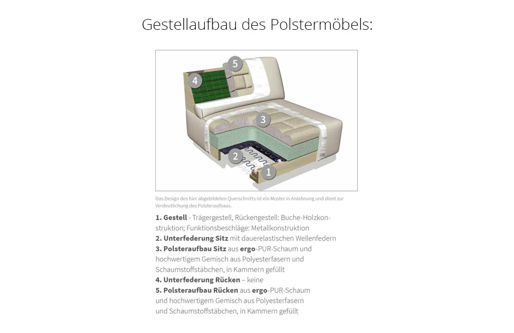 - Sitz: dauerelastische Wellenfedern, ergo-PUR-Schaum, hochwertiges Gemisch aus Polyesterfasern und Schaumstoffstäbchen