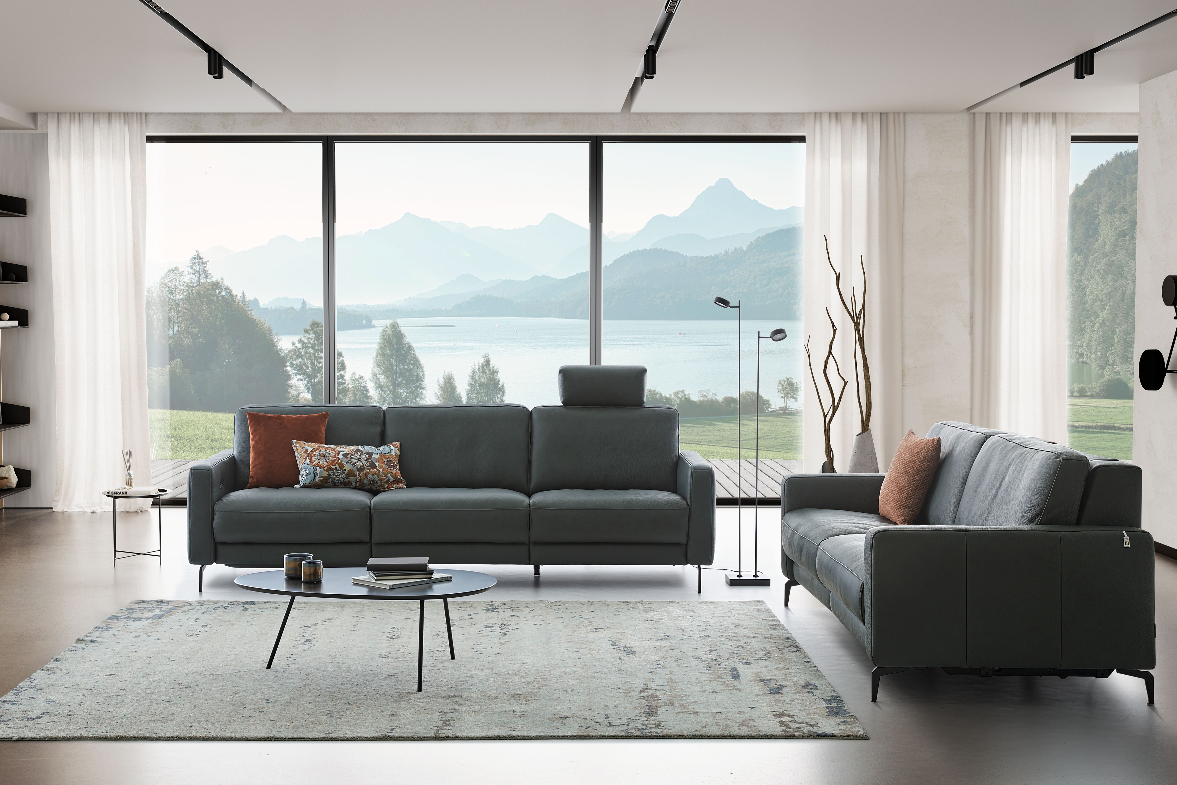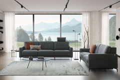 Wohlproportioniert, modern und ansprechend im Design, hervorgerufen durch die klare Linienführung, die enorme Bodenfreiheit sowie die dicken Polster, aber auch erstklassig im Komfort und mit einer hervorragenden Qualität - so zeichnet sich das Modell 36130 Louis, ebenso wie alle anderen Modelle des namhaften Herstellers Willi Schillig, aus. Als imposantes Duo, bestehend aus einem ca. 253 cm breiten 3-Sitzer sowie einem ca. 198 cm breiten 2-Sitzer, zeigt sich die Polstergruppe in einem dunkelgrauen Semianilinleder, getragen von grazil schwarzen Metallfüßen, und beeindruckt zudem mit einem herrlichen Sitzkomfort auf einer Polsterung mit einem ergo-PUR-Schaum plus einem hochwertigen Gemisch aus Polyesterfasern sowie Schaumstoffstäbchen im Sitz und Rücken. Dieser lässt sich in beiden Sofas mit der optionalen Wall-Free-Incliner-Funktion, bei welcher eine Kopfstütze bereits inklusive ist, noch um einiges steigern und absolut perfektionieren. Ausgestattet mit diesem Luxus-Feature schiebt sich per Knopfdruck der Sitz nach vorn oben, der Rücken senkt sich ab, eine Fußstütze klappt sich aus und Sie gelangen kinderleicht in eine supergemütliche Herz-Waage-Position. Hier liegen die Füße und Beine höher als das Herz, wodurch der Kopf besser durchblutet sowie das Herz entlastet werden kann und Sie noch entspannter relaxen können. Zudem haben Sie die Möglichkeit, die variabel einsteckbaren Kopfstützen mit Gelenk auch einzeln, in gewünschter Anzahl, bestellt werden. Natürlich können Sie die Willi Schillig Polstergarnitur auch in vielen weiteren Farben, von schlicht und zurückhaltend bis peppig und auffallend, sowie Stoff- und Lederbezügen, ohne oder mit farblich abgesetzter Kontrastnaht, bestellen. Schauen Sie einfach in die aktuelle Bezugskollektion unter dem Menüpunkt "Farbe ändern" und lassen Sie sich von dem fantastischen Angebot inspirieren. 36130 Louis aus dem Hause Willi Schillig - ein perfektes Polstermöbel für jedes Wohnzimmer, mit unserem Polsterplaner oder der Hilfe unserer Einrichtungs-Experten in weiteren Konfigurationen lieferbar.