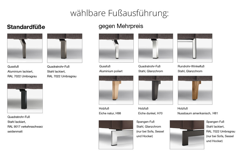 warentypisch. Dies ist kein Grund für eine Reklamation oder Beanstandung. Bei der Verarbeitung von Leder kann es zu zusätzlichen Teilungsnähten und teilweise auch anderen Nahtkonstruktionen kommen. Die Rückenkissen können gegen Mehrpreis in einem anderen Bezugsmaterial gewählt werden.