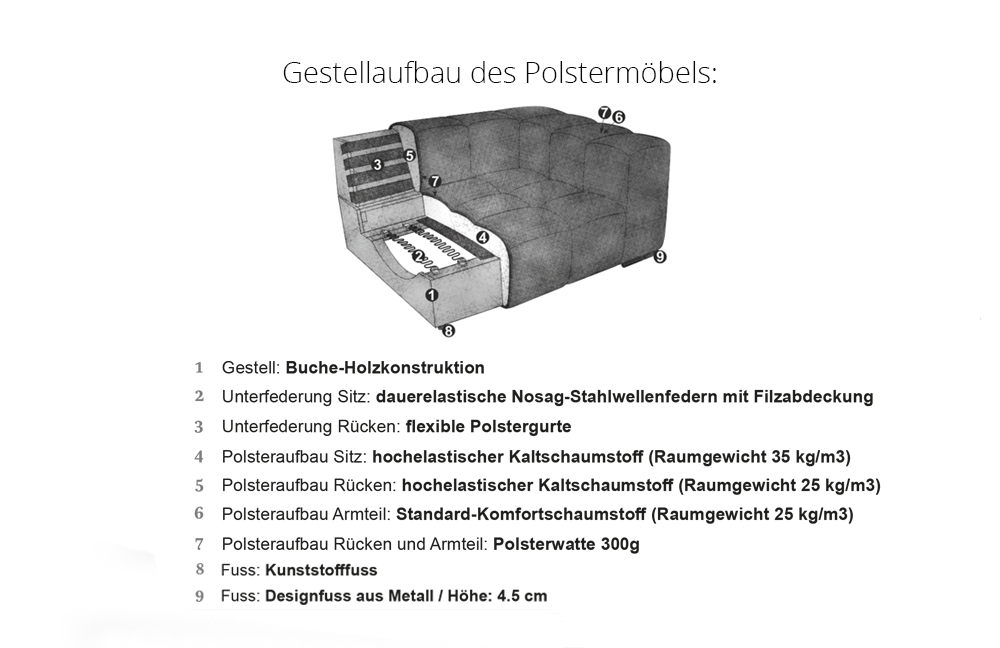 - Sitz: hochelastischer Kaltschaum, dauerelastische Nosag-Stahlwellenfedern