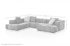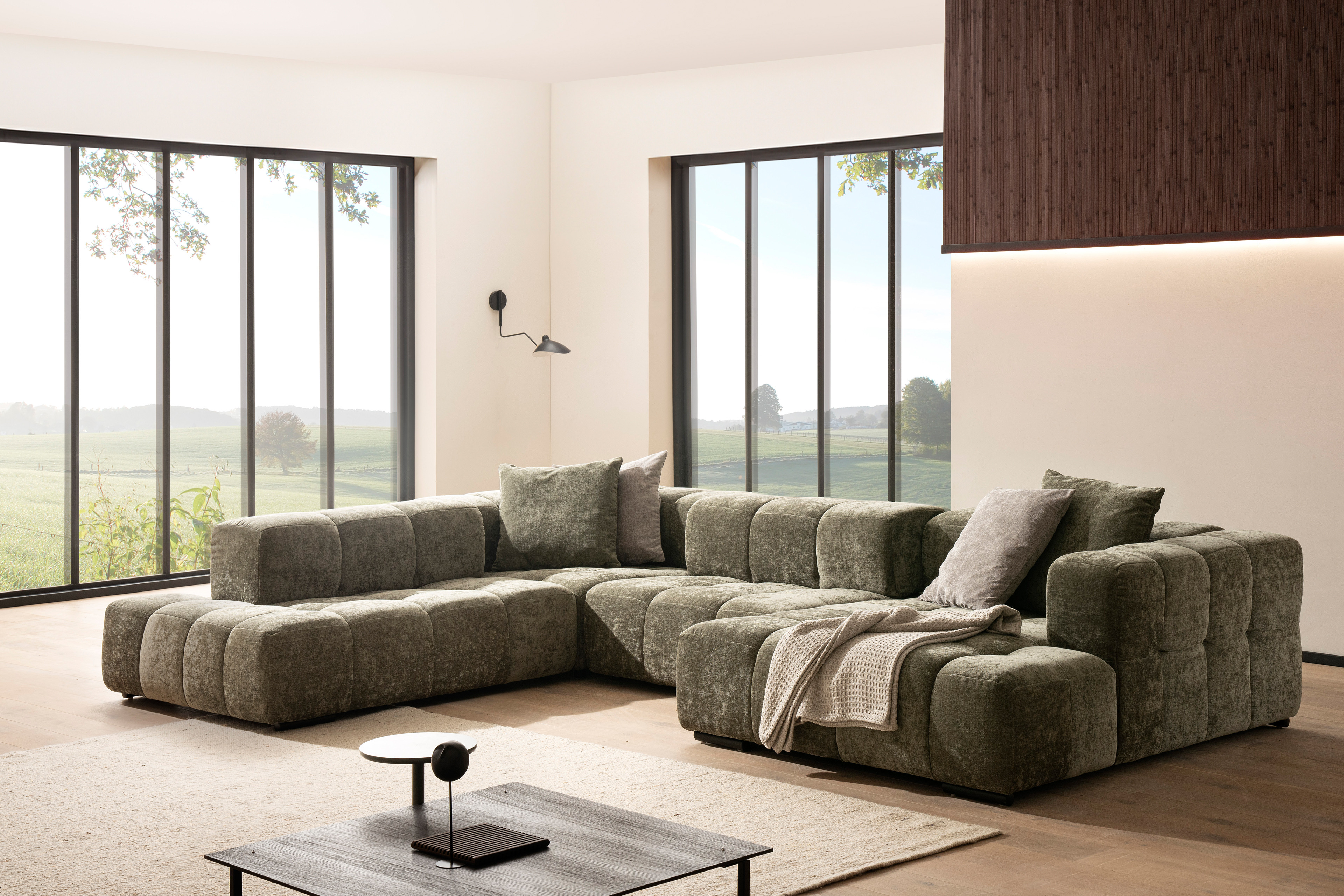 Diese großzügige Sofalandschaft ist ein echtes Highlight für weiträumige Wohnbereiche mit modernem Loft-Charakter. Das Modell Lucy-LE24 von designwerk bietet mit seiner beeindruckenden Stellfläche von ca. 255 x 349 x 169 cm erstklassigen Sitzkomfort. Die hochwertige Kaltschaumpolsterung sorgt für entspannte Fernsehabende, gemütliche Spieleabende oder einfach nur zum Abschalten nach einem langen Tag. Mit ihrem u-förmigen Design und dem strapazierfähigen Chenille-Flachgewebe, vorausgewählt im eleganten Grünton, fügt sich die Wohnlandschaft harmonisch in jeden Einrichtungsstil ein. Die wertige Verarbeitung und der angenehme Bezugsstoff machen das Sofa zu einem langlebigen Begleiter. Eine breite Bezugspalette mit wunderschönen Farbvariationen steht Ihnen unter der Rubrik "Farbe ändern" bereit. Suchen Sie sich also Ihren Favoriten mit nur wenigen Klicks ganz einfach selbst aus. Die Modell-Reihe ist variabel konfigurierbar - verschiedene Elemente können ganz nach Bedarf zusammengestellt werden. So lässt sich das Polstersofa perfekt an Ihre räumlichen Gegebenheiten und Ihren persönlichen Stil anpassen. Mit Lucy-LE24 von designwerk entscheiden Sie sich für eine Wohnlandschaft, die Design, Funktionalität sowie Wohngefühl auf höchstem Niveau vereint und Ihren Alltag mit jedem Sitzmoment ein Stück schöner macht.